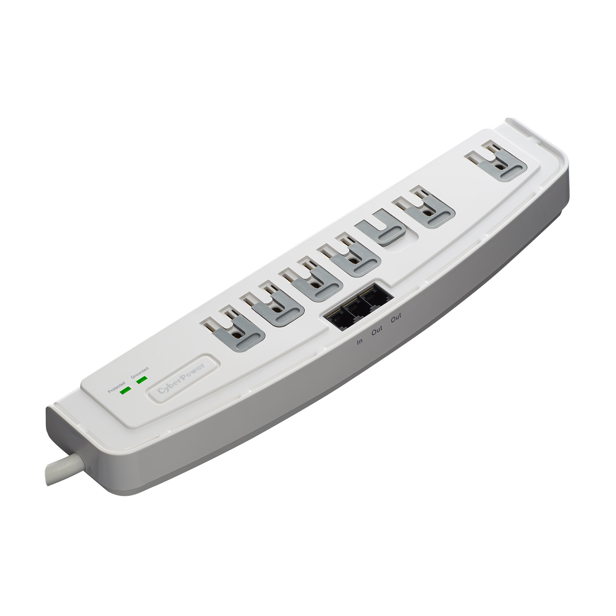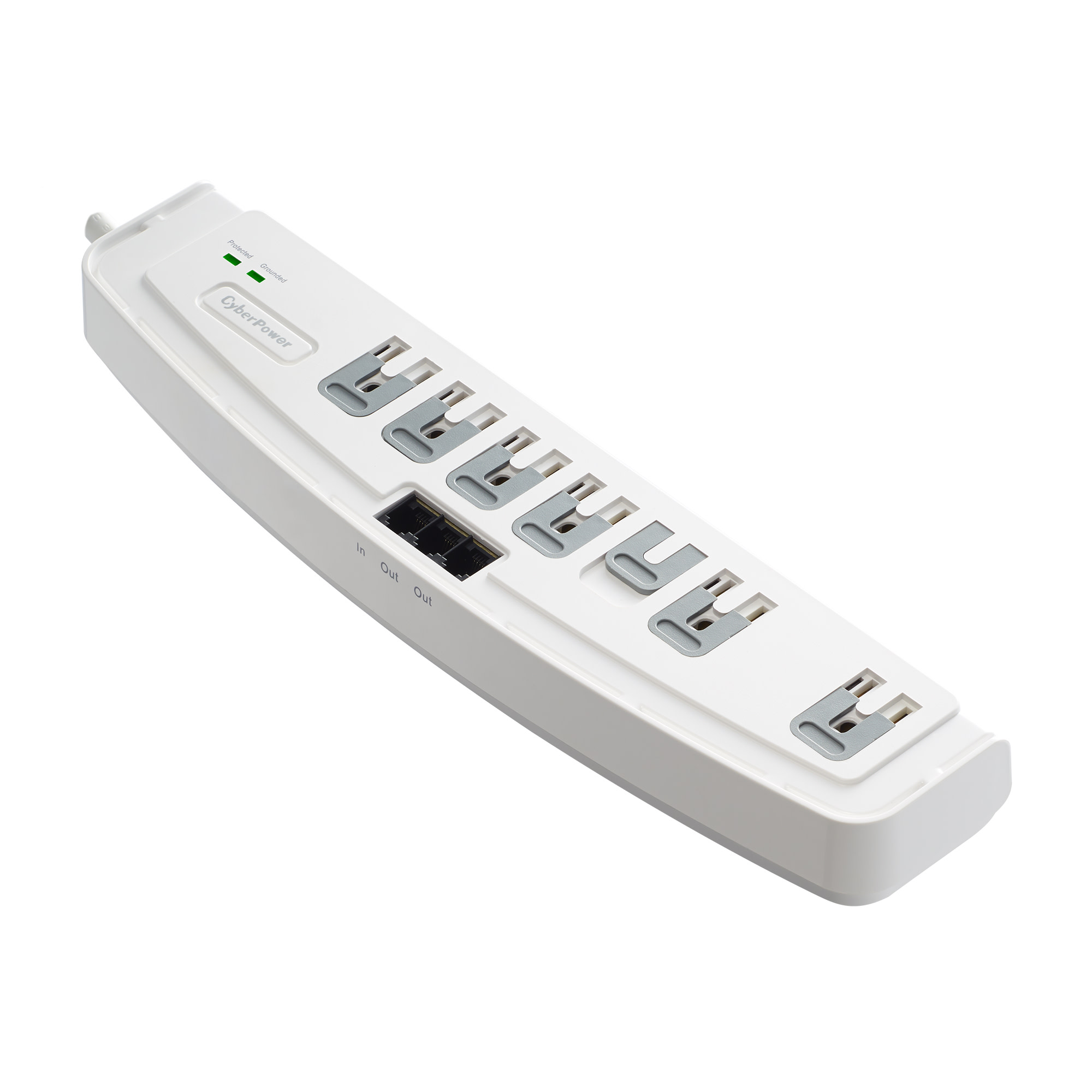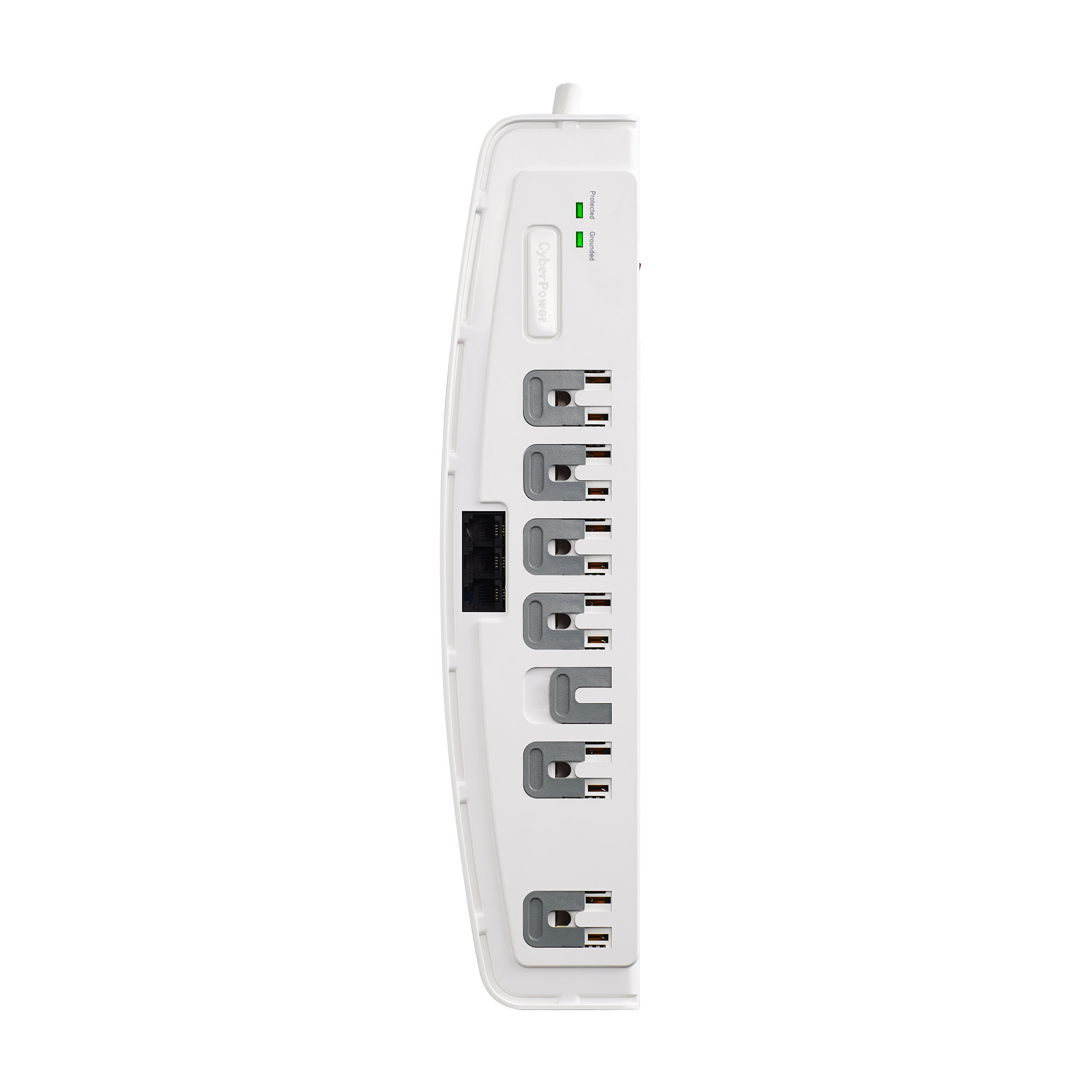 The CyberPower Home Office Surge Protector P704TRC1 aborbs spikes in energy caused by storms and electrical power surges, safeguarding valuable home office equipment such as laptops, small electronics, and chargers. The P704TRC1 provides 2250 joules of protection, 7 surge-protected outlets (6 standard and 1 widely spaced), and a 4-ft. power cord with a right-angle plug. It also has data line protection for phone/fax/modem (RJ11).