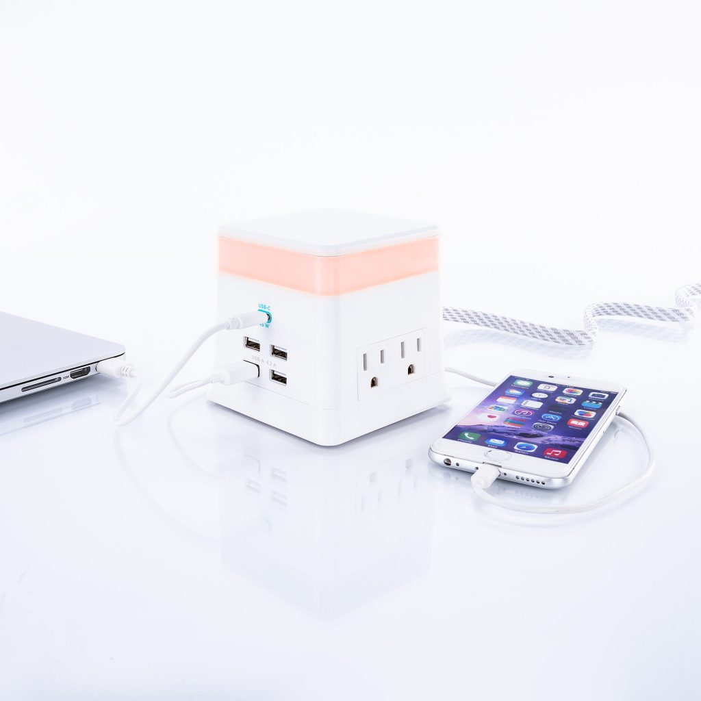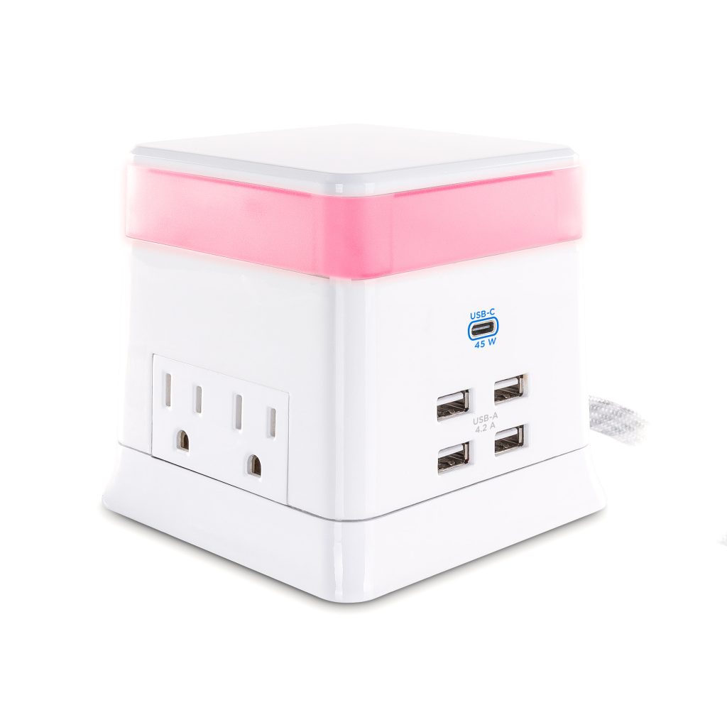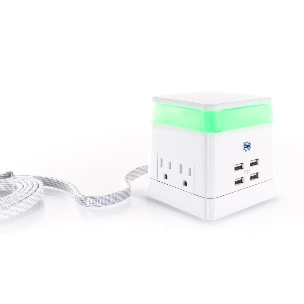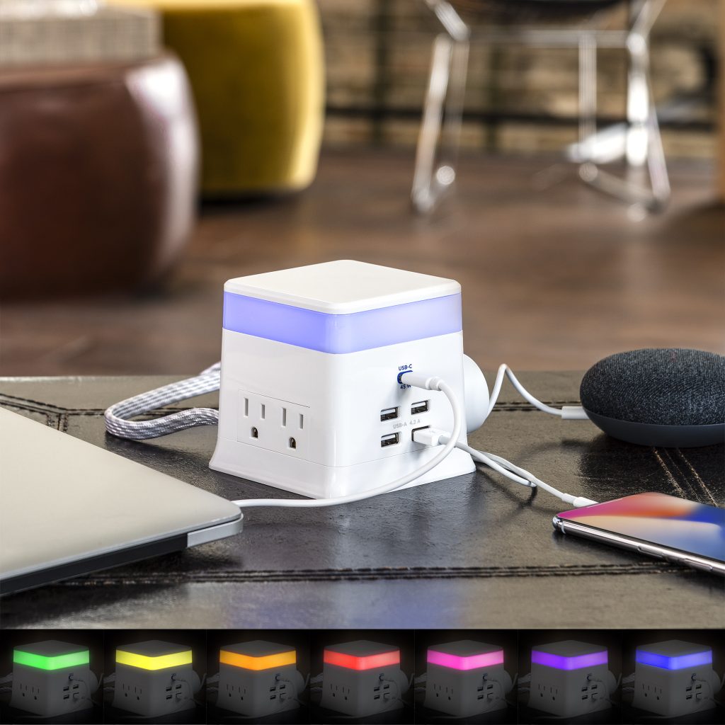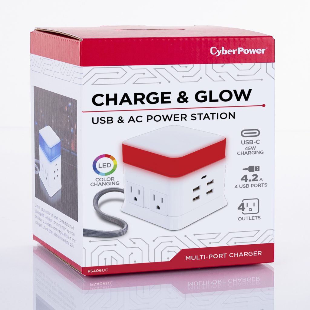 The CyberPower Charge & Glow USB & AC Power Station PS406UC satisfies your need for power, style, and versatility – all in one unit. It keeps a variety of lighted color options and power solutions within reach. The Charge & Glow features 4 AC power outlets, 4 USB-A charging ports, and 1 high-wattage USB-C charging port for large and small devices. Perfect for desk tops or table tops, any high-traffic area of the family home, the PS406UC meets the diverse power needs of today’s family. The multi-color modern glow top of the unit can switch on and off and change color to fit décor.