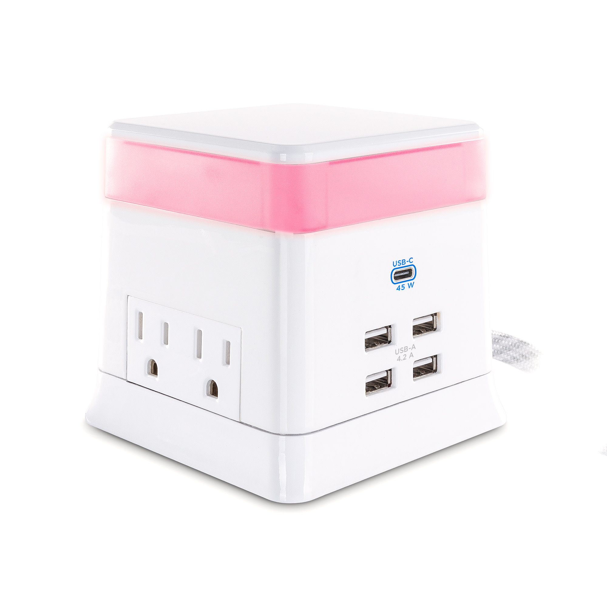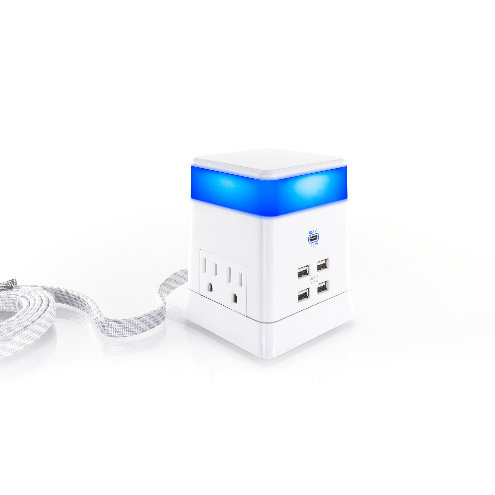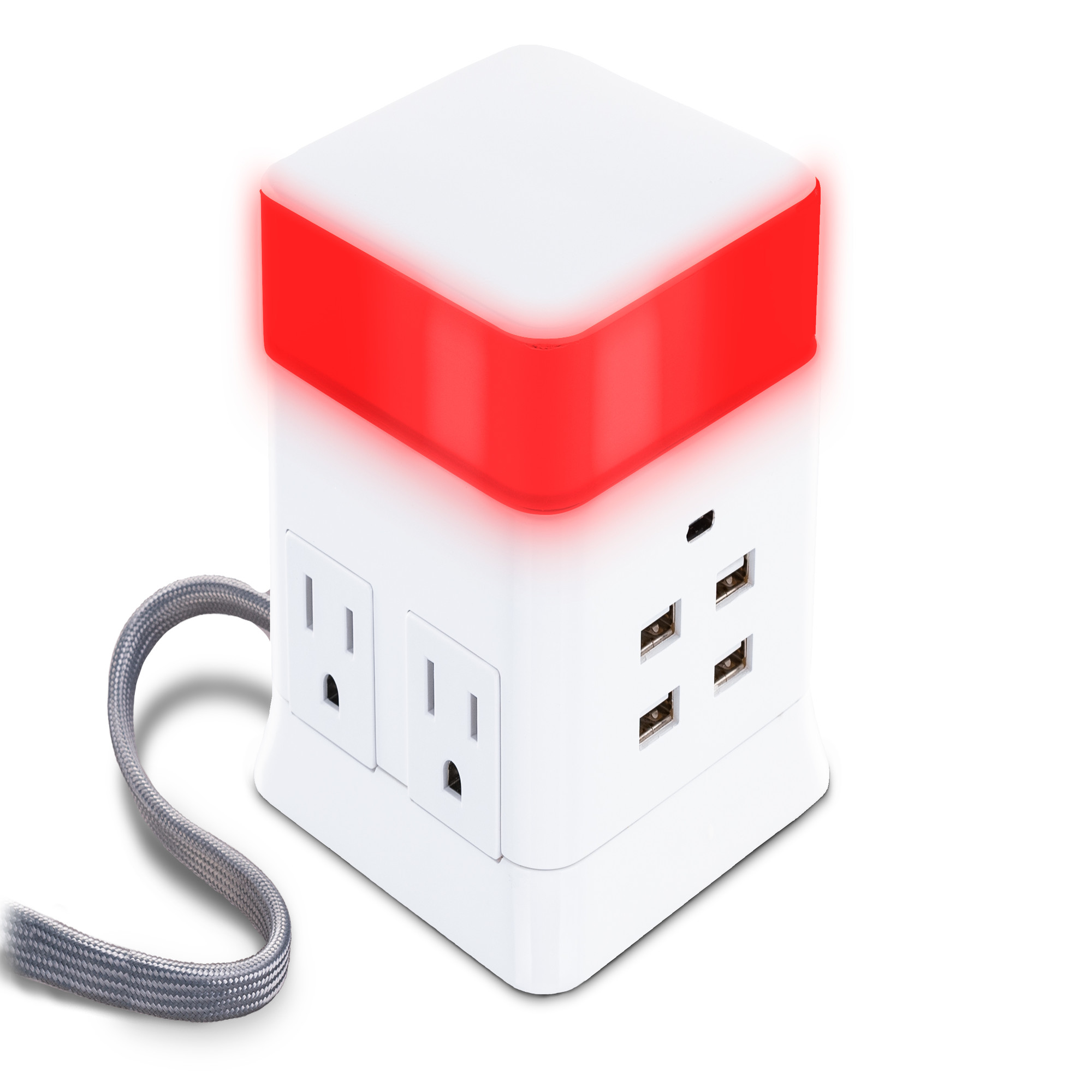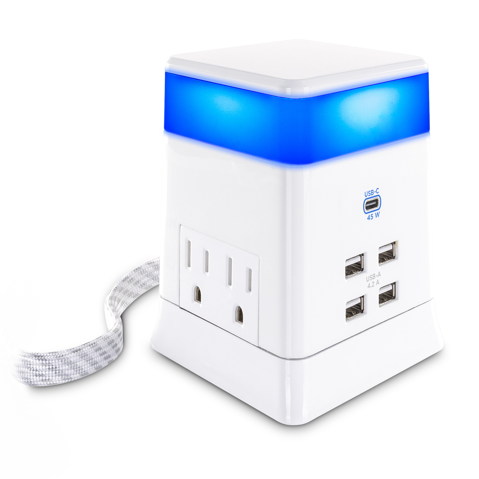 Four outlets provide ample room for transformer-sized plugs. Two outlets on each side keep cords organized while providing 400 Joules of surge protection. The stylish, braided cord stores easily when not in use. The low-profile, right-angle plug fits in tight places.