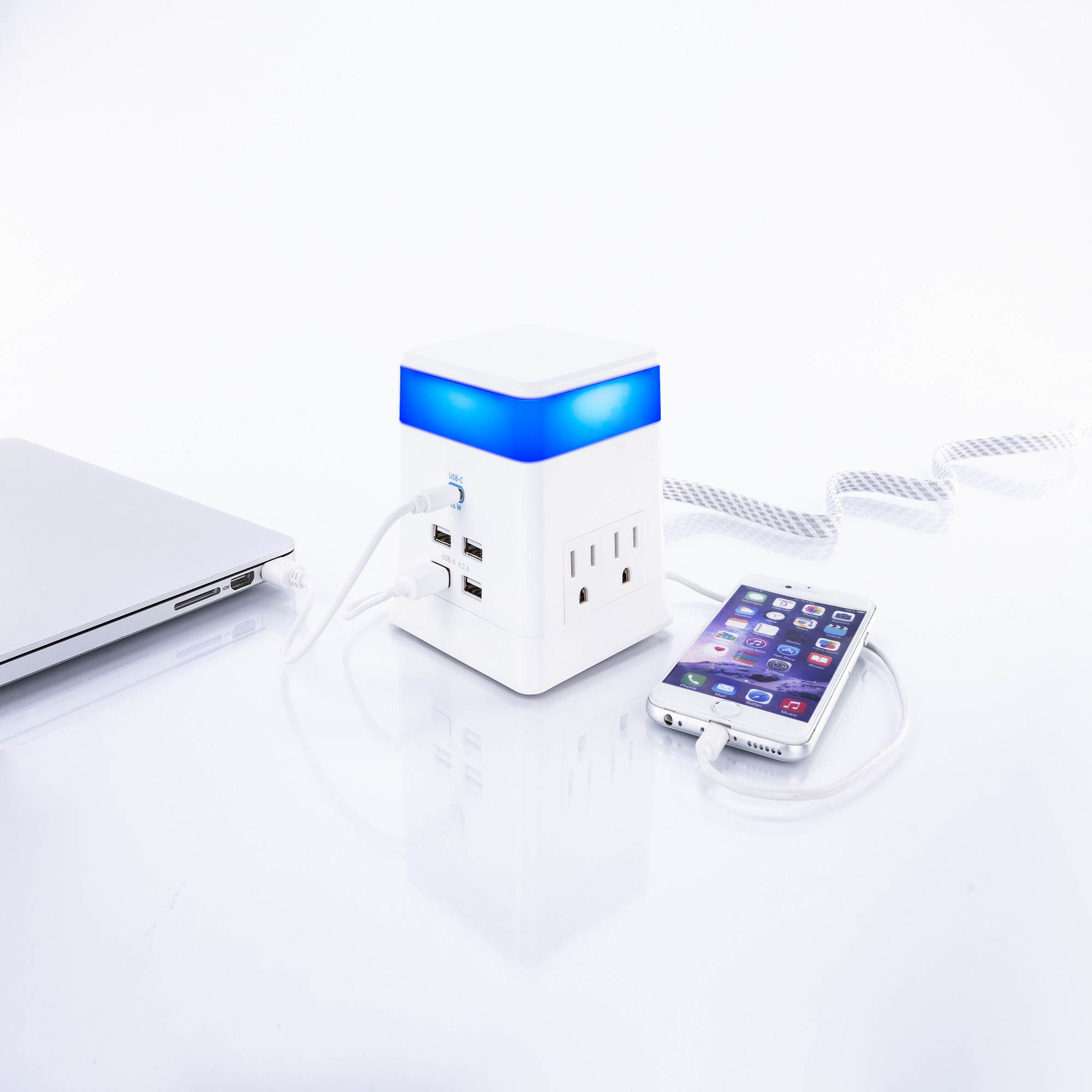 The USB-C port has more power for ultra-fast charging of small devices and charge larger devices like laptops. Plus it’s symmetrical, so cords can be inserted either way. - 4 USB-A Charging Ports