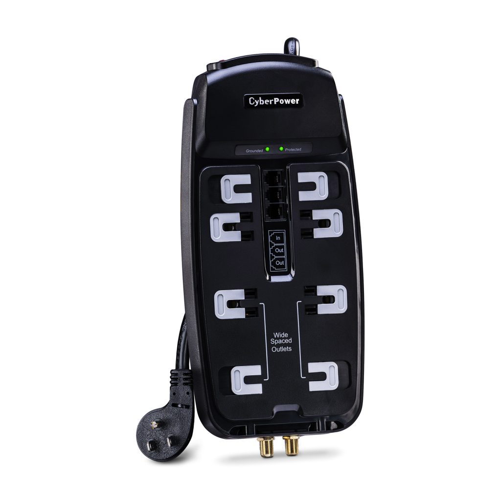 The Home Theater Surge Protector CSHT808TC provides 2850 joules of surge protection and 8 outlets to safeguard your home theater equipment from damage caused by electrical surges. Data line protection occurs with RJ11 ports for telecommunication devices such as phones, faxes, modems, and DSL lines. Gold-plated RG6 coaxial connectors protect cable/satellite TV receivers and broadband modems.