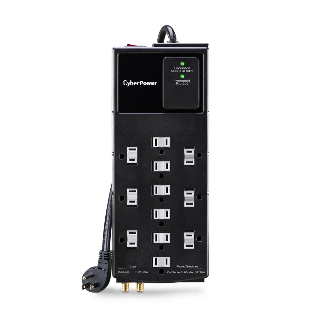 The Home Theater Surge Protector HT1210TC provides 4350 joules of surge protection and 12 outlets to safeguard your home theater equipment from damage caused by electrical surges. Data line protection occurs with RJ11 ports for telecommunication devices such as phones. Gold-plated RG6 coaxial connectors protect cable/satellite TV receivers and broadband modems.