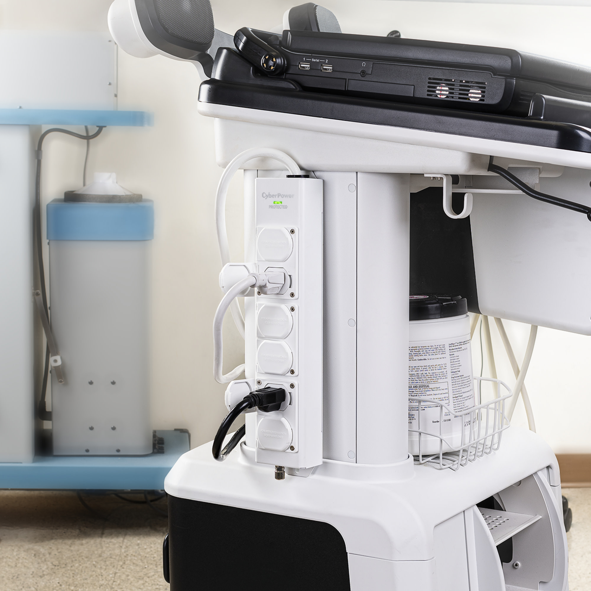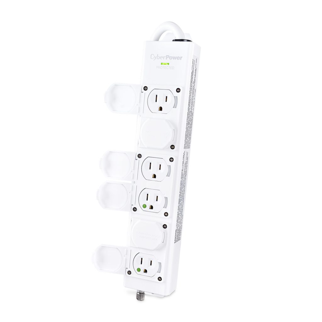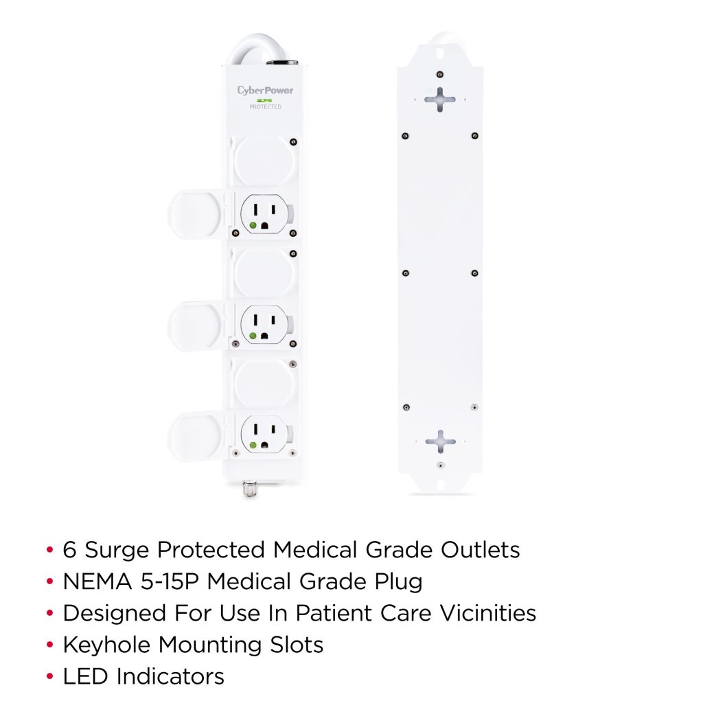 The CyberPower MPV615S Medical Grade Surge Protector delivers vital surge protection for use in hospitals, clinics, group practices, private practices, laboratory or other medical facilities, allowed for use within six feet of a patient for non-critical care applications. The surge protection prevents spikes in energy caused by storms and electrical power surges from reaching sensitive medical equipment in hospitals and healthcare facilities. Designed for use in patient care vicinities, the MPV615S is UL2930 listed. The MPV615S provides 1560 joules of protection, has 6 medical grade outlets with safety covers, a 15 foot 12AWG power cord, and a heavy duty medical grade plug.