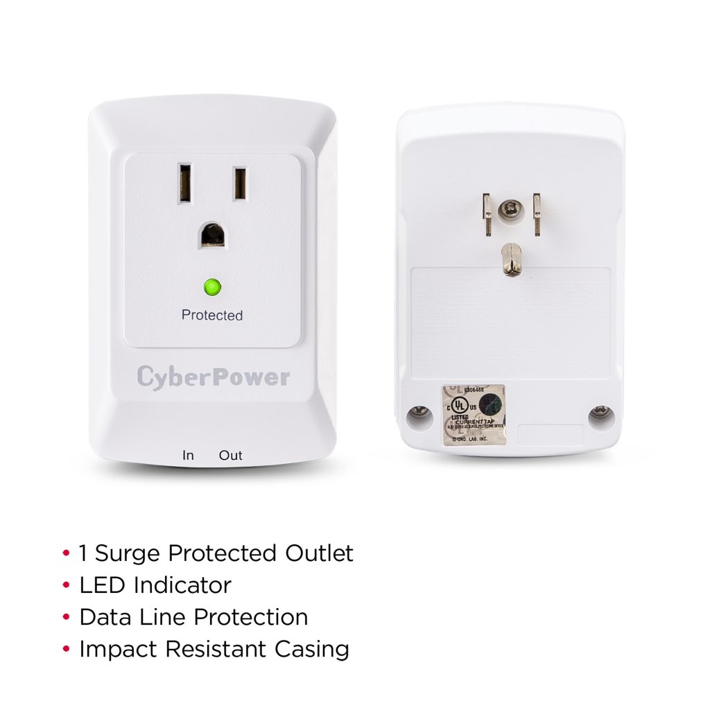 The Professional Surge Protector CSP100TW from CyberPower offers vital surge suppression for common home and office devices such as personal computers and electronics. It prevents spikes in energy caused by storms and electrical power surges and is ideal for safeguarding personal computers, wireless/VoIP routers, cable/DSL modems, and other consumer electronics (including chargers). The CSP100TW provides 900 joules of protection, a surge-protected outlet (widely spaced for transformer plug), and a wall tap plug. Data line protection occurs with RJ11 ports for telecommunication devices (phones, faxes, modems, and DSL lines).