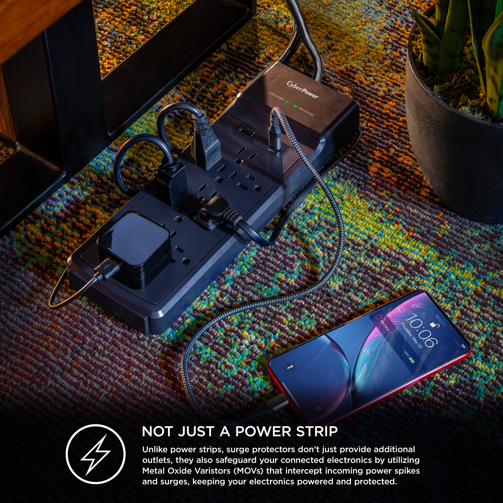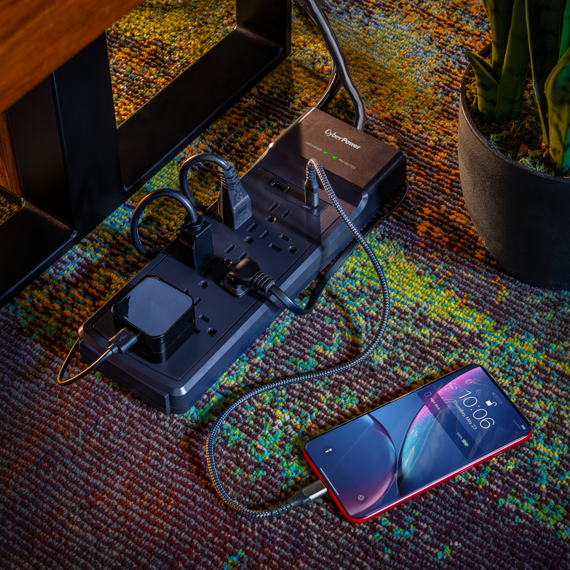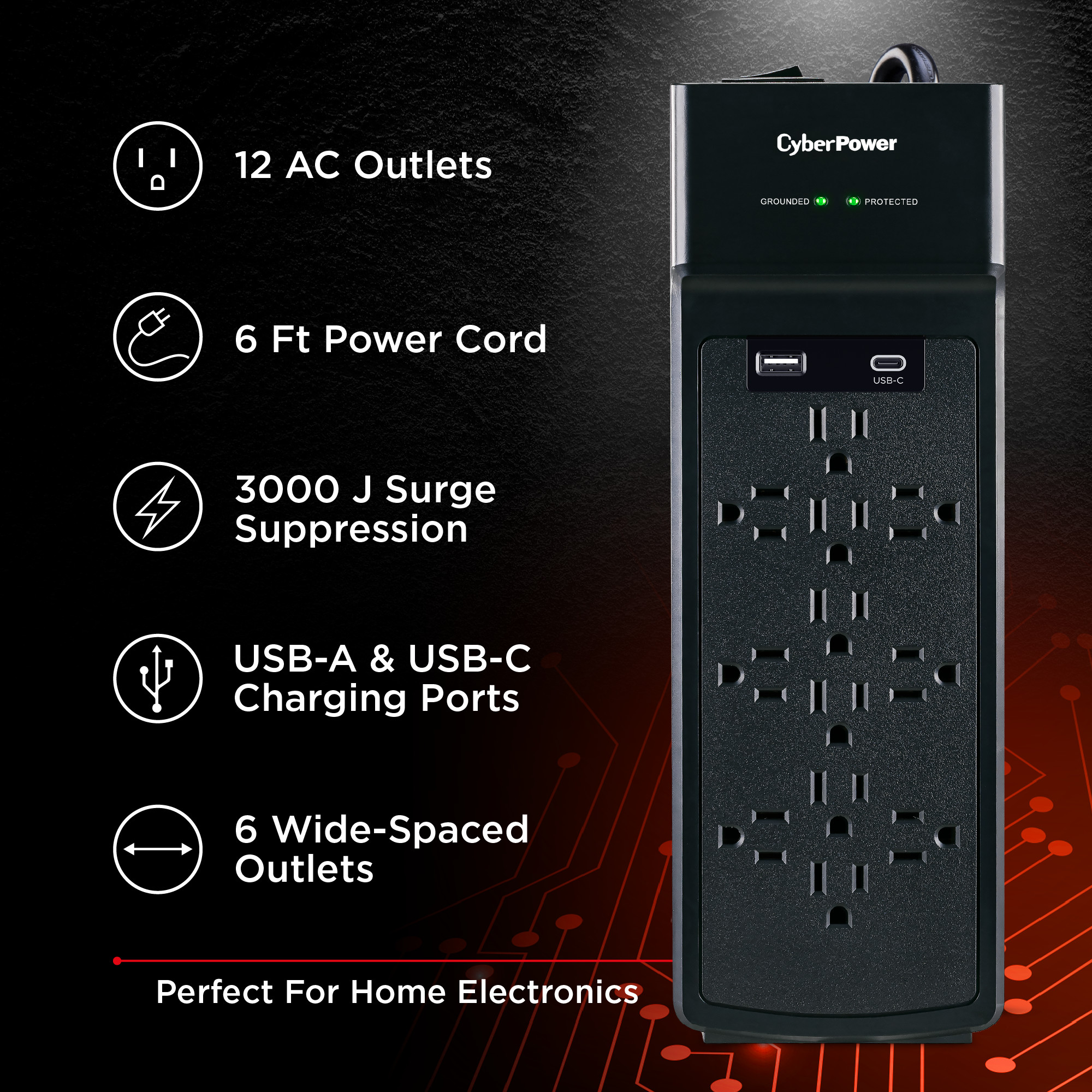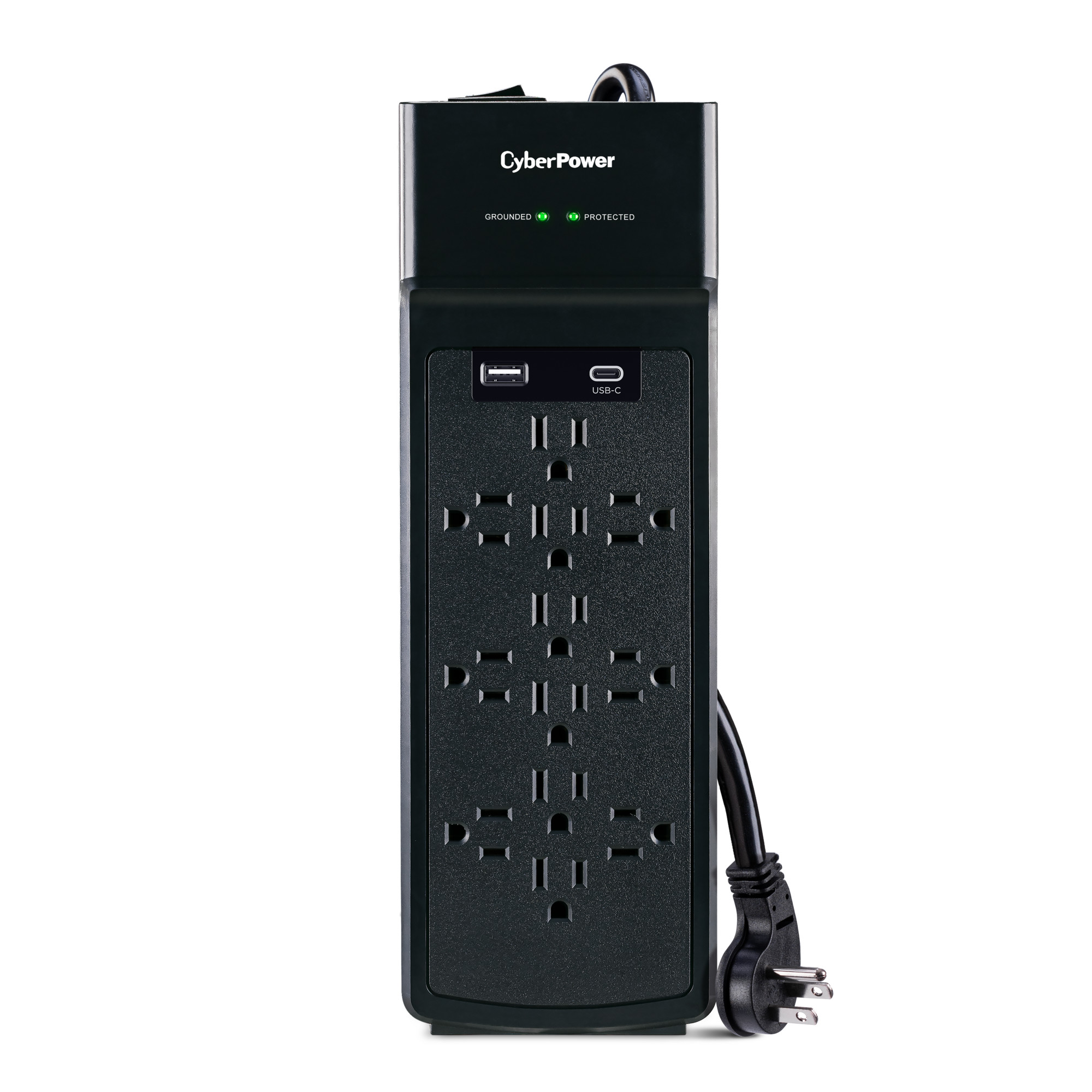 The CyberPower CSP1206UC Surge Protector provides essential surge protection for home and office electronics, including computers and other sensitive devices. Engineered to defend against power surges and energy spikes resulting from storms and electrical fluctuations, it offers 3000 joules of protection across twelve outlets. A durable 6-foot power cord ensures flexible placement, while the inclusion of one USB-A port and one USB-C port enables convenient charging of smartphones, tablets, and other mobile devices without occupying the primary outlets.