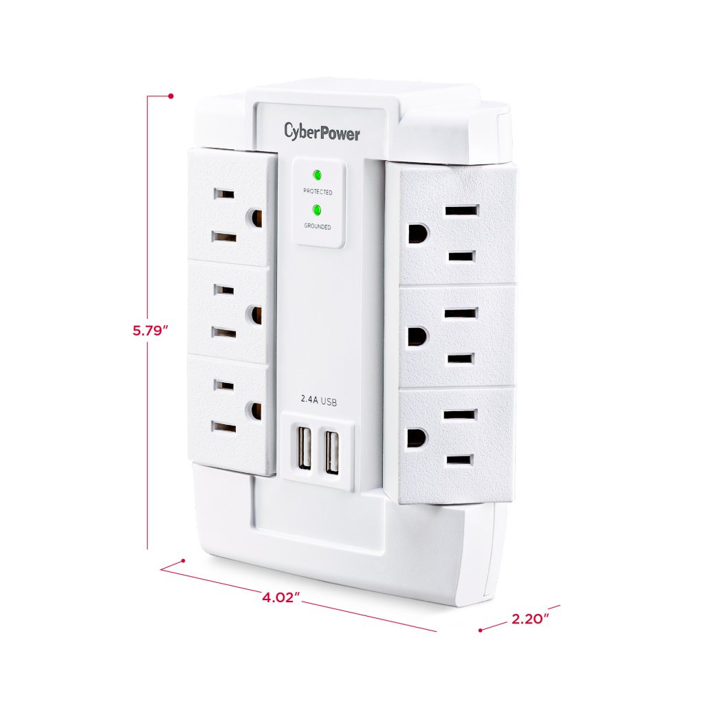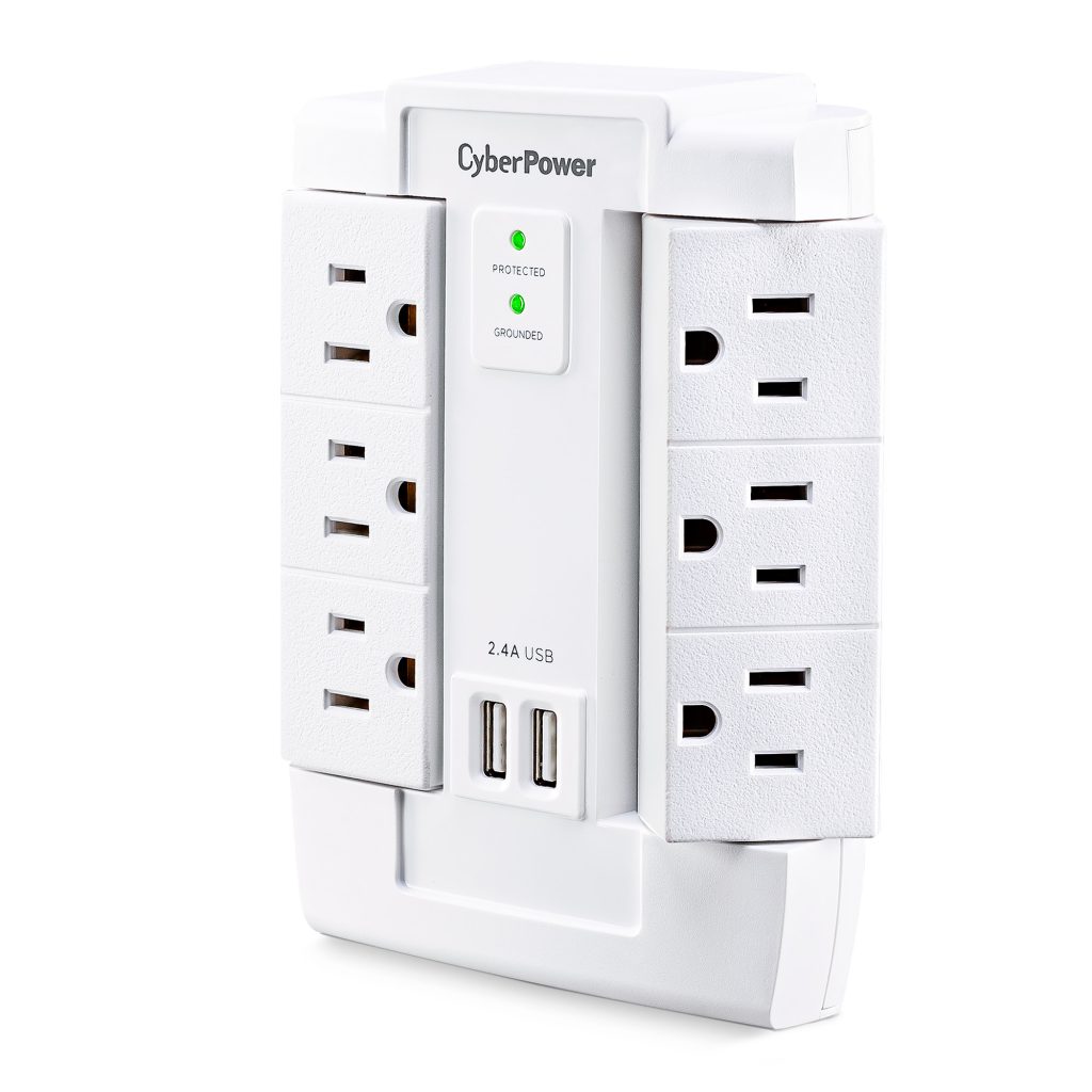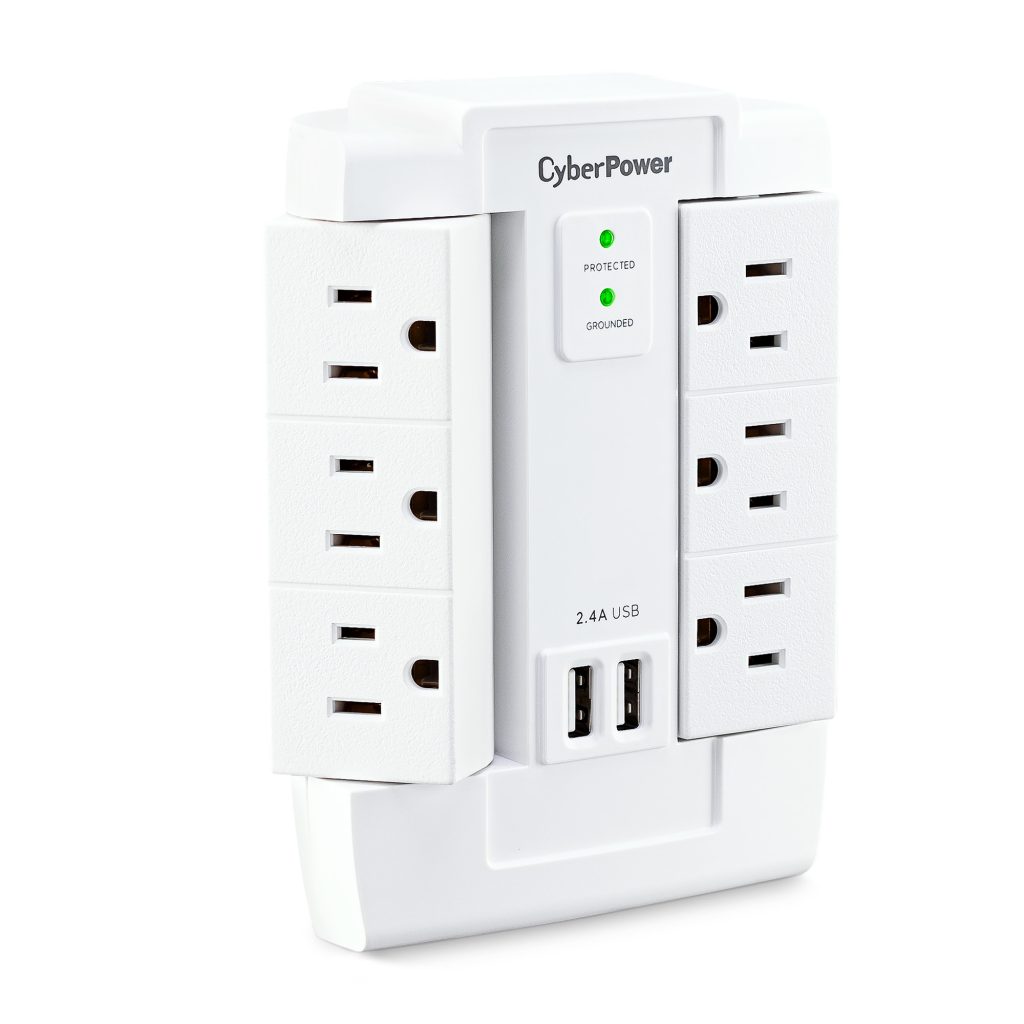 The CyberPower Professional Series CSP600WSURC2 Surge Protector is ideal for Home/Office protection with 1500 joules, 6 swivel outlets, 2 USB charge ports (2.4 Amps shared), and a convenient wall tap design. The surge protector is ideal for protecting personal computers, phones/fax/modems, printers, stereos, and other electronics. Its two USB are perfect for keeping tablets, smart phones, and other rechargeable electronics ready to use.