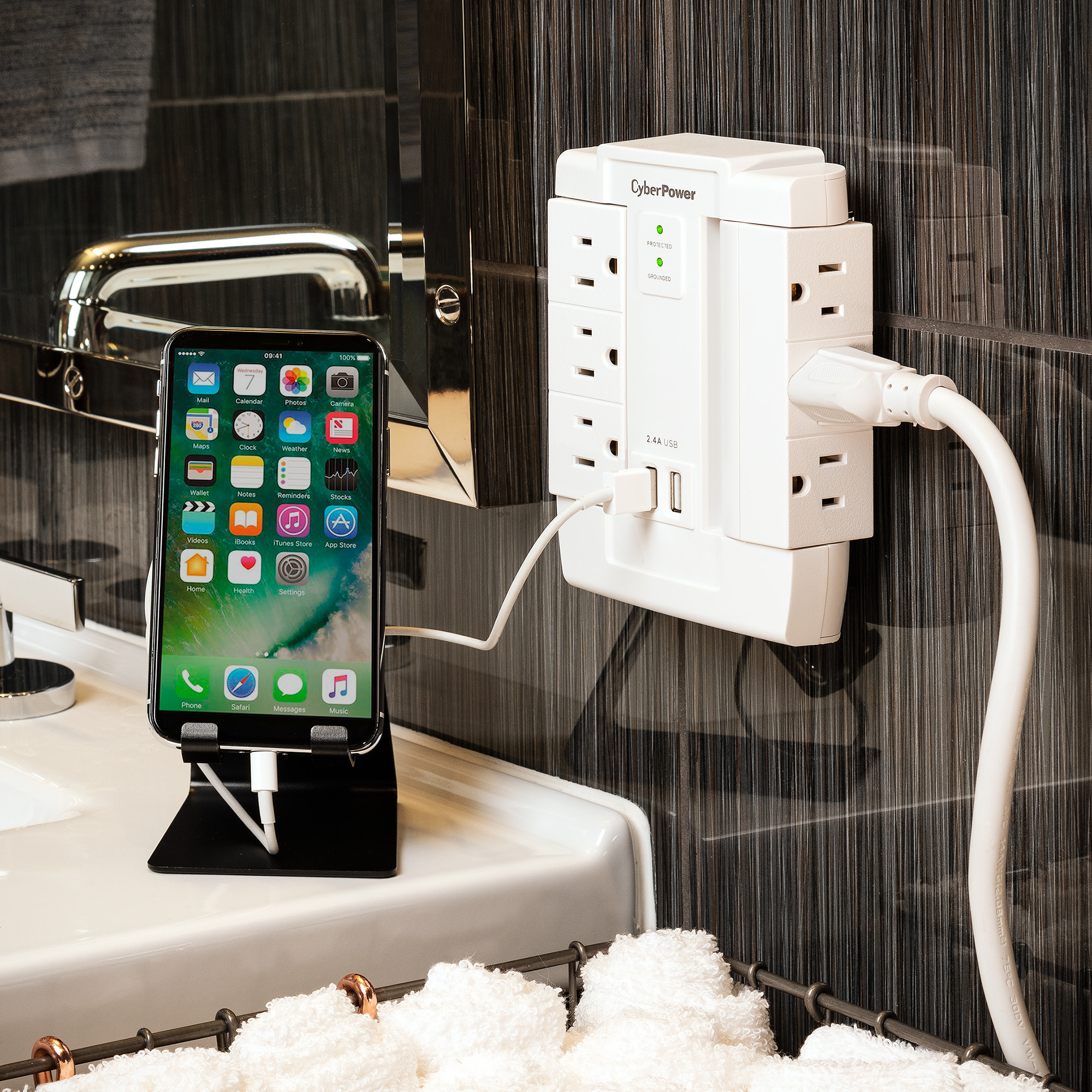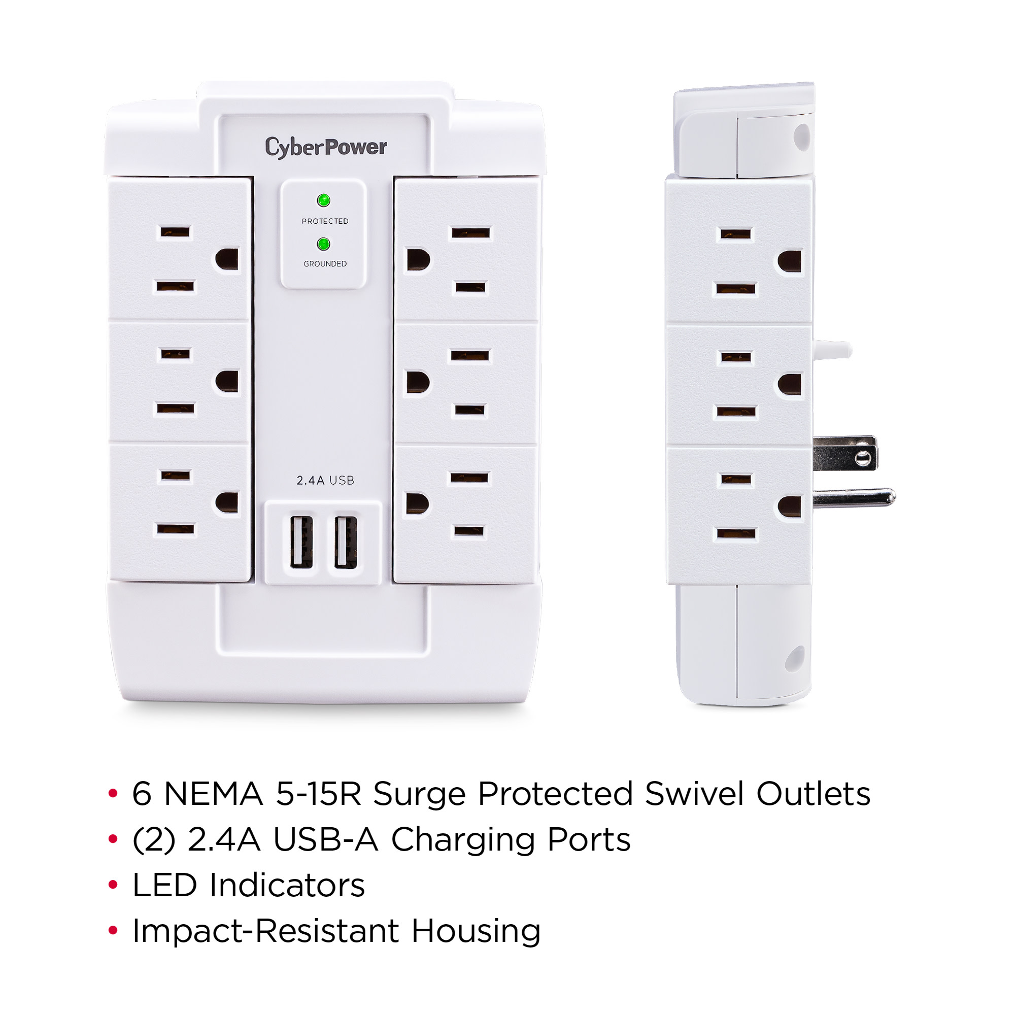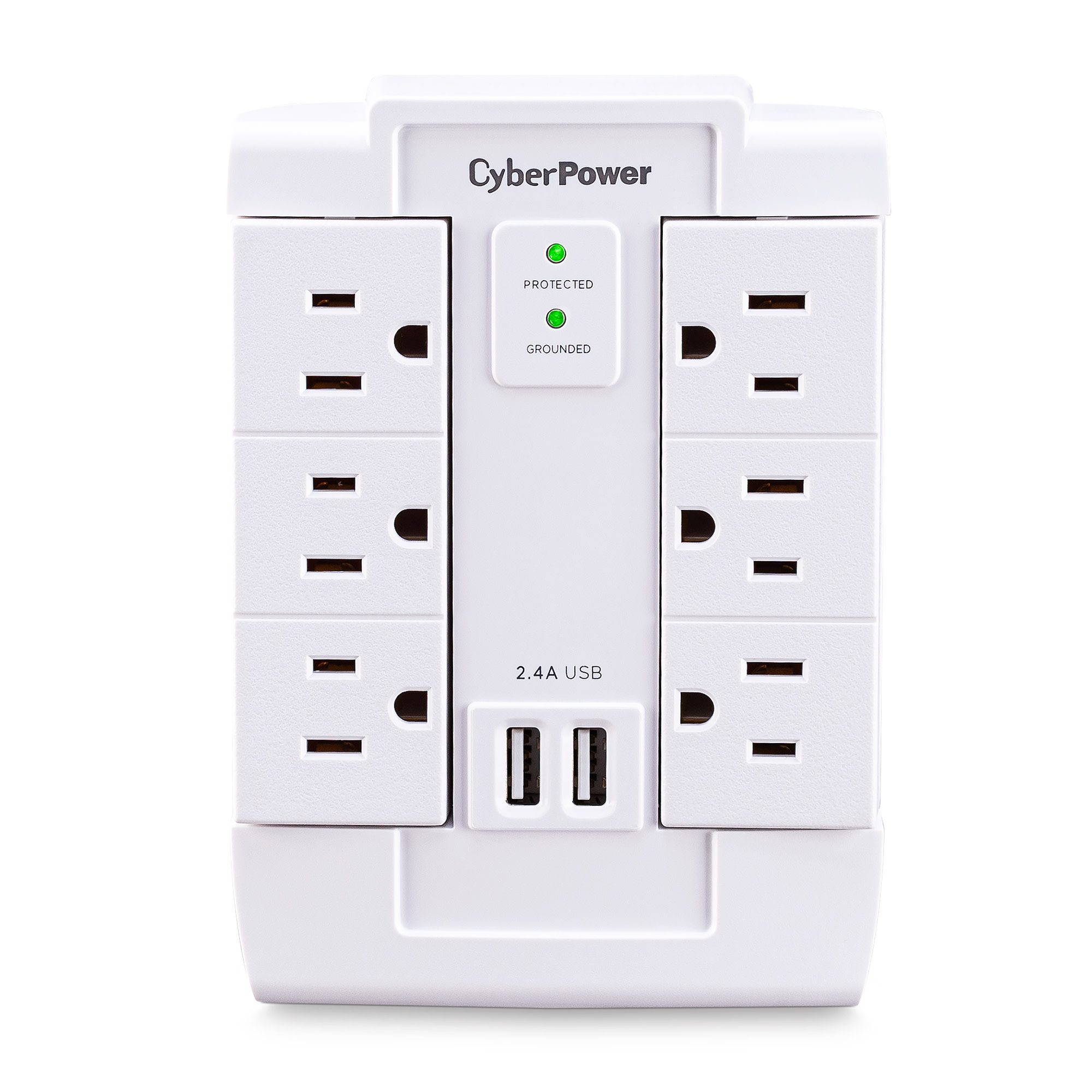 The CyberPower Professional Series CSP600WSURC2 Surge Protector is ideal for Home/Office protection with 1500 joules, 6 swivel outlets, 2 USB charge ports (2.4 Amps shared), and a convenient wall tap design. The surge protector is ideal for protecting personal computers, phones/fax/modems, printers, stereos, and other electronics. Its two USB are perfect for keeping tablets, smart phones, and other rechargeable electronics ready to use.