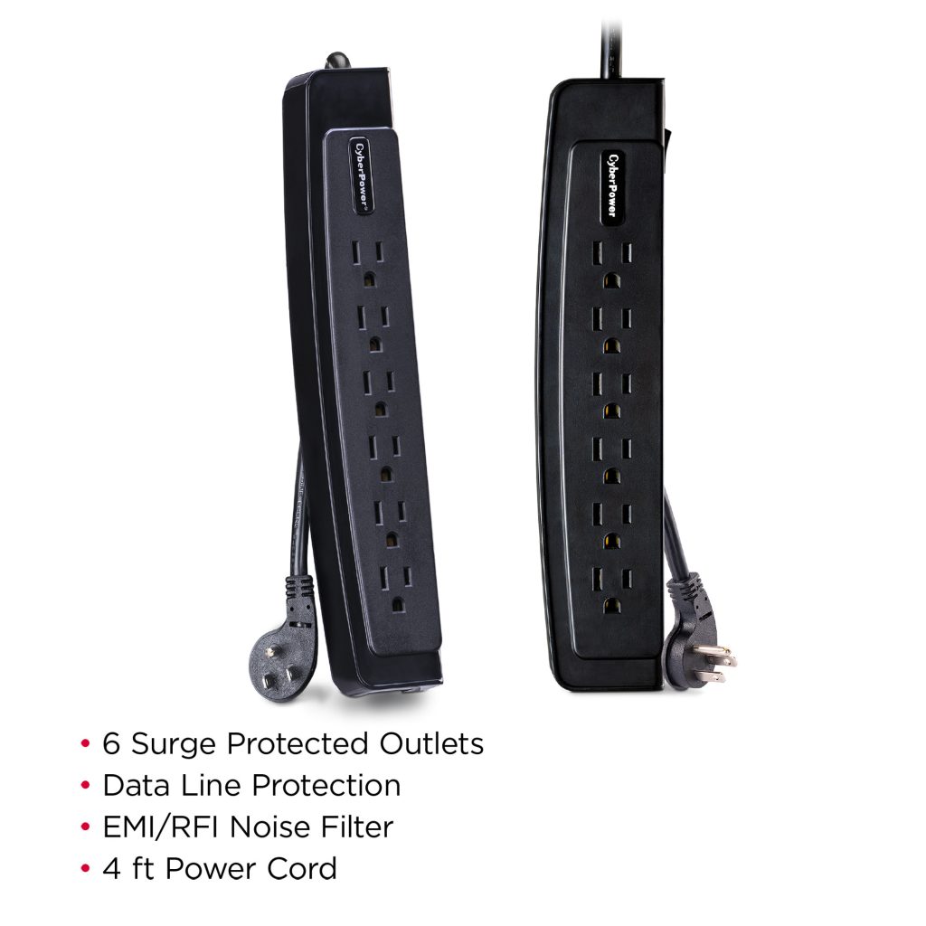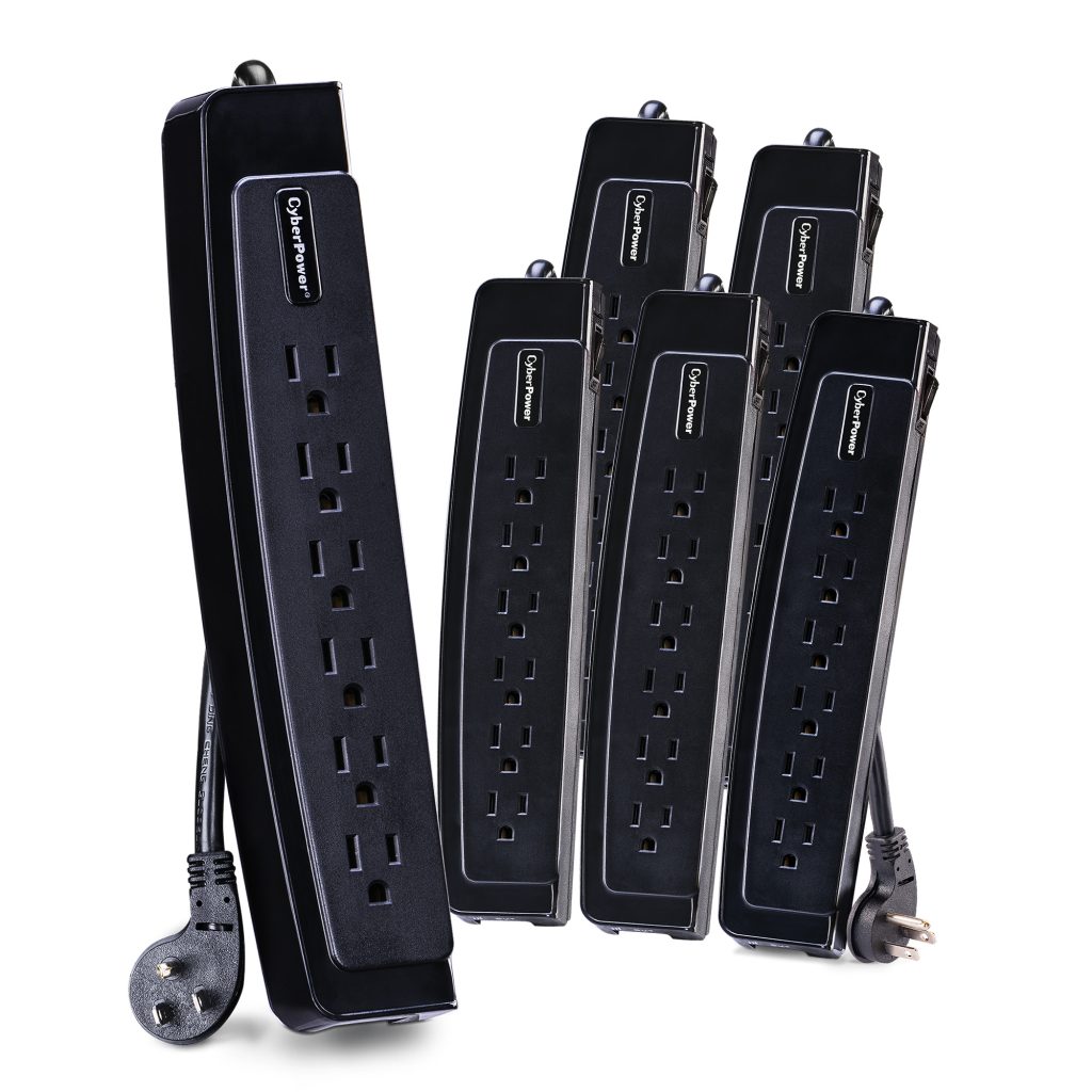 The Professional Surge Protector CSP604TMP6 in a 6-Pack from CyberPower offers vital surge suppression for common home and office devices such as computers and electronics. It prevents spikes in energy caused by storms and electrical power surges and is ideal for safeguarding personal computers, phones/faxes/modems, and other consumer electronics. The CSP604TMP6 provides 1350 joules of protection and 6 surge-protected outlets. Data line protection occurs with RJ11 ports for telecommunication devices (phones, faxes, modems, and DSL lines).