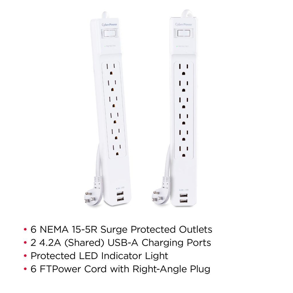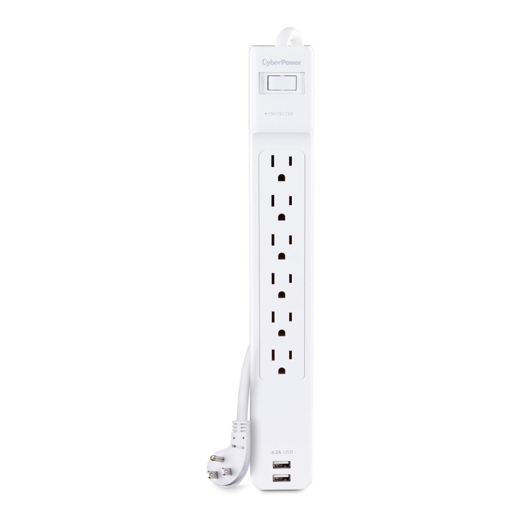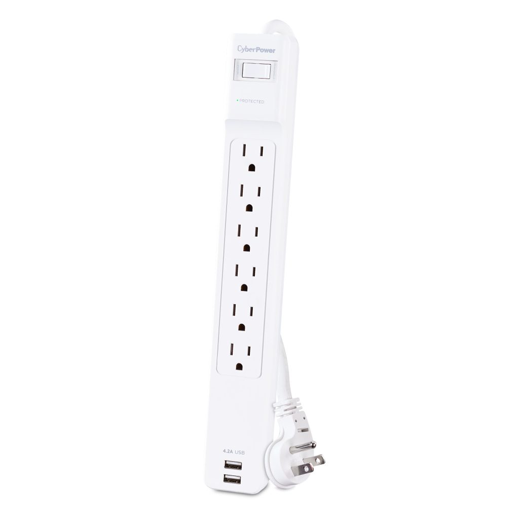 The CSP606U42A Professional Surge Protector from CyberPower offers vital surge suppression for common home and office devices such as computers and electronics. It is designed to provide maximum protection and convenience to a number of devices where wall receptacles are out of reach. The CSP606U42A prevents damaging spikes in energy caused by storms and electrical power from reaching your electronc equipment. It provides 900 joules of protection, 6 outlets (1 widely spaced for a transformer plug), 2 USB charging ports, and a low profile right-angle, 6-foot braided power cord. Features of the CSP606U42A include safe-fail notification, Microdot LED protected indicator light, and a 15A Power Breaker Switch. The two USB charging ports with 4.2-amp total output are located at the end of the Professional Surge Protector, offering the best possible reach.