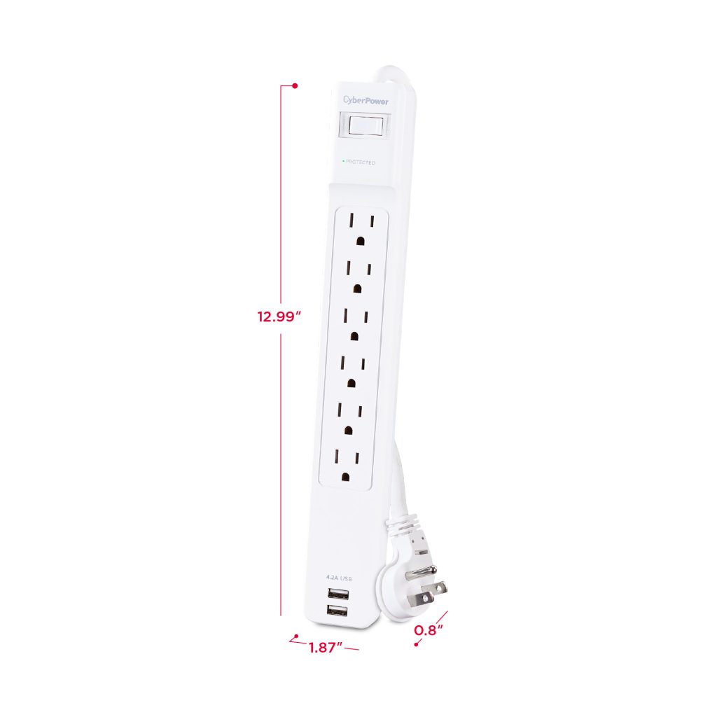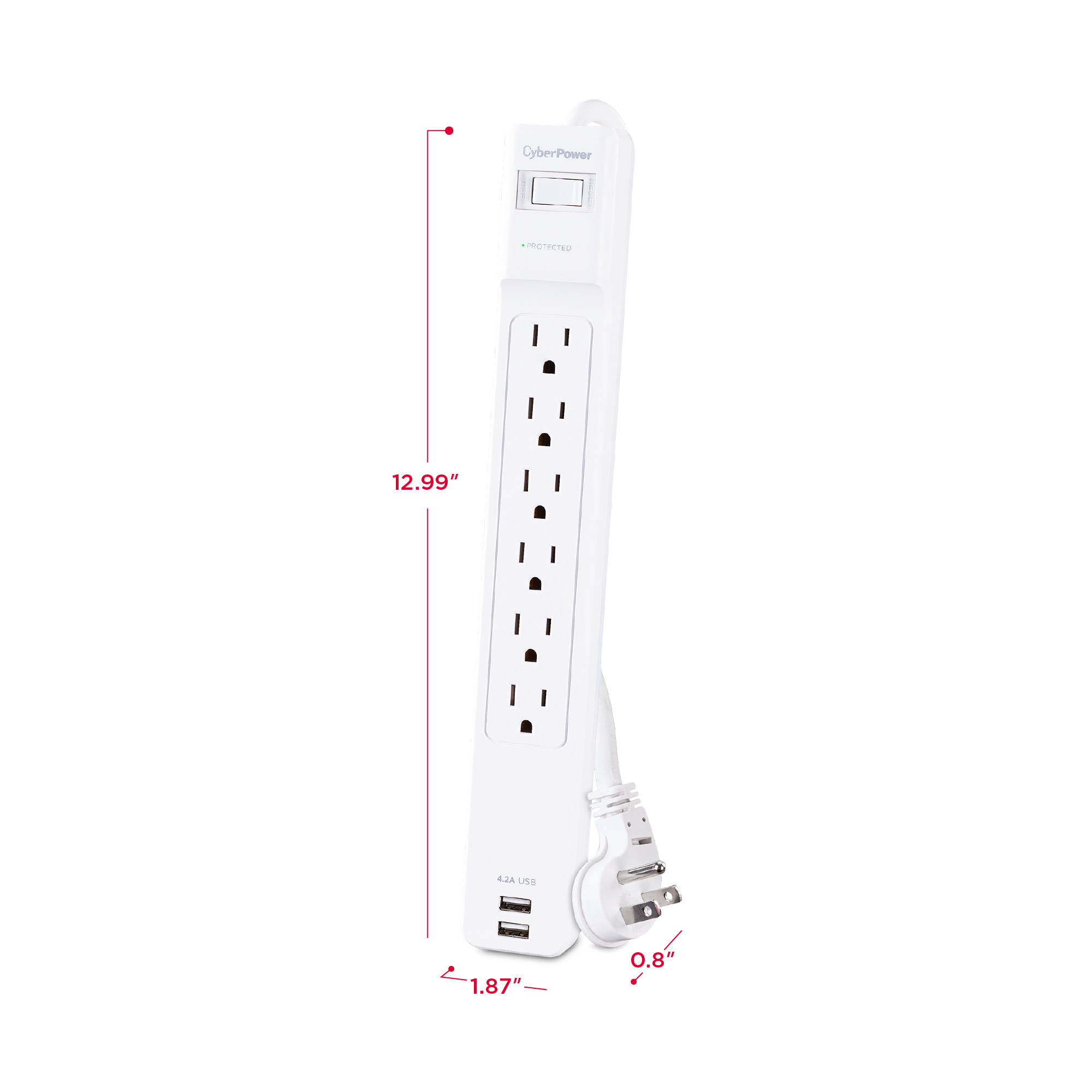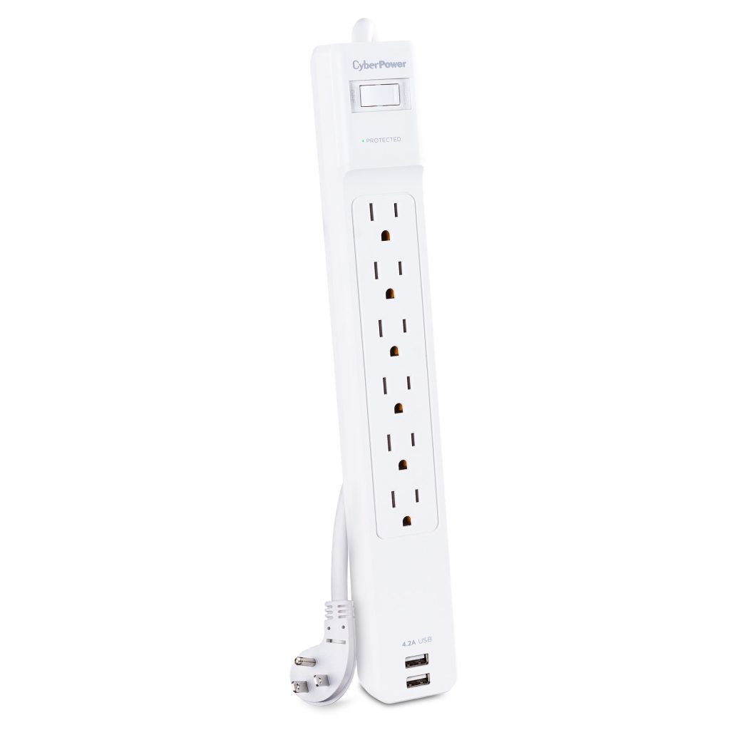 The CSP606U42A Professional Surge Protector from CyberPower offers vital surge suppression for common home and office devices such as computers and electronics. It is designed to provide maximum protection and convenience to a number of devices where wall receptacles are out of reach. The CSP606U42A prevents damaging spikes in energy caused by storms and electrical power from reaching your electronc equipment. It provides 900 joules of protection, 6 outlets (1 widely spaced for a transformer plug), 2 USB charging ports, and a low profile right-angle, 6-foot braided power cord. Features of the CSP606U42A include safe-fail notification, Microdot LED protected indicator light, and a 15A Power Breaker Switch. The two USB charging ports with 4.2-amp total output are located at the end of the Professional Surge Protector, offering the best possible reach.