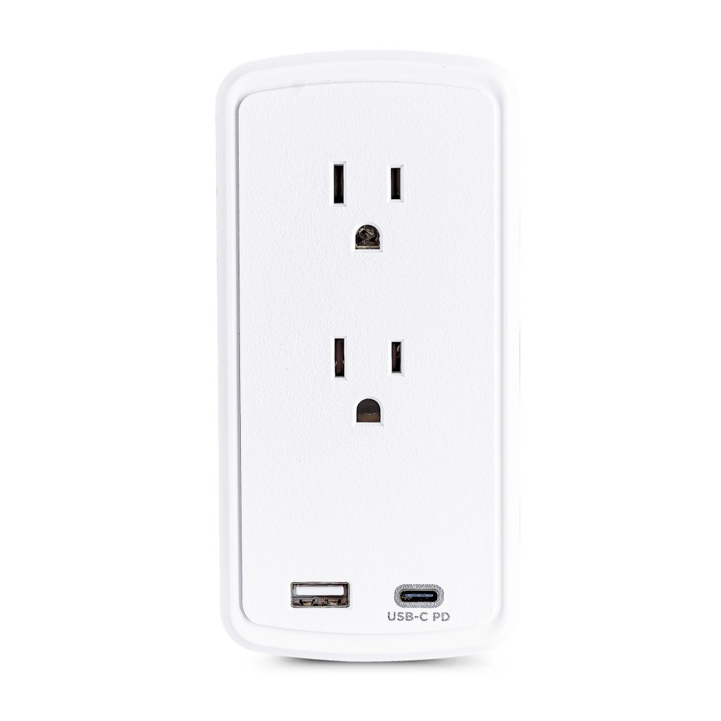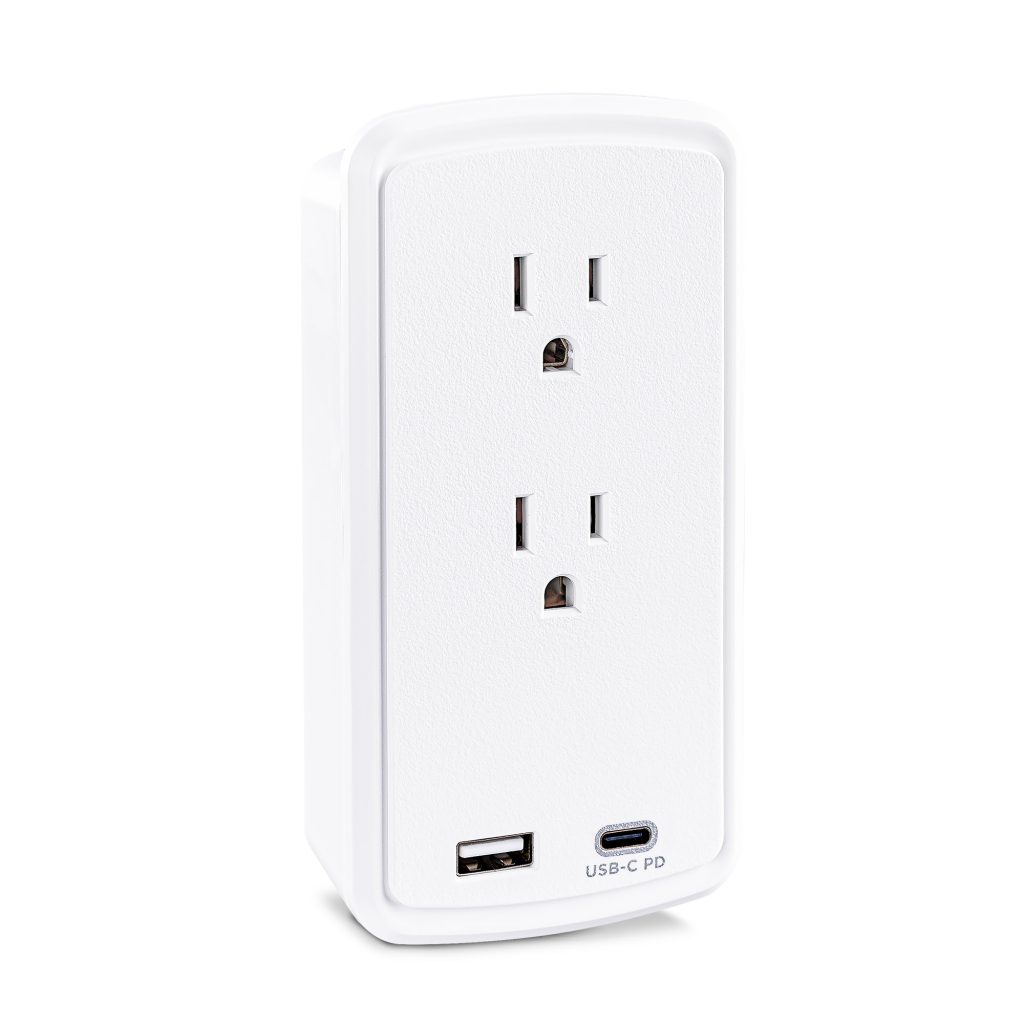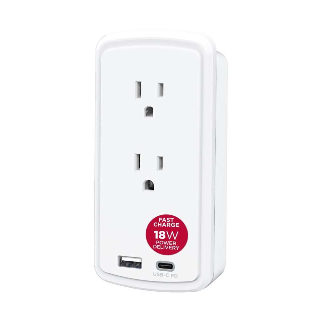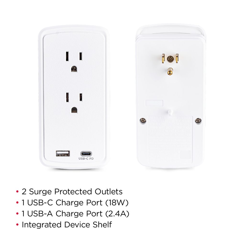 The P2WUCHD Wall-tap Surge Protector with USB safeguards common home and office devices, such as computers and electronics, by absorbing spikes in energy caused by storms and electrical power surges. It provides 500 joules of protection, has 2 surge-protected outlets and a wall tap plug. One USB-A port (2.4 Amp) and one USB-C port (18W PD) charge mobile, USB enabled devices. The P2WUCHD also features EMI/RFI noise filtering, an impact-resistant casing, and an integrated device shelf on top of the unit for convenient charging and cord management.