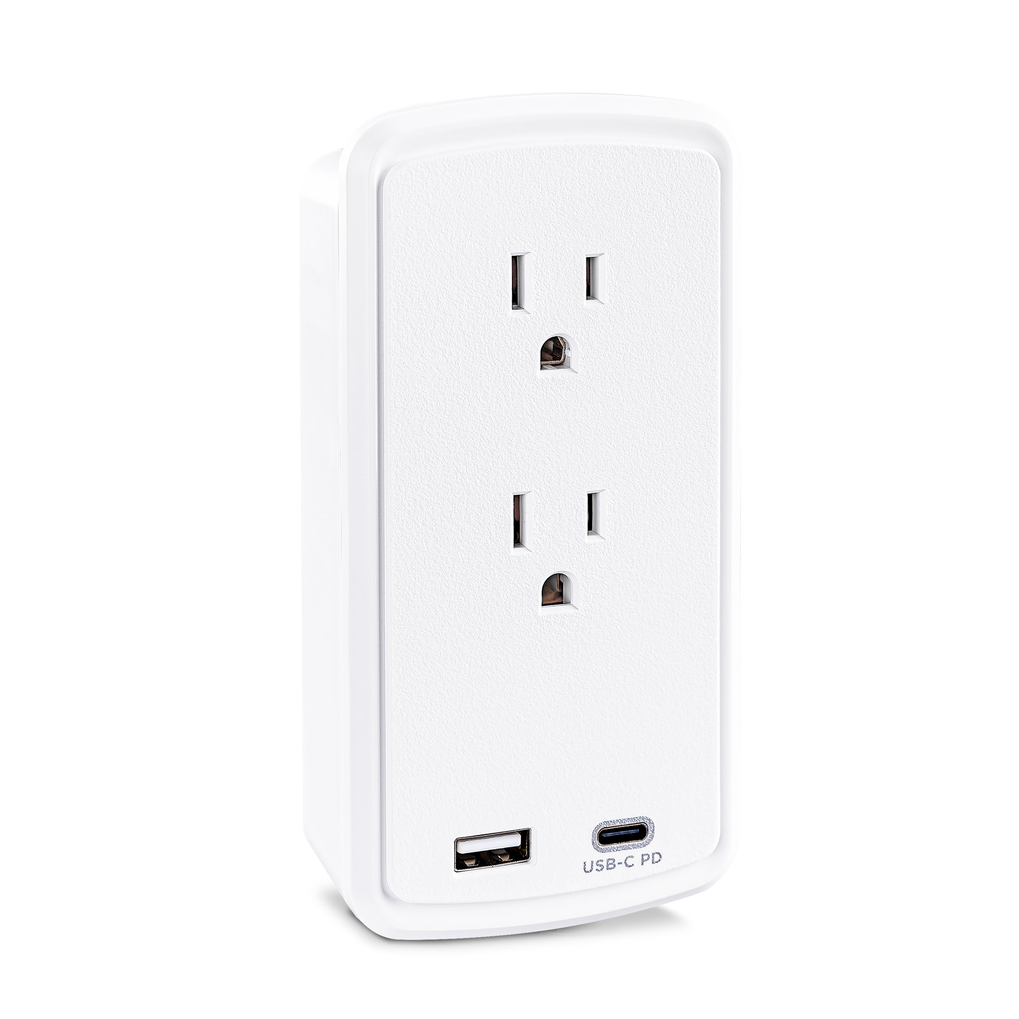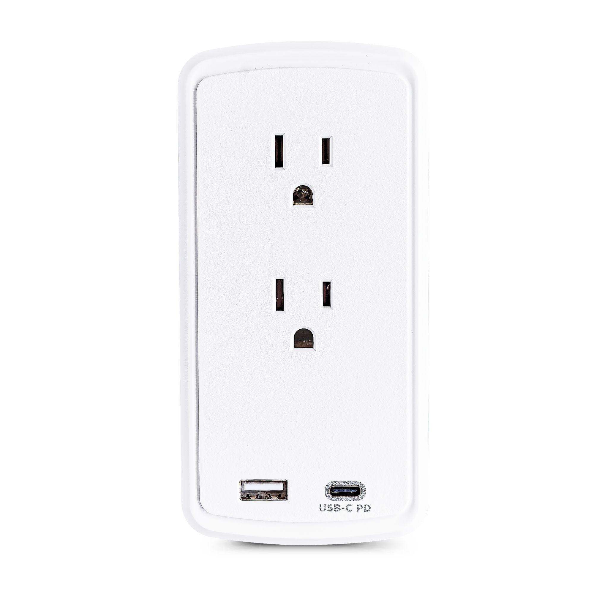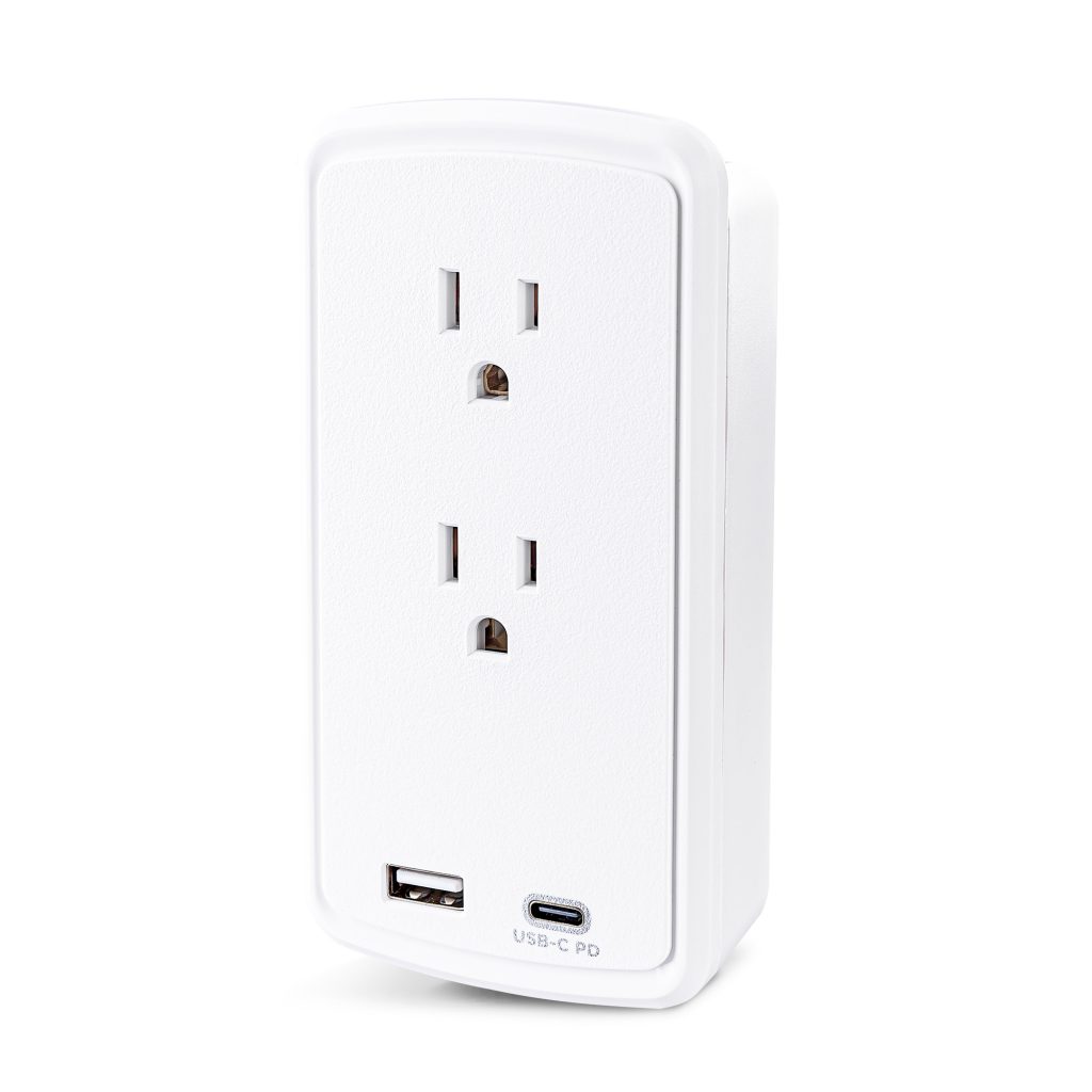 The P2WUCHD Wall-tap Surge Protector with USB safeguards common home and office devices, such as computers and electronics, by absorbing spikes in energy caused by storms and electrical power surges. It provides 500 joules of protection, has 2 surge-protected outlets and a wall tap plug. One USB-A port (2.4 Amp) and one USB-C port (18W PD) charge mobile, USB enabled devices. The P2WUCHD also features EMI/RFI noise filtering, an impact-resistant casing, and an integrated device shelf on top of the unit for convenient charging and cord management.