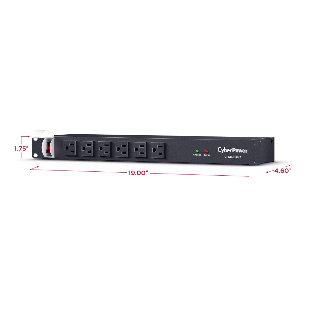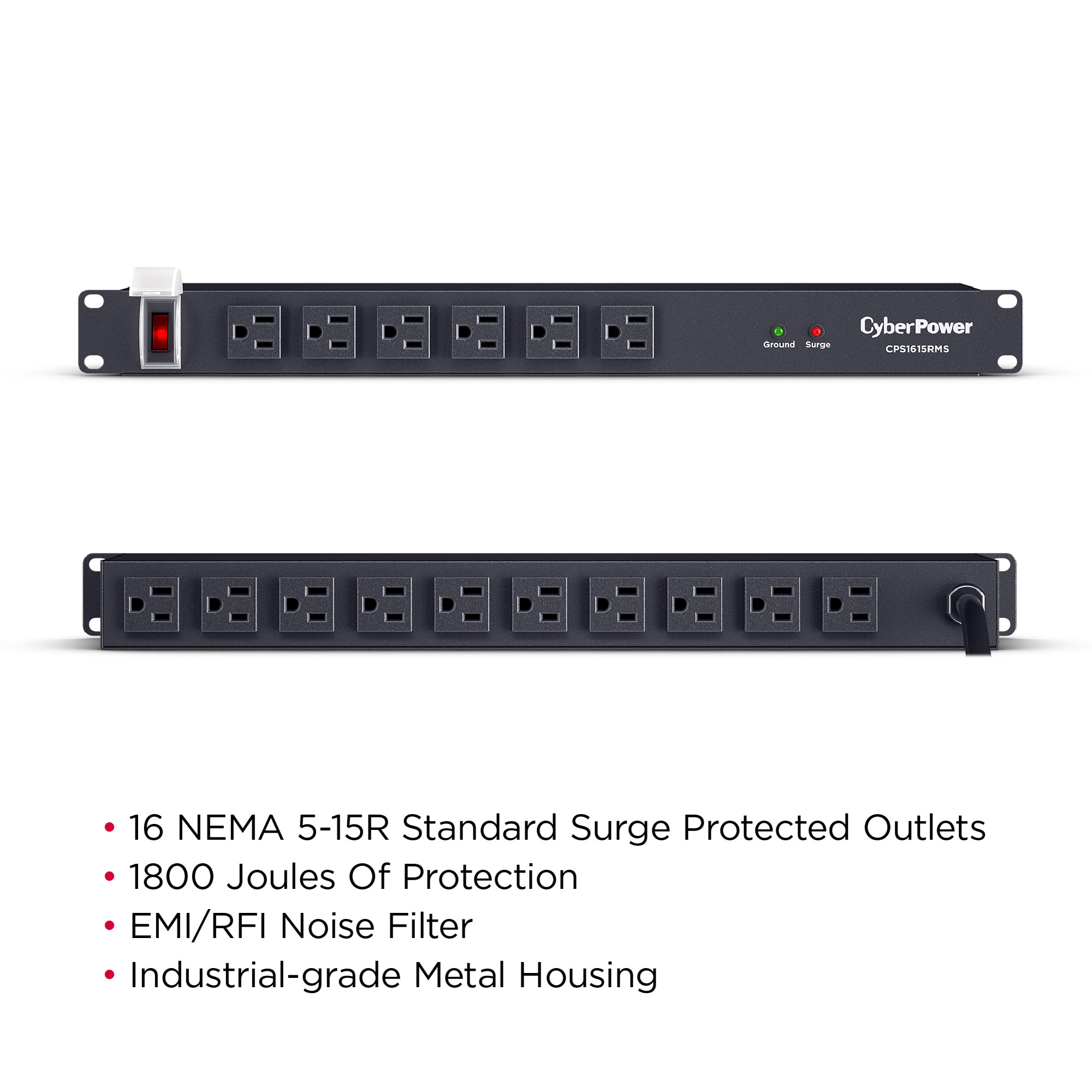 Engineered for the most demanding applications, the professional-grade Rackbar CPS1615RMS safeguards systems and networking equipment by absorbing spikes in energy caused by storms and electrical power surges. Designed for network environments, the CPS1615RMS also performs superbly for home office use, providing 1800 joules of protection, 15-Amp electrical capacity with circuit breaker, and 16 surge-protected outlets (6 front, 10 rear). Industrial-grade metal housing keeps this Rackbar performing flawlessly. The CPS1615RMS has a 1U racksize and can be mounted horizontally.