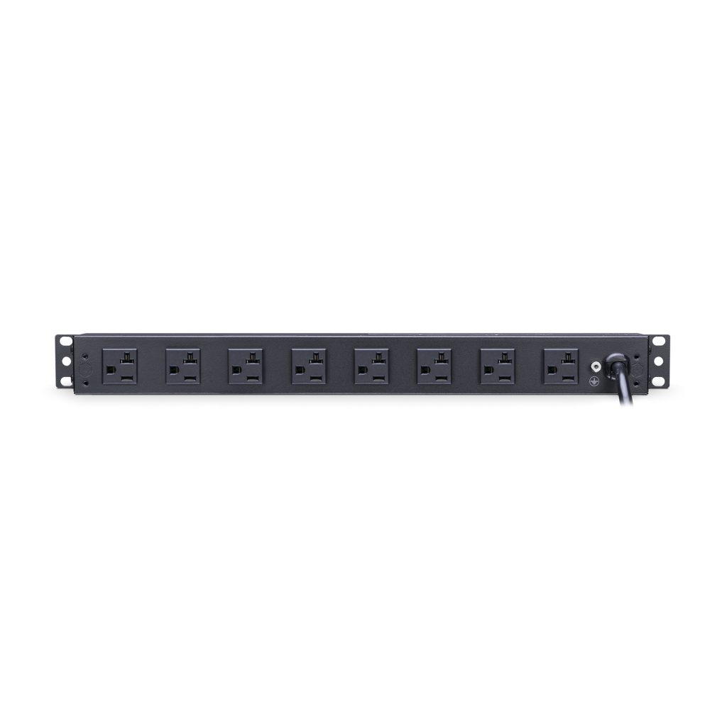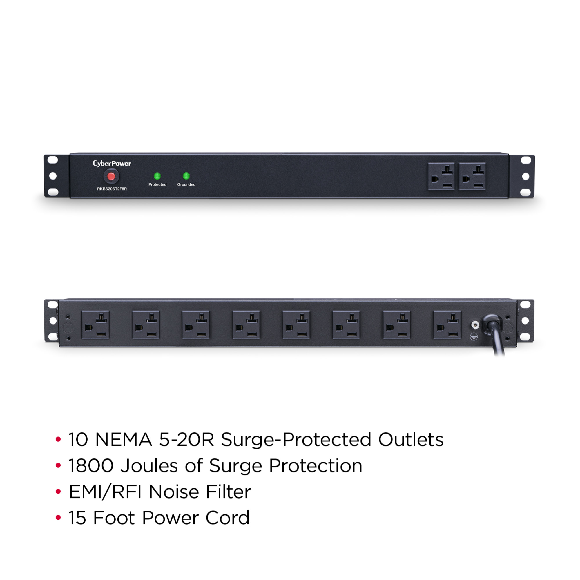 Engineered for the most demanding applications, the professional-grade Rackbar™ Surge Protector RKBS20ST2F8R from CyberPower safeguards systems and networking equipment by absorbing spikes in energy caused by storms and electrical power surges. Designed for network environments, the RKBS20ST2F8R also performs superbly for home office use, providing 1800 joules of protection, 20-Amp electrical capacity with circuit breaker, and 10 surge-protected outlets (2 front, 8 rear). Industrial-grade metal housing keeps this Rackbar performing flawlessly. Two sets of mounting brackets provide flexible installation options: 1U rackmount (19 in.); 0U vertical rackmount and under-counter configurations.