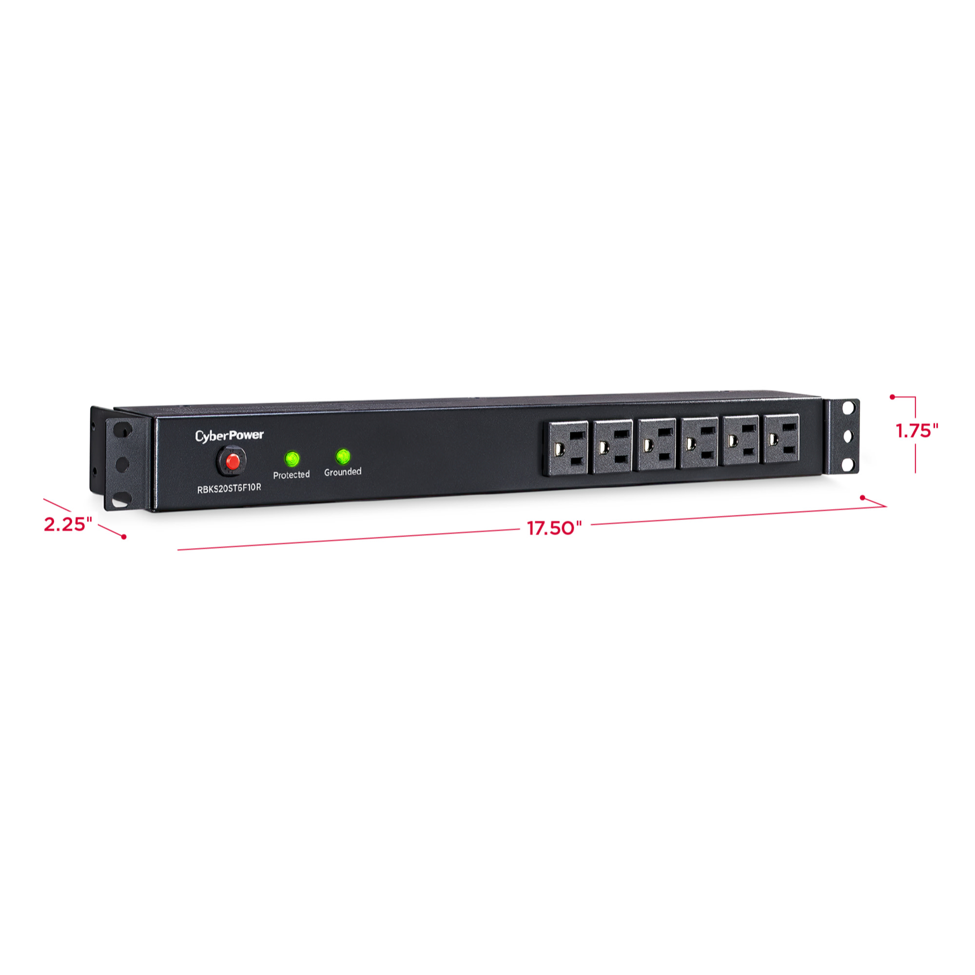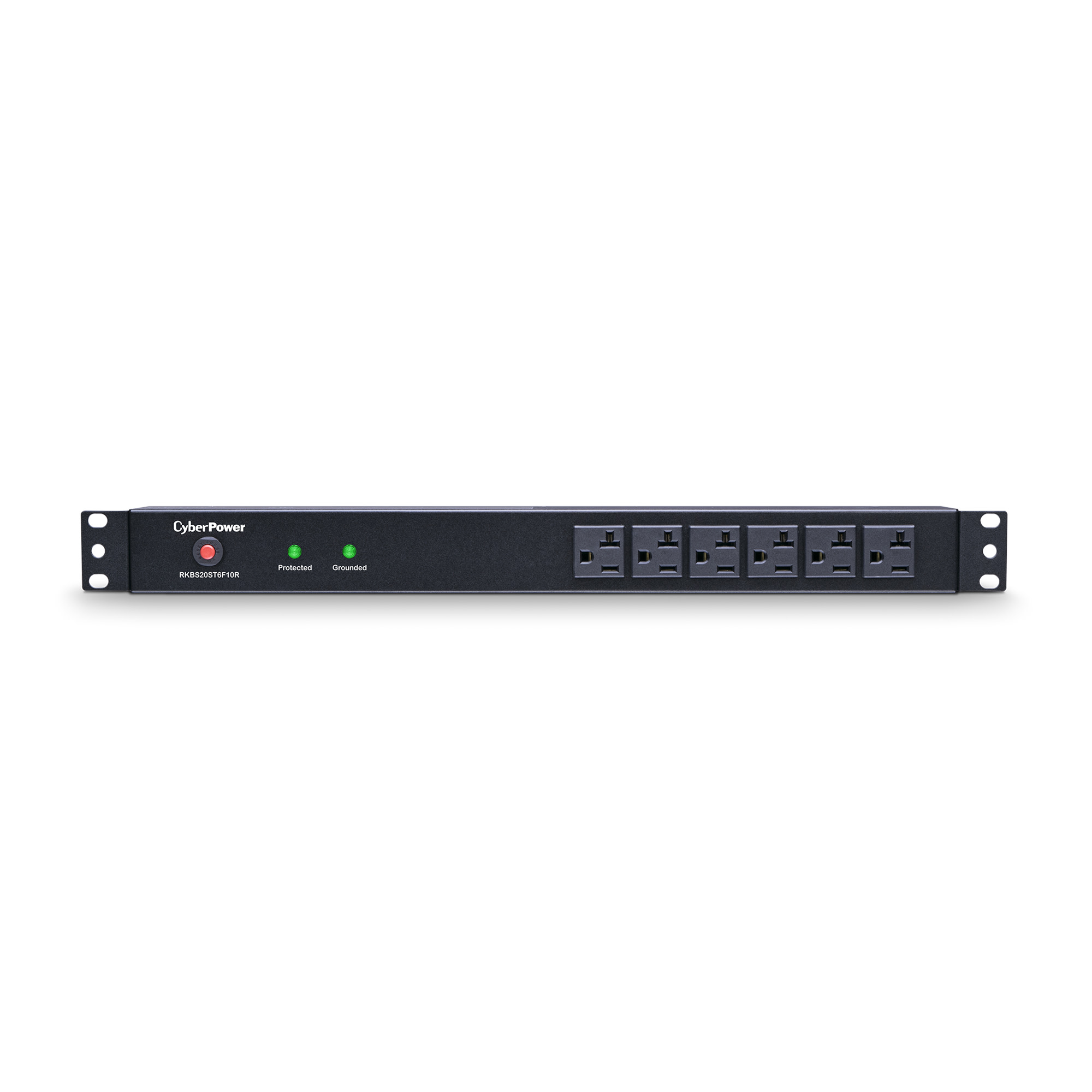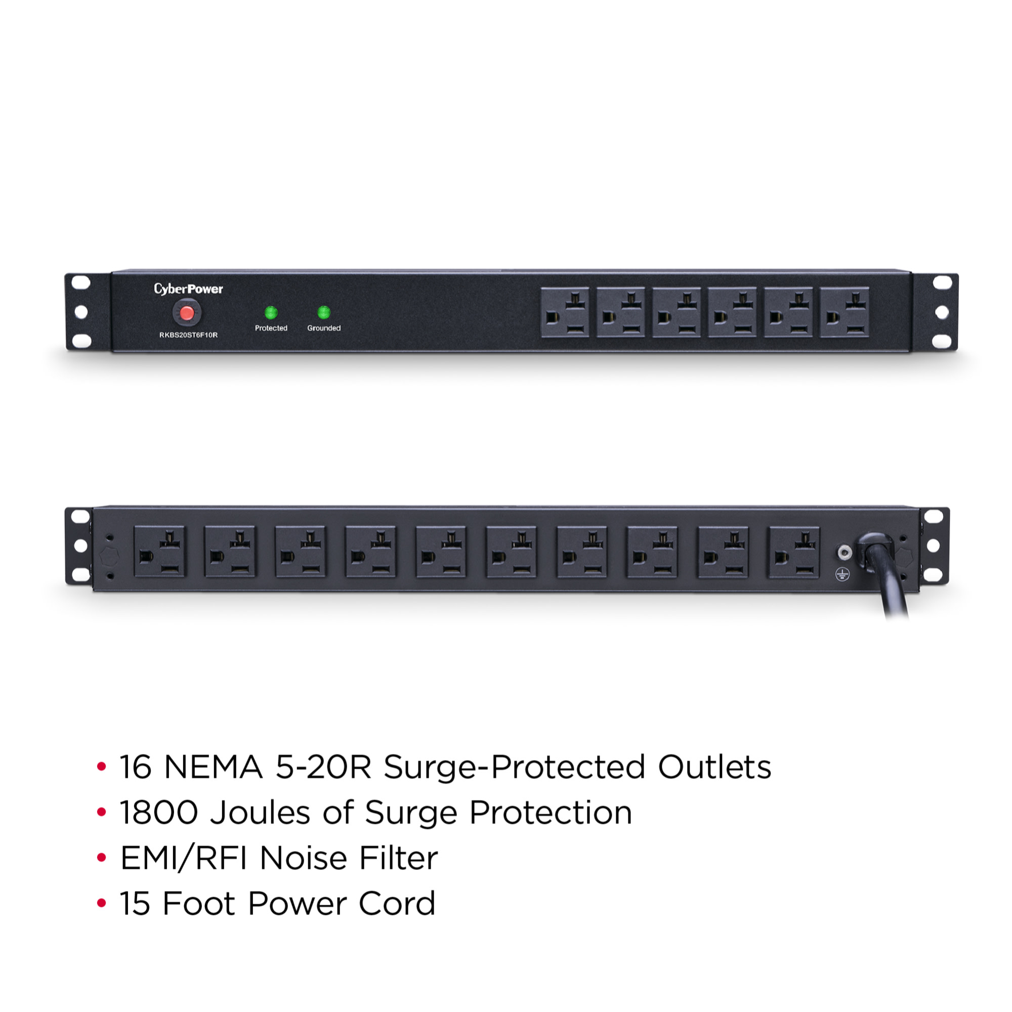 Engineered for the most demanding applications, the professional-grade Rackbar™ Surge RKBS20ST6F10R safeguards systems and networking equipment by absorbing spikes in energy caused by storms and electrical power surges. Designed for network environments, the RKBS20ST6F10R also performs superbly for home office use, providing 1800 joules of protection, 20-amp electrical capacity with circuit breaker, and 16 surge-protected outlets (6 front, 10 rear). Industrial-grade metal housing keeps this Rackbar performing flawlessly. Two sets of mounting brackets provide flexible installation options: 1U rackmount (19 in.); 0U vertical rackmount and under-counter configurations.