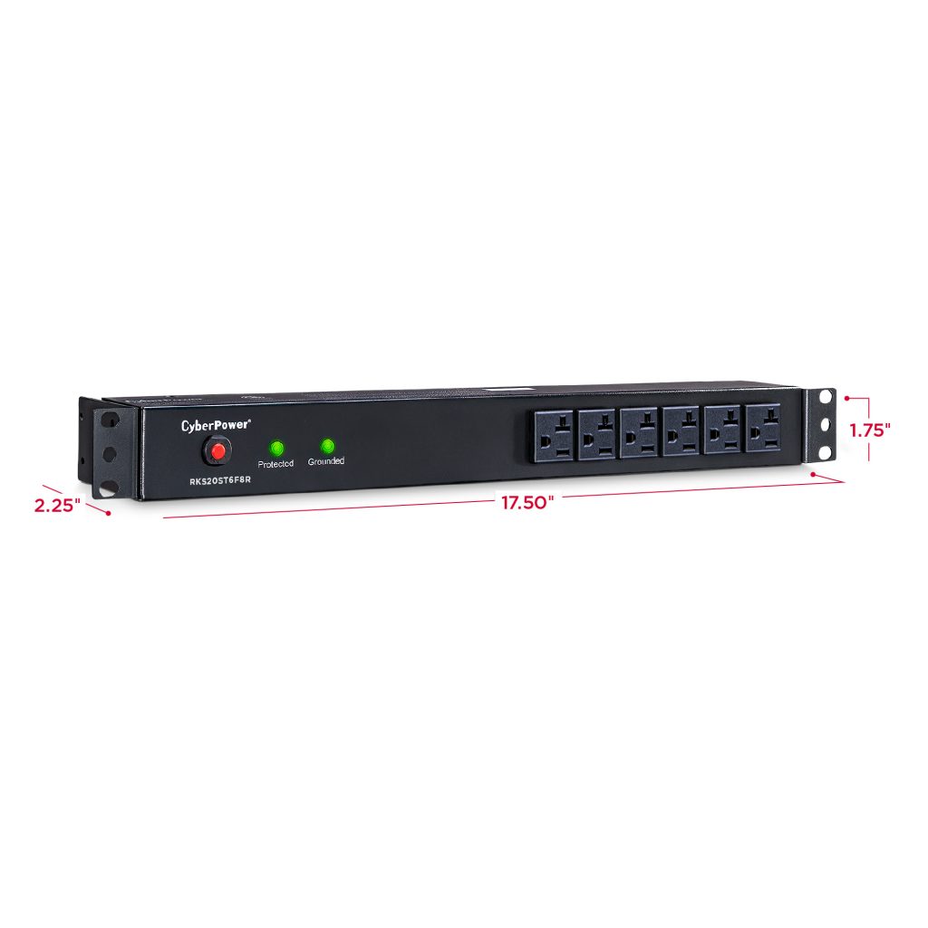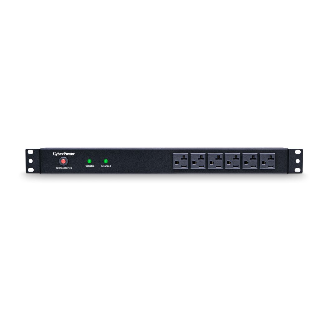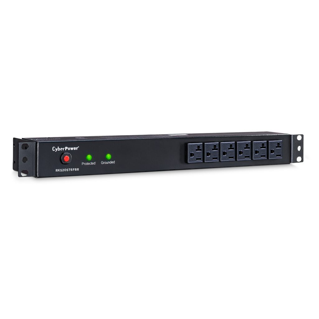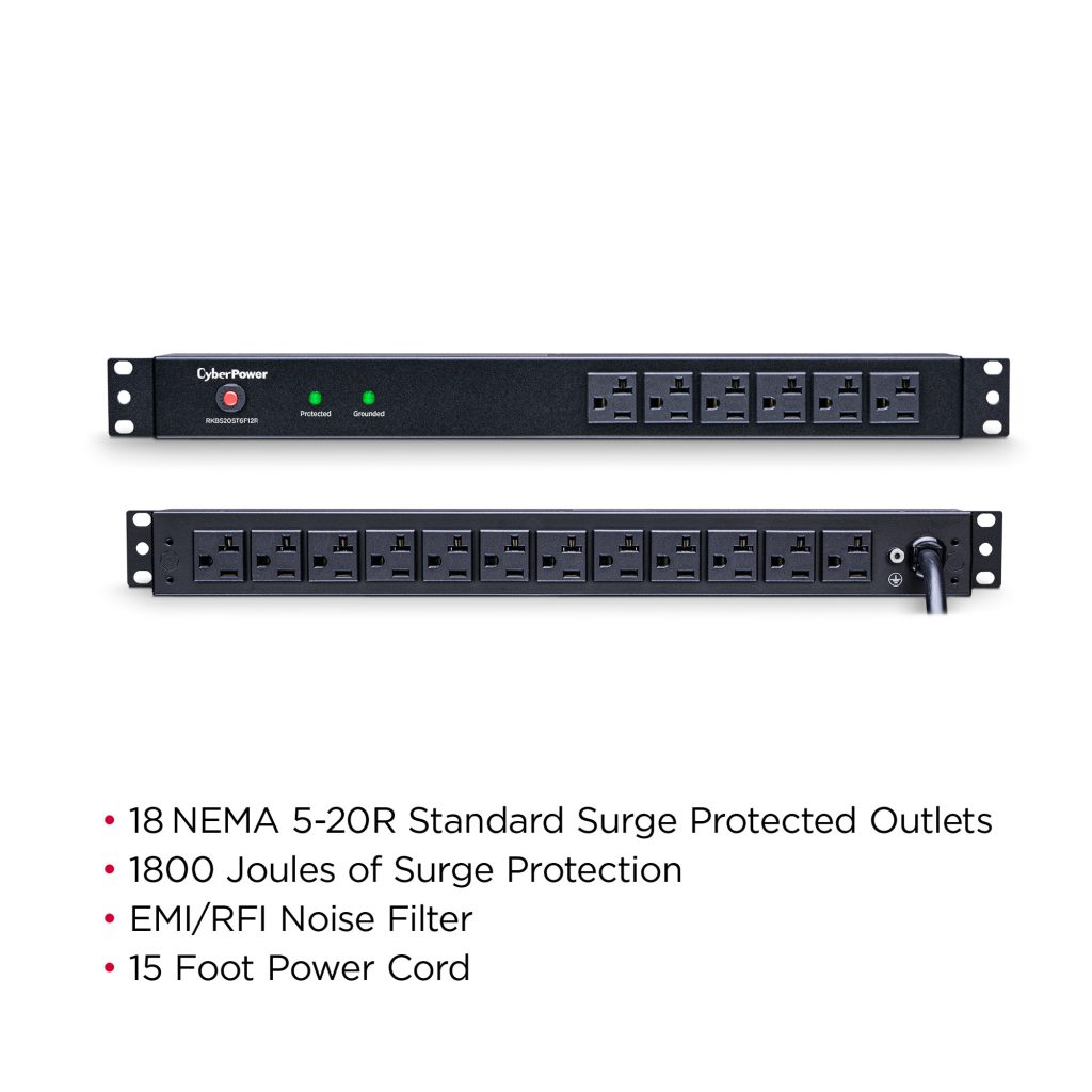 Engineered for the most demanding applications, the professional-grade Rackbar™ Surge RKBS20ST6F12R from CyberPower safeguards systems and networking equipment by absorbing spikes in energy caused by storms and electrical power surges. Designed for network environments, the RKBS20ST6F12R also performs superbly for home office use, providing 1800 joules of protection, 20-amp electrical capacity with circuit breaker, and 18 surge-protected outlets (6 front, 12 rear). Industrial-grade metal housing keeps this Rackbar performing flawlessly. Two sets of mounting brackets provide flexible installation options: 1U rackmount (19 in.); 0U vertical rackmount and under-counter configurations.