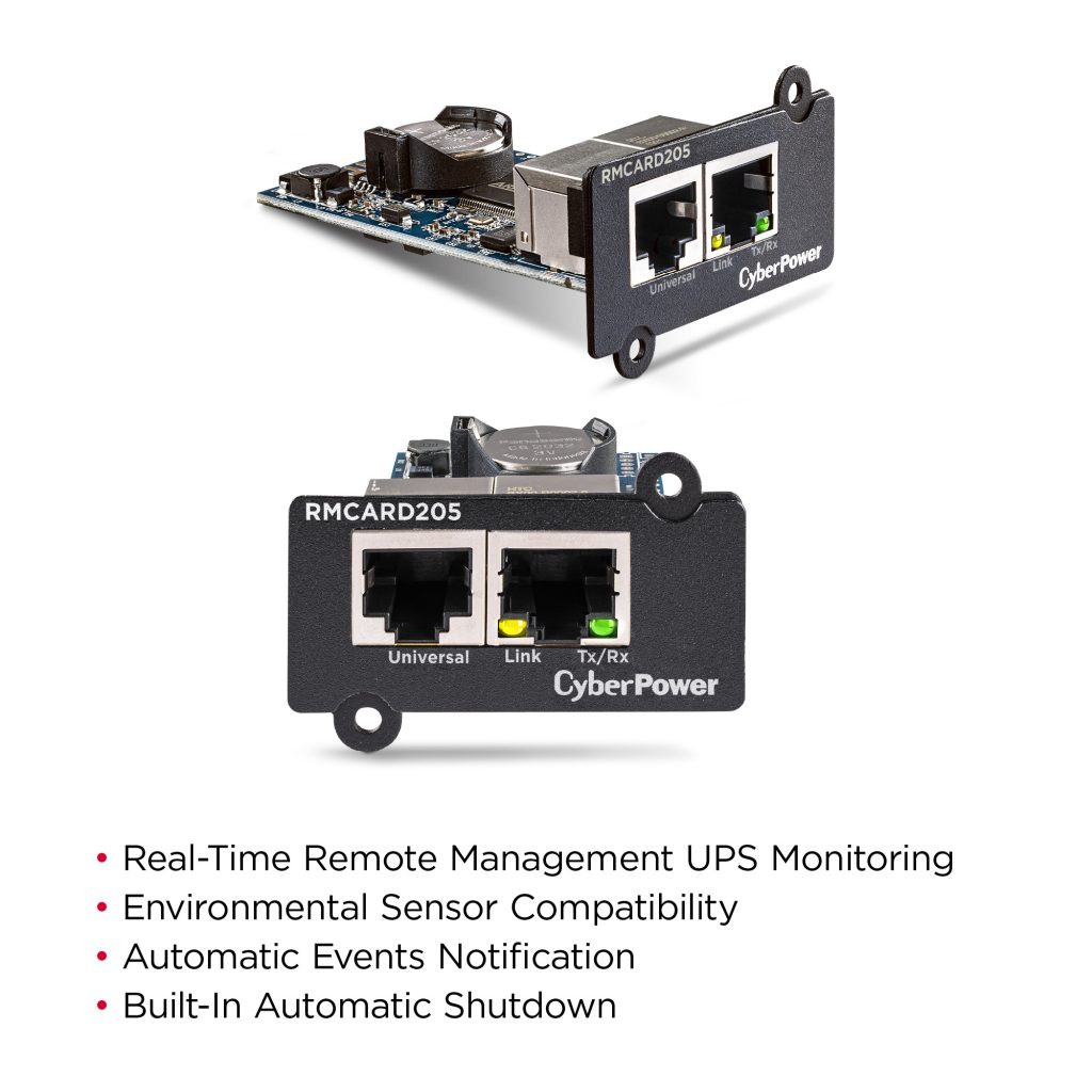 A full-featured network management card, the CyberPower RMCARD205TAA remotely manages, monitors and controls select CyberPower UPS systems and ATS PDUs via a standard web browser, command line interface (CLI), SNMP or network management system (NMS). Especially suited to enterprise installations, the RMCARD205TAA provides scheduling for UPS shutdown, startup, and rebooting, along with event action settings, event logging, status recording, and automatic event notifications via email, SMS, SNMP traps, or Syslog. PowerPanel® Business Edition Client software protects servers and workstations from data loss due to power failure by initiating auto-shutdown command from a UPS when a power loss event occurs.