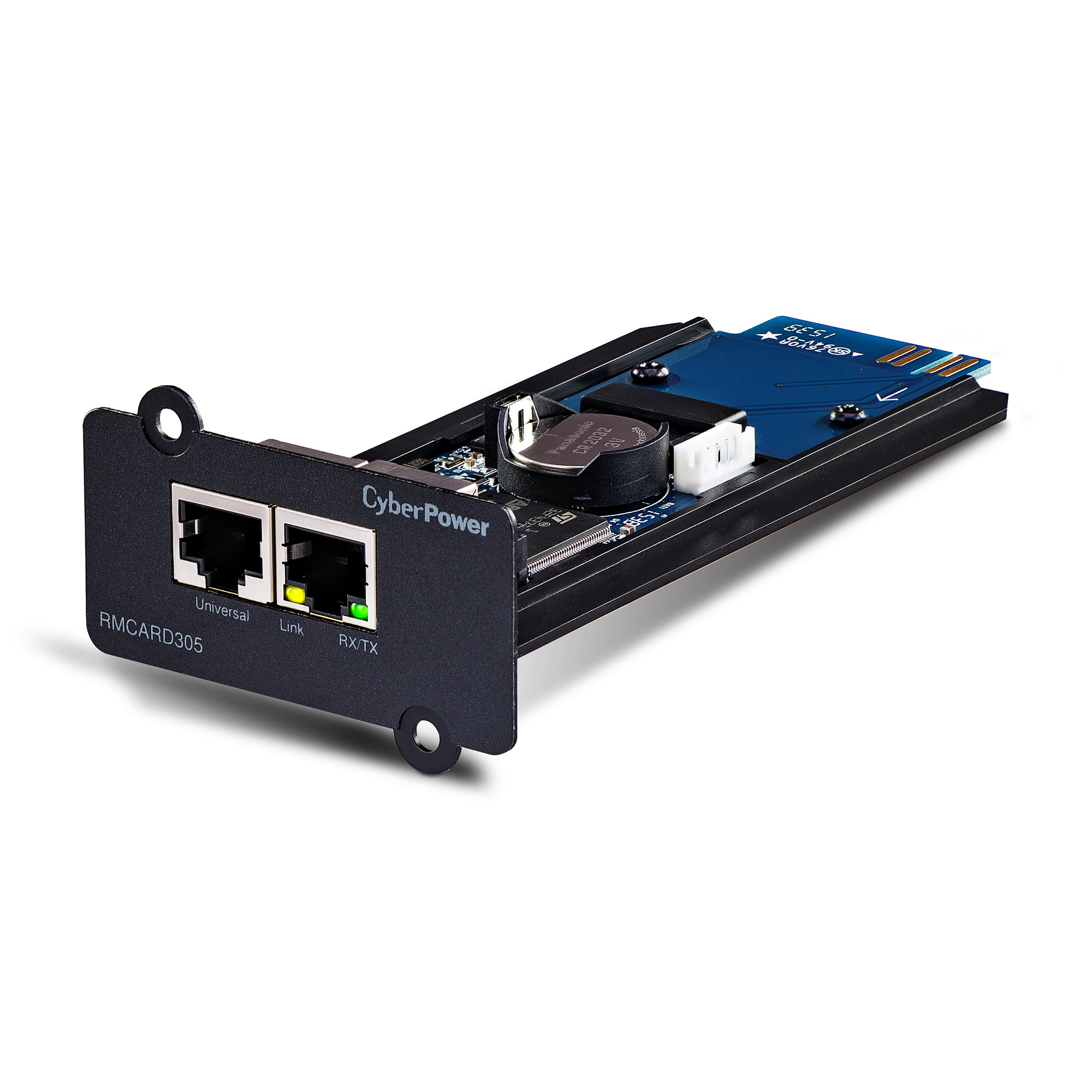 A full-featured network management card, the CyberPower RMCARD305TAA remotely manages, monitors and controls select CyberPower UPS systems and ATS PDUs via a standard web browser, command line interface (CLI), SNMP or network management system (NMS). Especially suited to enterprise installations, the RMCARD305TAA provides scheduling for UPS shutdown, startup, and rebooting, along with event action settings, event logging, status recording, and automatic event notifications via email, SMS, SNMP traps, or Syslog. PowerPanel® Business Edition Client software protects servers and workstations from data loss due to power failure by initiating auto-shutdown command from a UPS when a power loss event occurs.