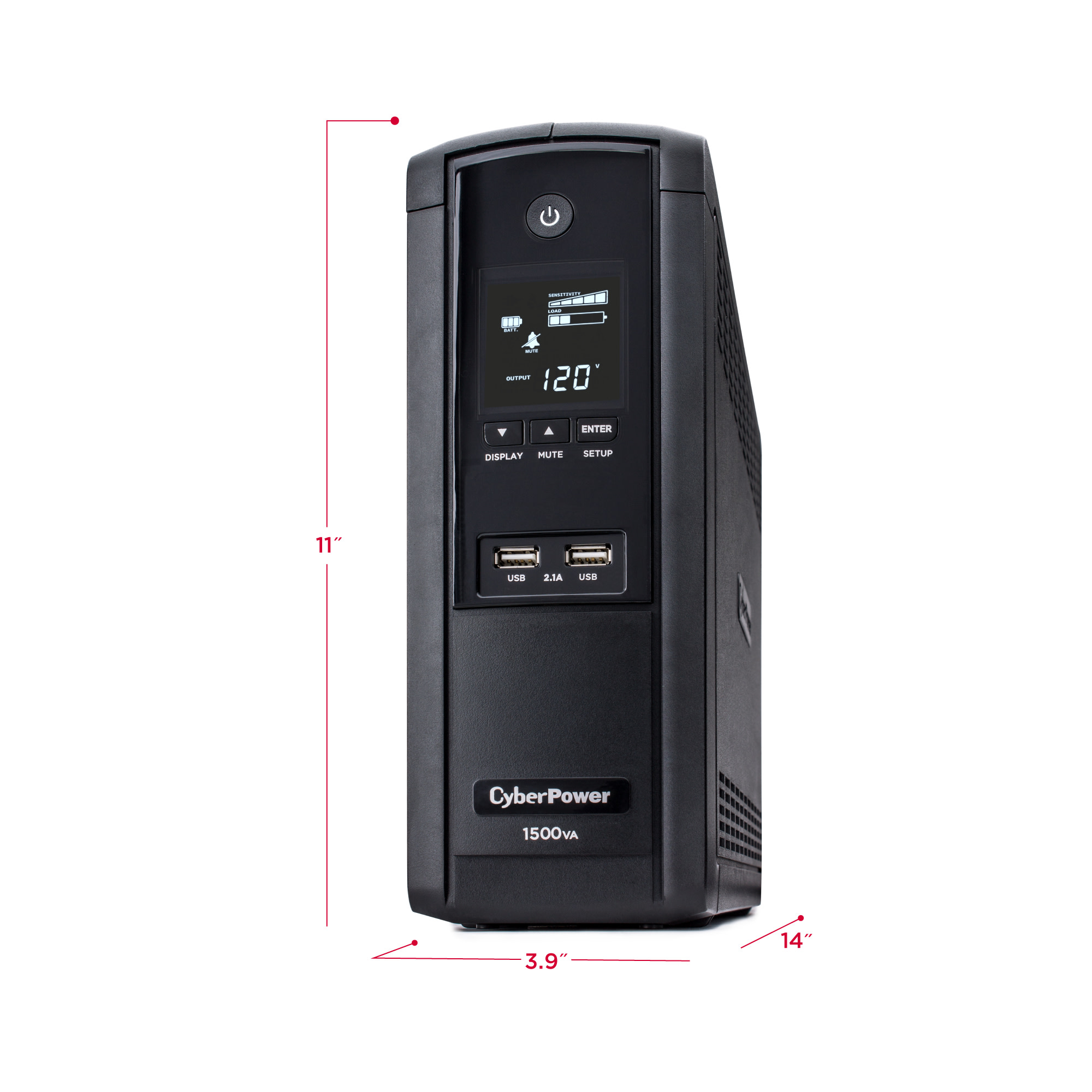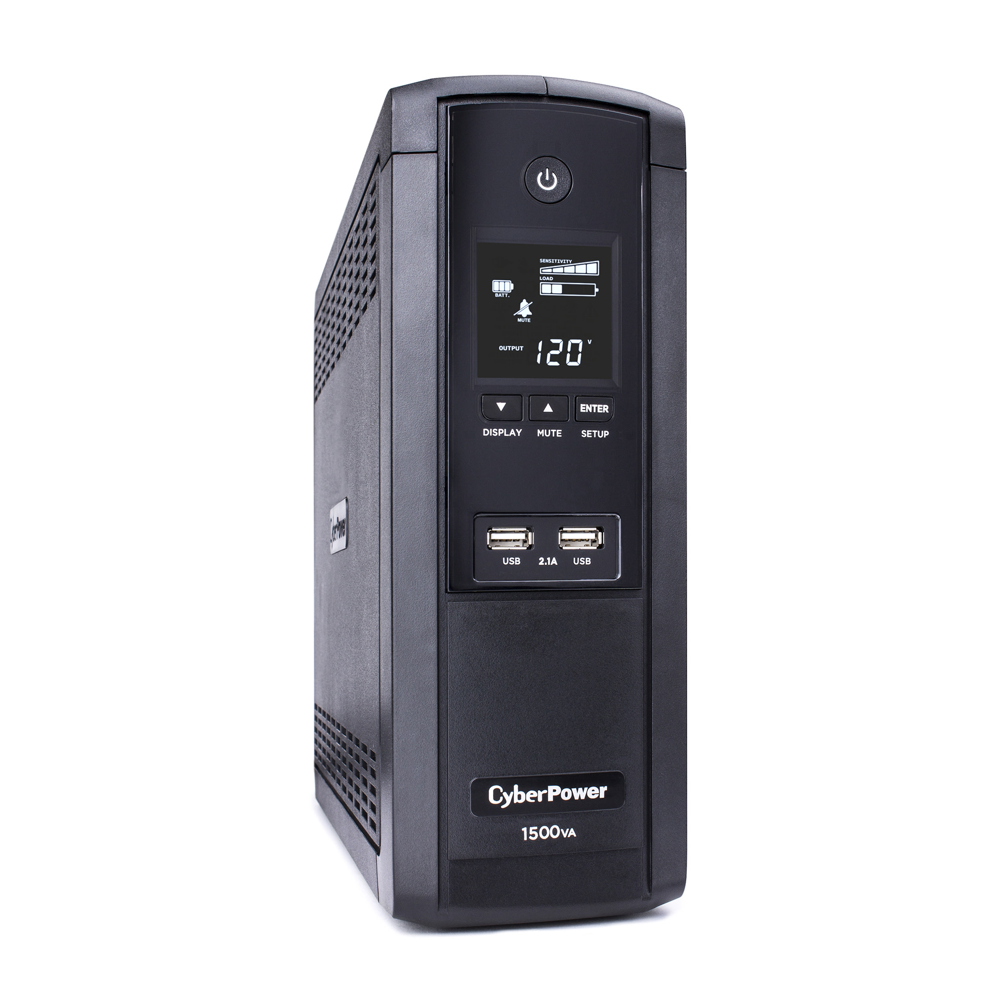 A mini-tower UPS with line interactive topology, the CyberPower Intelligent LCD Series BRG1500AVRLCDTAA provides battery backup (using simulated sine wave output) and surge protection for desktop computers, workstations, networking devices, and home entertainment systems.