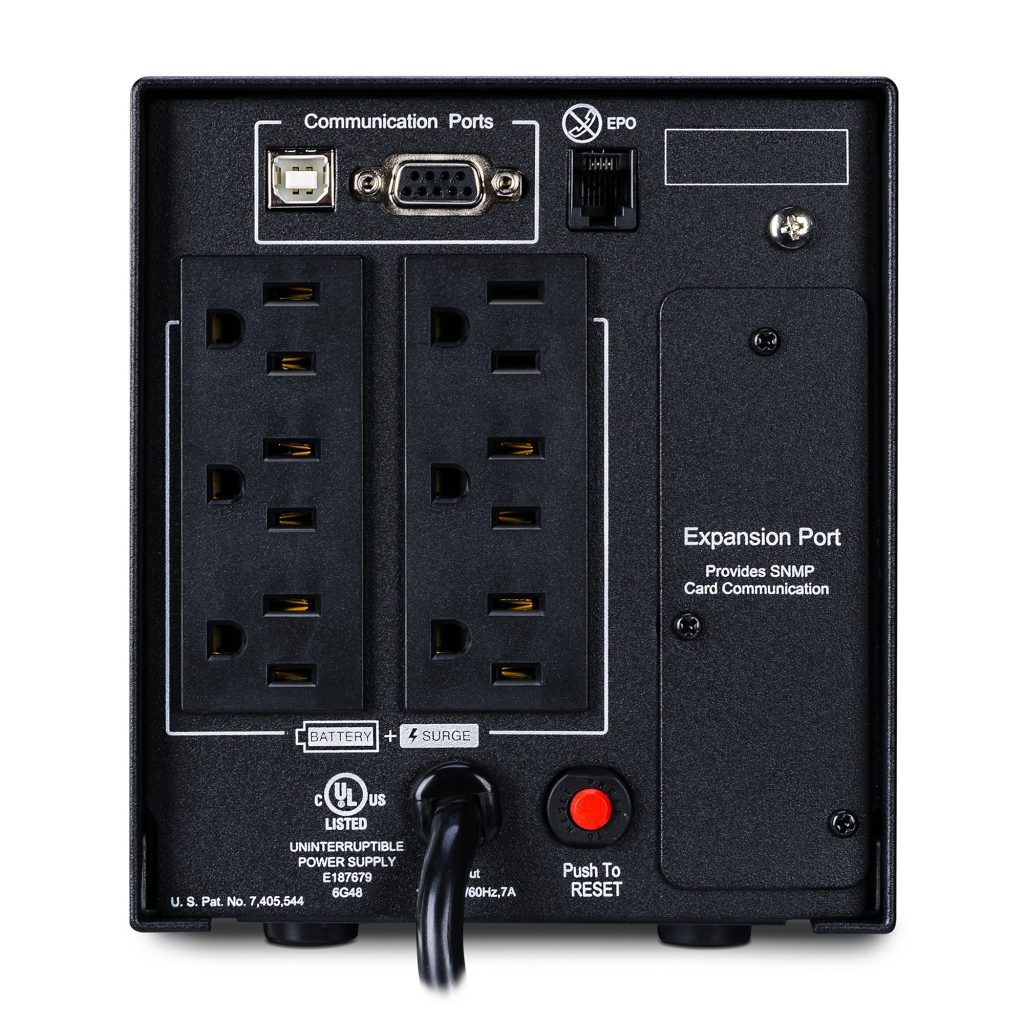 Many CyberPower UPS units have two sets of outlets. One set is labeled “Battery/Surge” and one set is labeled “Surge”. The outlets labeled “Battery/Surge” are the outlets that will receive battery power during a power failure. You should plug your computer and monitor into these outlets and any externally powered critical data storage device.