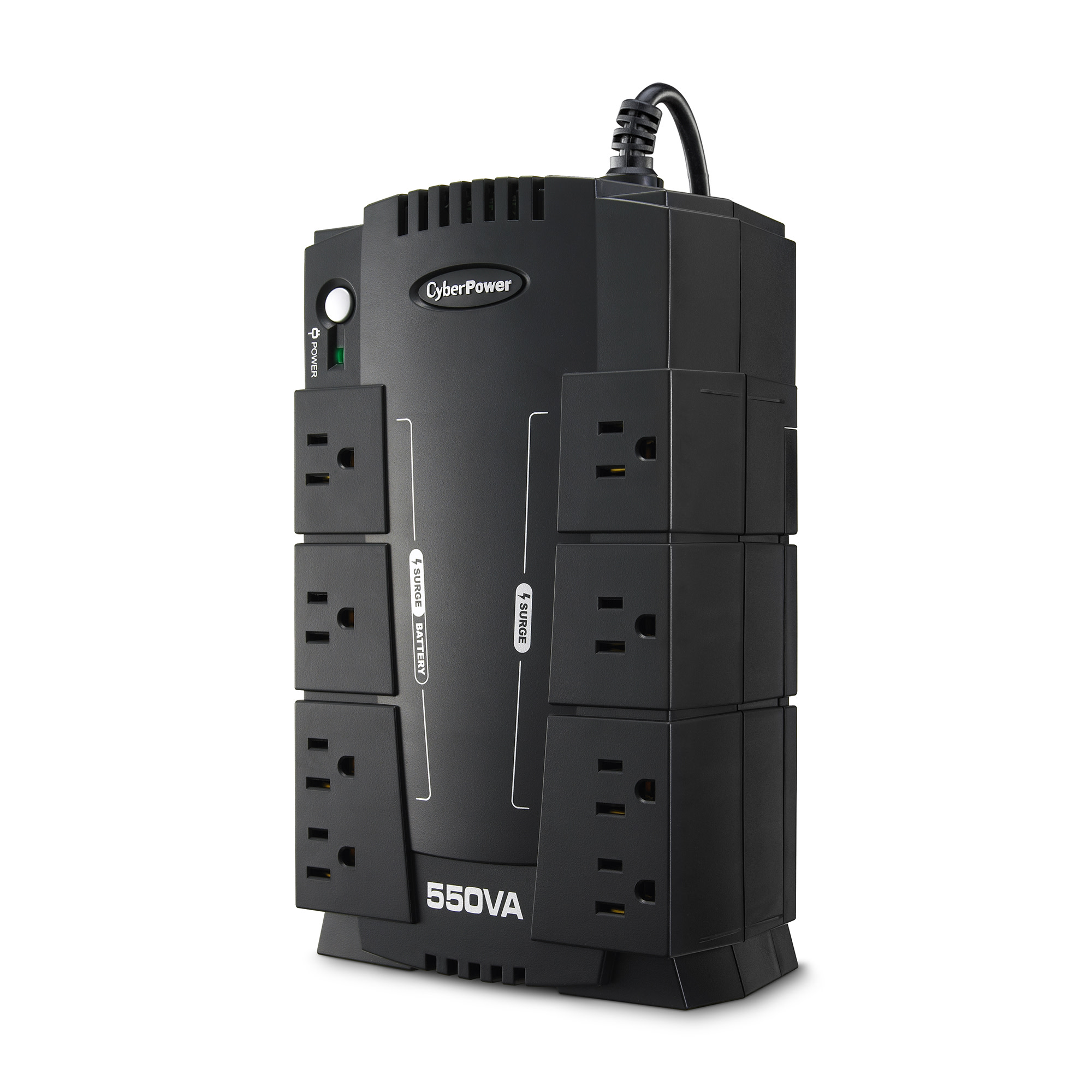 The CyberPower Standby CP550SLGTAA is a compact UPS with standby topology. It complies with the U.S. Trade Agreement Act (TAA). This model provides battery backup (using simulated sine wave output) and surge protection for desktop computers, workstations, networking devices, and home entertainment systems. During power interruptions, the CP550SLGTAA offers reliable power protection and battery backup. This model comes with a three-year warranty (including coverage of batteries) and a $100,000 Connected Equipment Guarantee.