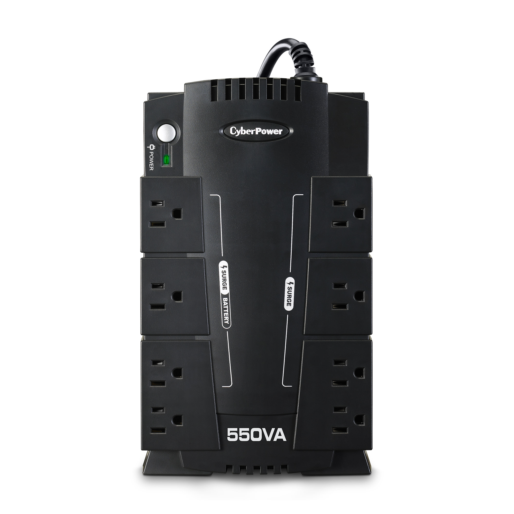 Many CyberPower UPS units have two sets of outlets. One set is labeled “Battery/Surge” and one set is labeled “Surge”. The outlets labeled “Battery/Surge” are the outlets that will receive battery power during a power failure. You should plug your computer and monitor into these outlets and any externally powered critical data storage device.
