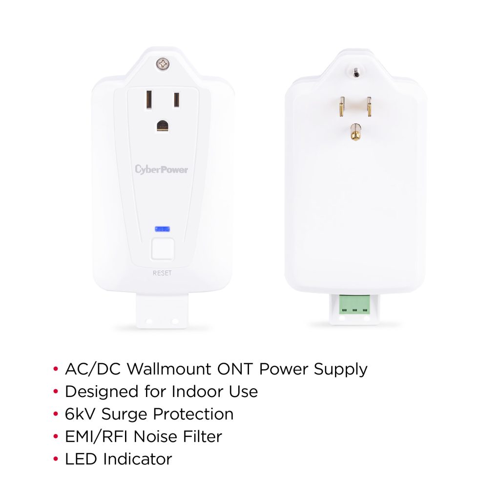 Designed for indoor use, the CyberPower CSPS12V36W ONT Power Supply provides continuous power to 12VDC Optical Network Terminals (ONT) 36W or less and is ideal for FTTx deployments where battery backup is not required. Additional features include 6kVA surge protection, a Power On LED indicator, ONT reset button, and a pass-through NEMA 5-15R oulet. The CSPS12V36W comes with a three-year warranty.