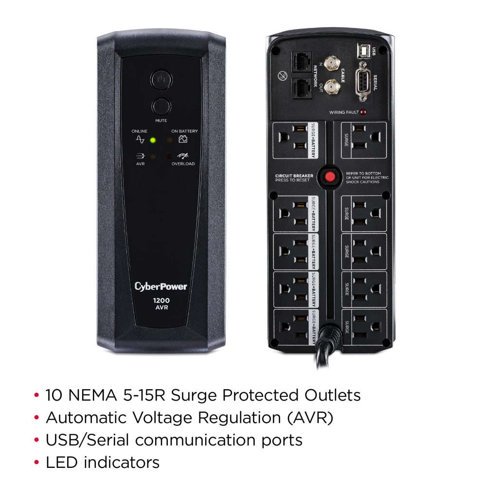A mini-tower UPS with line interactive topology, the CyberPower AVR Series CP1200AVR provides battery backup (using simulated sine wave output) and surge protection for desktop computers, workstations, networking devices, and home entertainment systems. During longer power outages, the CP1200AVR delivers enough battery backup power to perform a graceful shutdown to protect against the loss of data and damage to electronics. It uses Automatic Voltage Regulation (AVR) to correct minor power fluctuations without switching to battery power, which extends battery life. AVR is essential in areas where power fluctuations occur frequently. The CP1200AVR comes with a three-year warranty (including coverage of batteries) and a $375,000 Connected Equipment Guarantee.