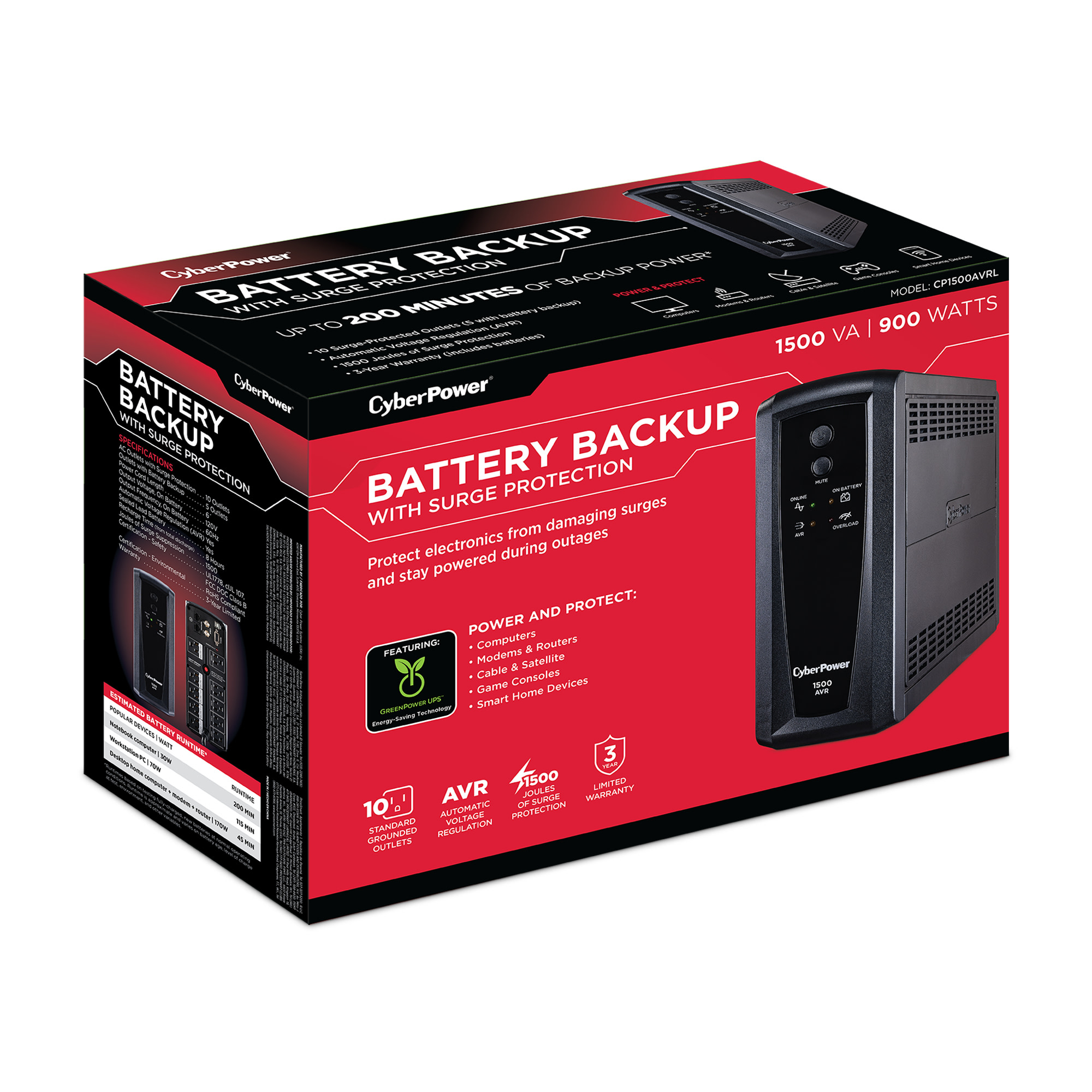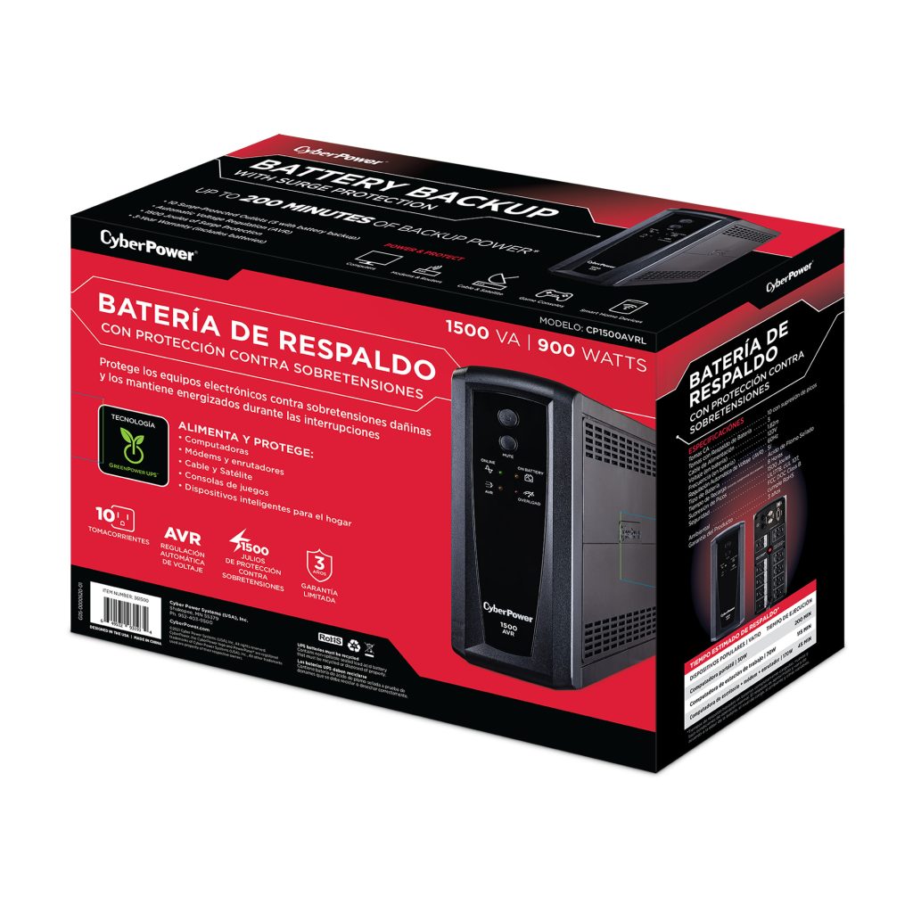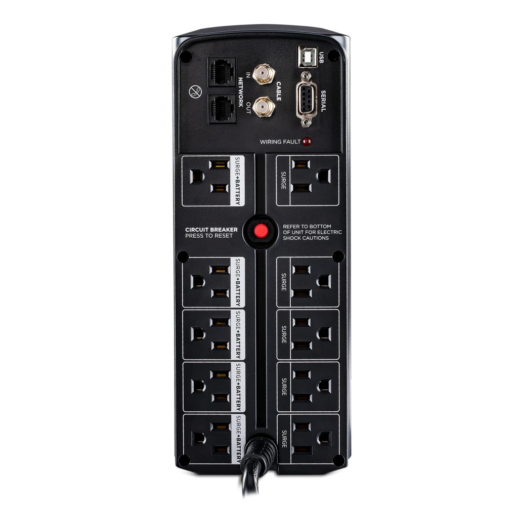 A mini-tower UPS with line interactive topology, the CyberPower AVR Series CP1500AVRL provides battery backup (using simulated sine wave output) and surge protection for desktop computers, workstations, networking devices, and home entertainment systems. During longer power outages, the CP1500AVRL delivers enough battery backup power to perform a graceful shutdown to protect against the loss of data and damage to electronics. It uses Automatic Voltage Regulation (AVR) to correct minor power fluctuations without switching to battery power, which extends battery life. AVR is essential in areas where power fluctuations occur frequently. The CP1500AVRL comes with a three-year warranty (including coverage of batteries) and a $500,000 Connected Equipment Guarantee.