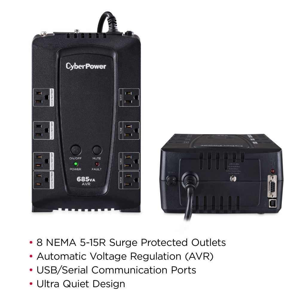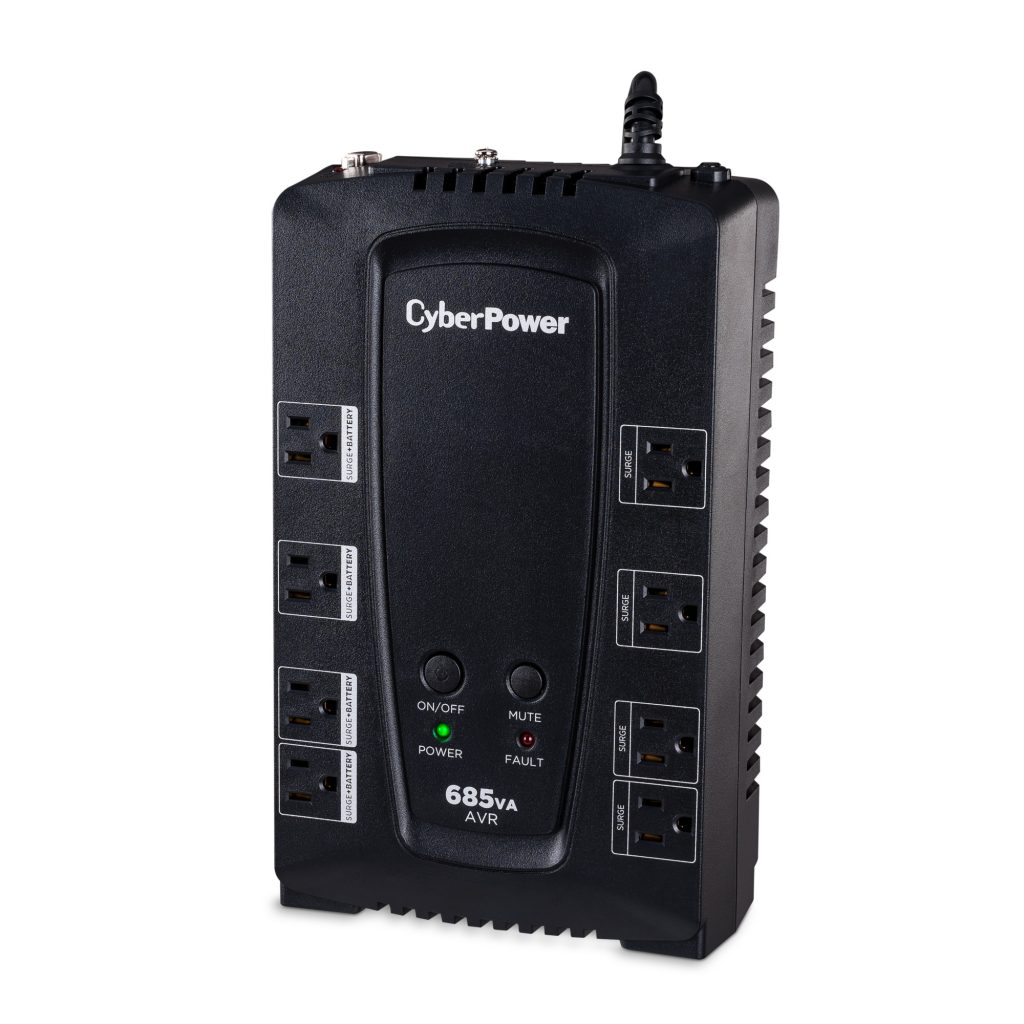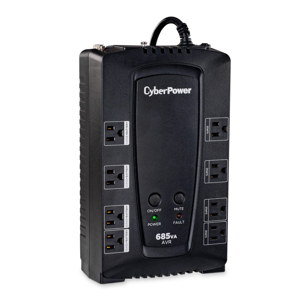 The CyberPower CP685AVRG uninterruptible power supply (UPS) system provides battery backup and surge protection for lightning-induced surges and other power events that can damage electronic equipment. This UPS, with line-interactive topology, uses simulated sine wave output to deliver battery backup to power connected electronics during a utility power failure. The unit has enough runtime to perform a graceful shutdown to protect against the loss of data and damage to valuable desktop computers, workstations, networking devices, and home entertainment systems.
