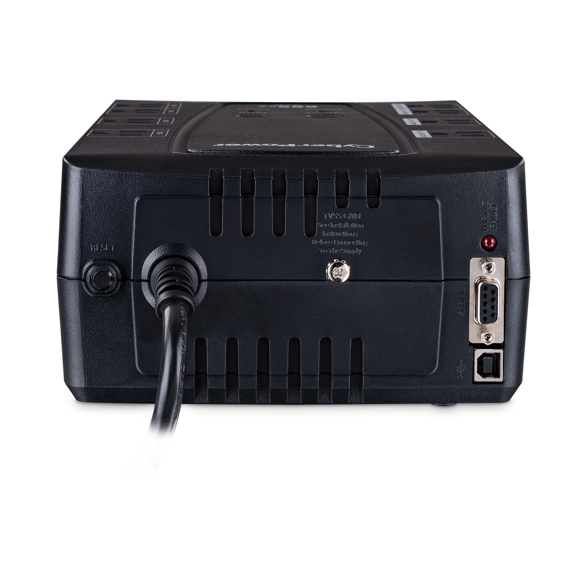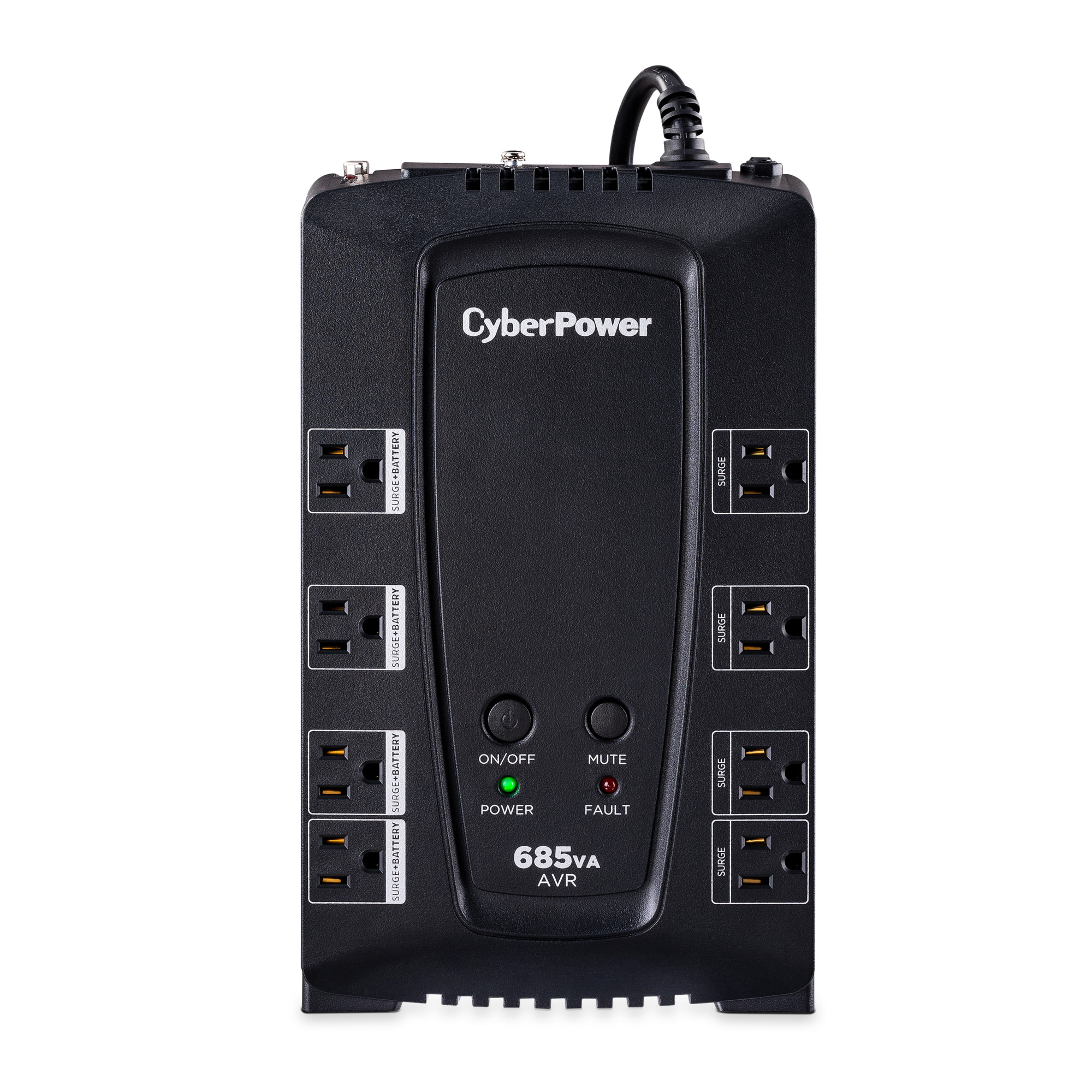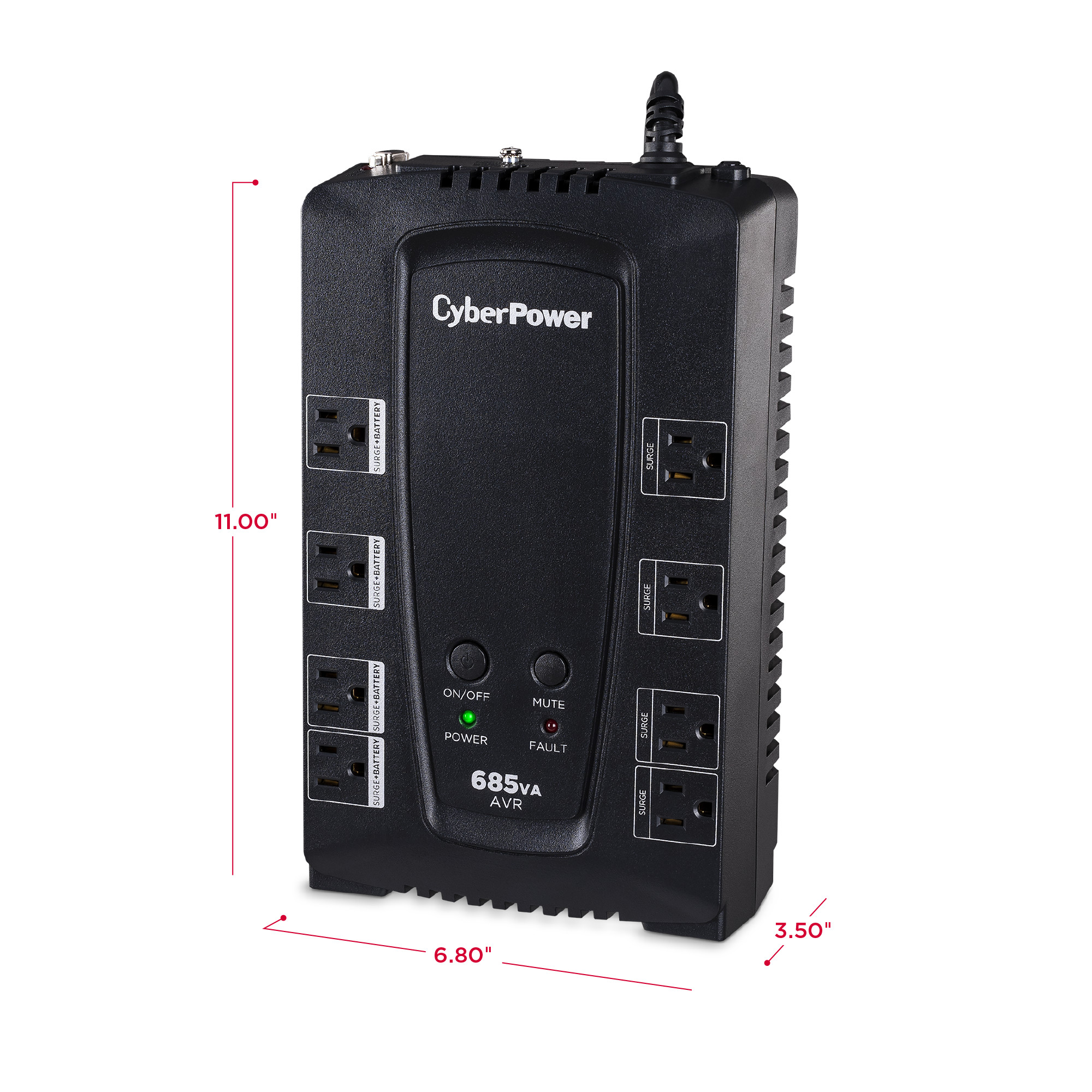 The CyberPower CP685AVRG uninterruptible power supply (UPS) system provides battery backup and surge protection for lightning-induced surges and other power events that can damage electronic equipment. This UPS, with line-interactive topology, uses simulated sine wave output to deliver battery backup to power connected electronics during a utility power failure. The unit has enough runtime to perform a graceful shutdown to protect against the loss of data and damage to valuable desktop computers, workstations, networking devices, and home entertainment systems.