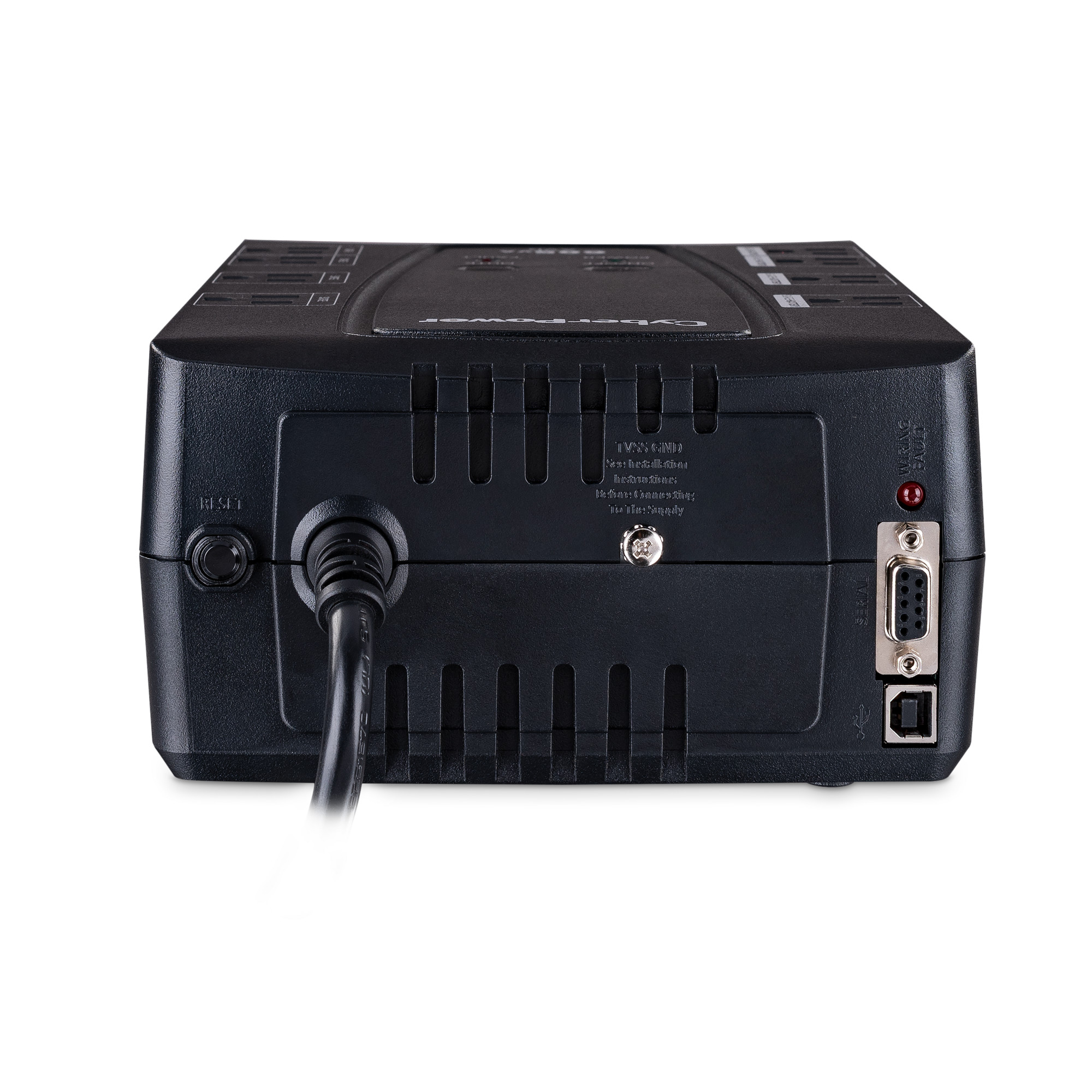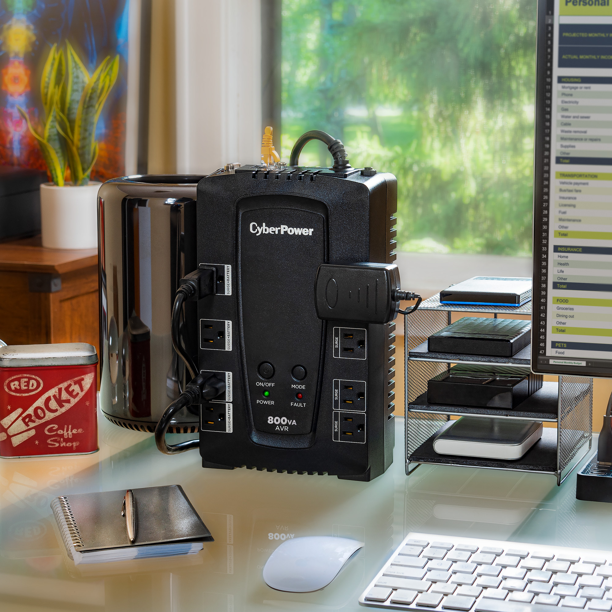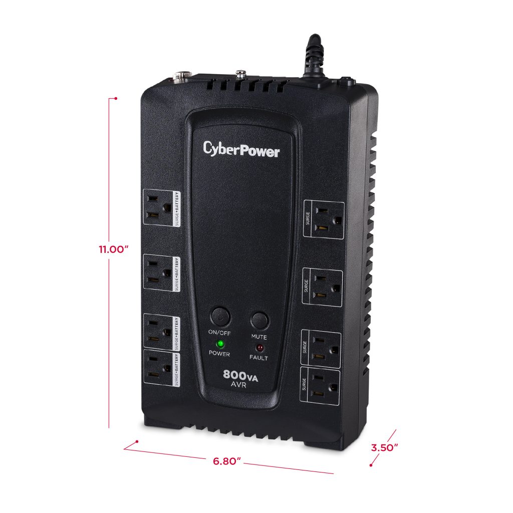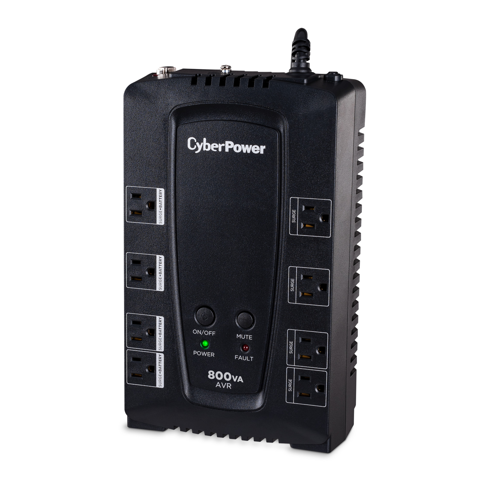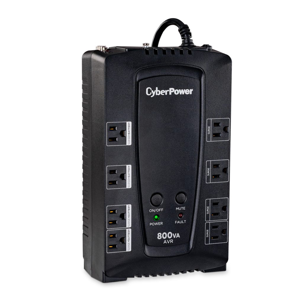 The CyberPower CP800AVR uninterruptible power supply (UPS) system provides battery backup and surge protection for lightning-induced surges and other power events that can damage electronic equipment. This UPS, with line-interactive topology, uses simulated sine wave output to deliver battery backup to power connected electronics during a utility power failure. The unit has enough runtime to perform a graceful shutdown to protect against the loss of data and damage to valuable desktop computers, workstations, networking devices, and home entertainment systems.