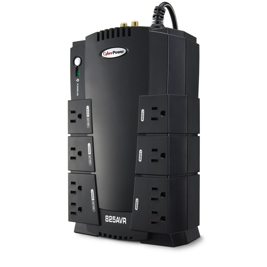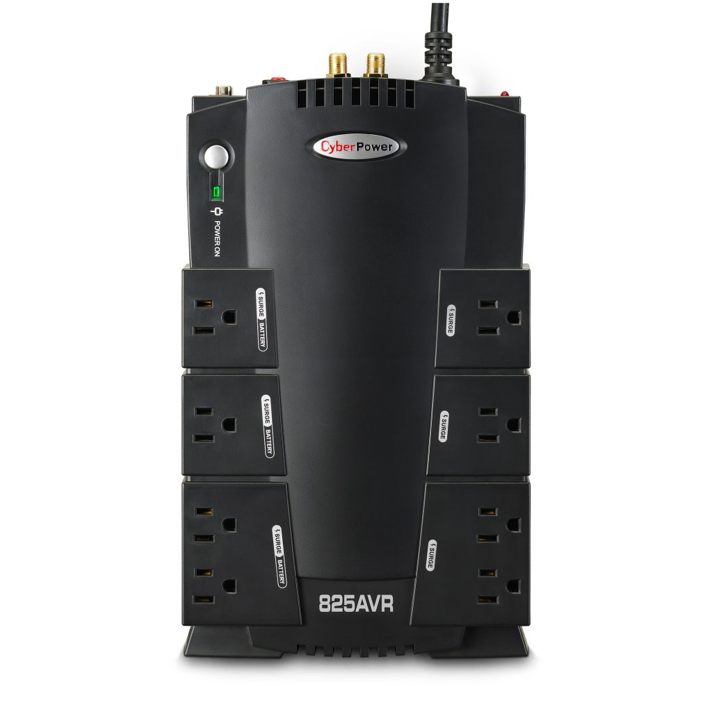 A compact UPS with line interactive topology, the CyberPower AVR Series CP825AVRG provides battery backup (using simulated sine wave output) and surge protection for mid- to upper-level office workstations, networks and home entertainment systems. The CP825AVRG uses Automatic Voltage Regulation (AVR) to correct minor power fluctuations without switching to battery power, which extends battery life. AVR is essential in areas where power fluctuations occur frequently. The CP825AVRG comes with a three-year warranty (including coverage of batteries) and a $200,000 Connected Equipment Guarantee.
