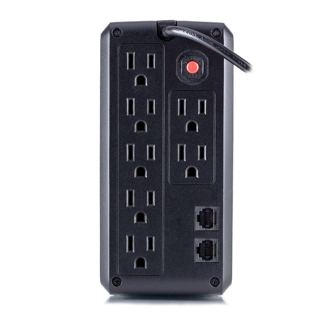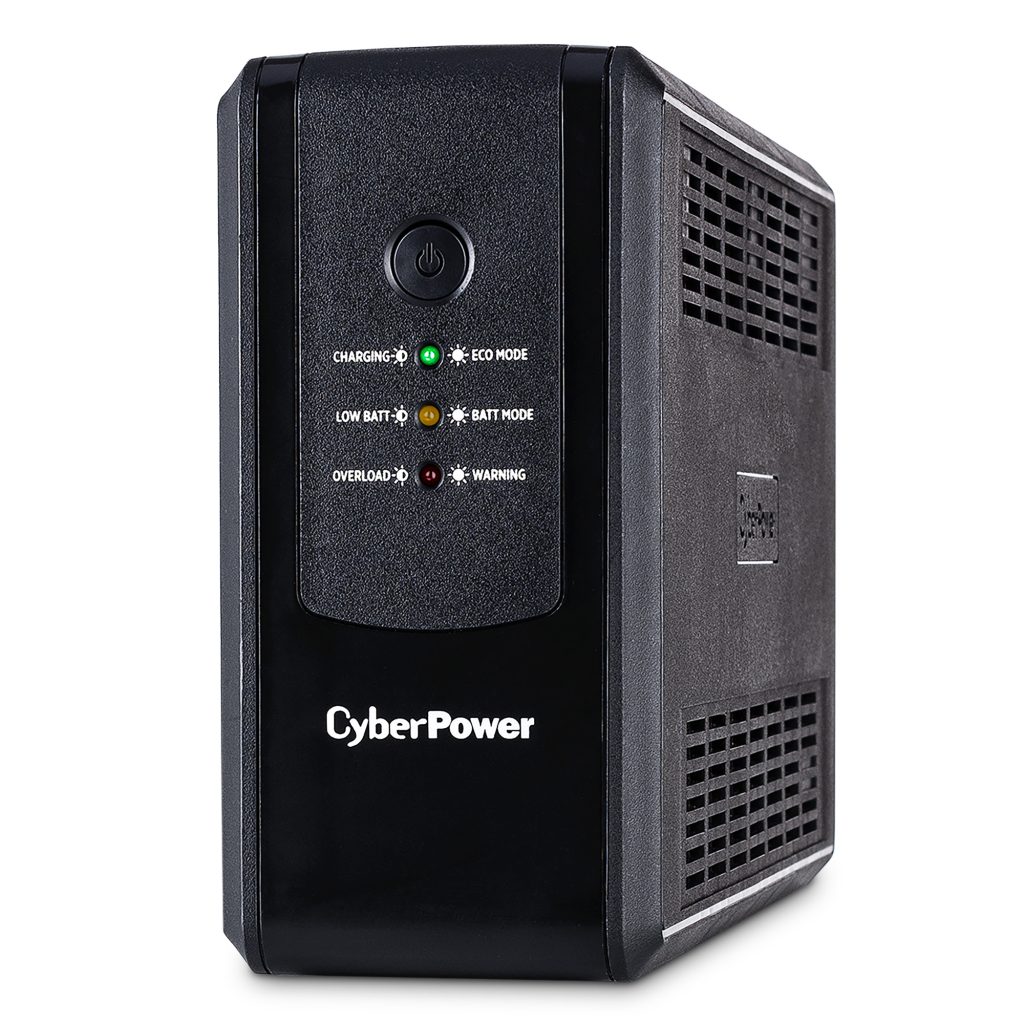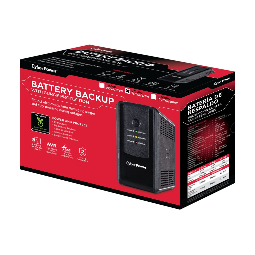 A compact UPS with line interactive topology, the CyberPower UT750G provides battery backup (using simulated sine wave output) and surge protection for desktop computers, workstations, networking devices, and home entertainment systems. The UT750G uses Automatic Voltage Regulation (AVR) to correct minor power fluctuations without switching to battery power, which extends battery life. AVR is essential in areas where power fluctuations occur frequently.