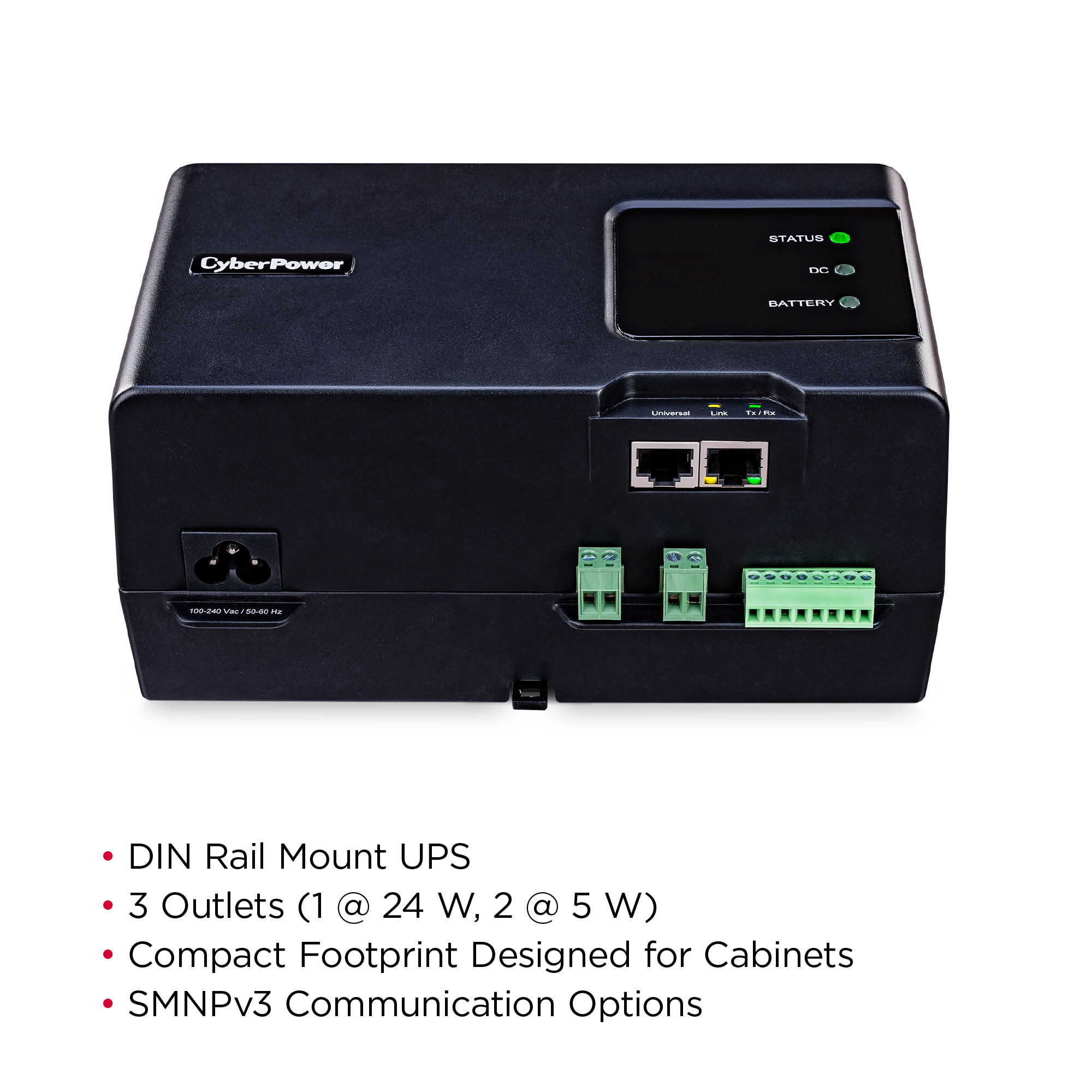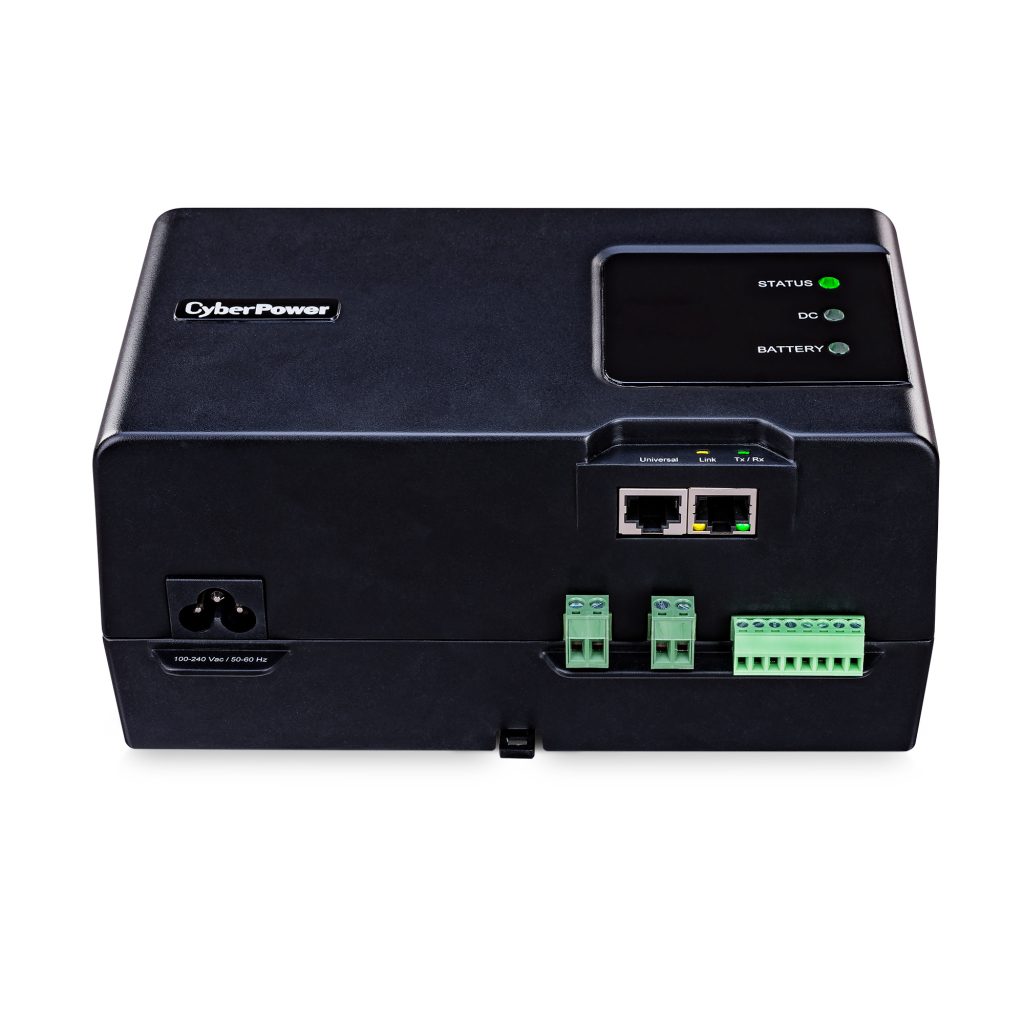 A DIN Rail Mount UPS with line interactive topology, the CyberPower BAS34U24V provides DC power supply, surge protection battery and backup for compact, embedded controller/server platforms, industrial computers and networking devices. Designed for building automation systems (BAS), energy management systems (EMS) and other types of facility controllers and remote facility monitors, the UPS supports distributed computing with up to 4 hours of extended battery runtime, among other industry-leading features.