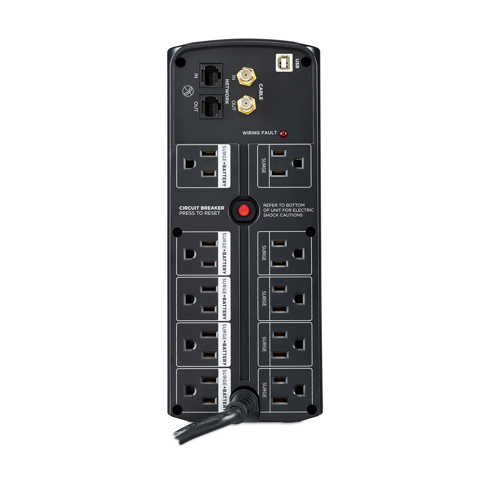 Two USB Type-A charge ports power portable devices such as mobile phones and tablets, even during a utility power failure. The BL1250U comes with a three-year warranty (including coverage of batteries) and a $400,000 Connected Equipment Guarantee.