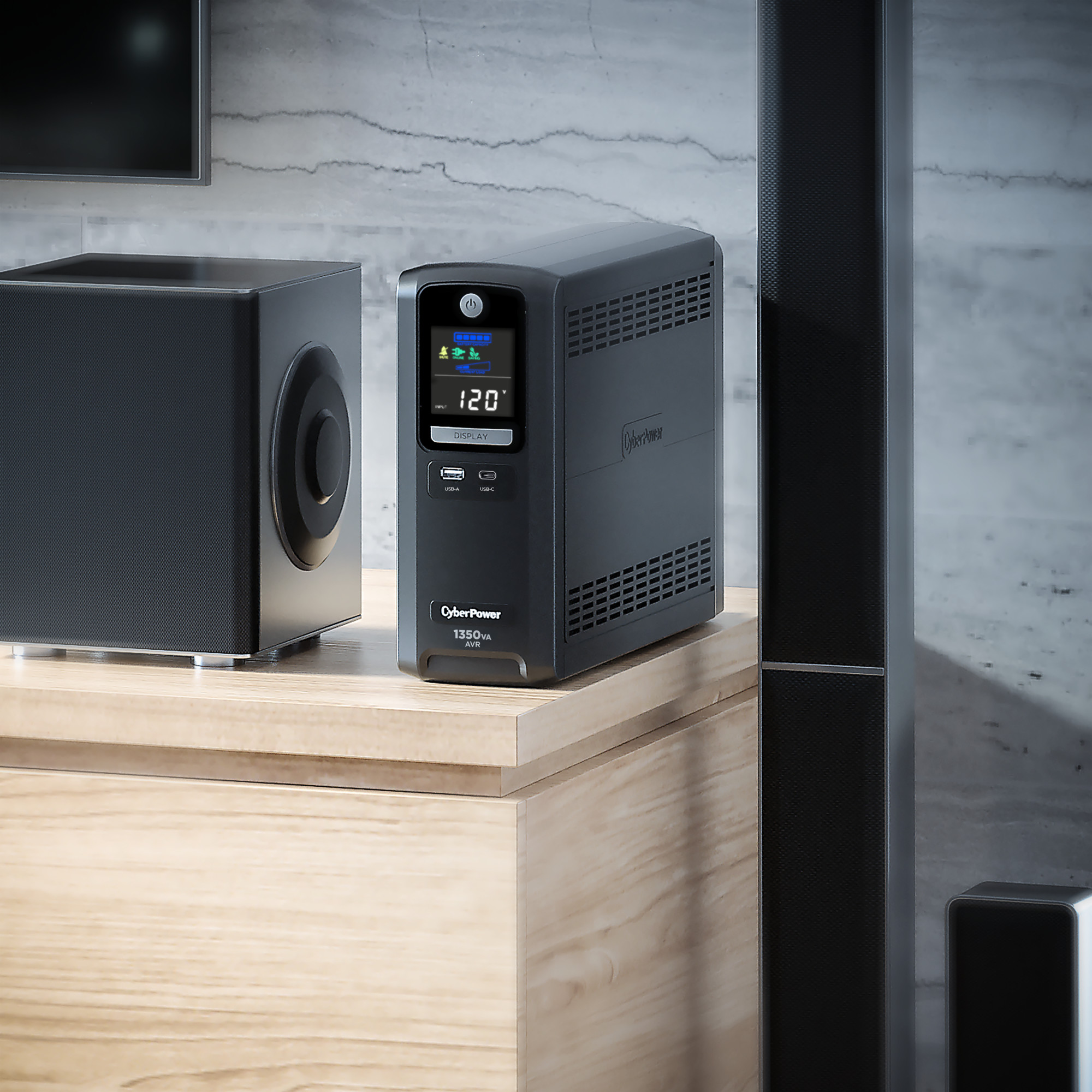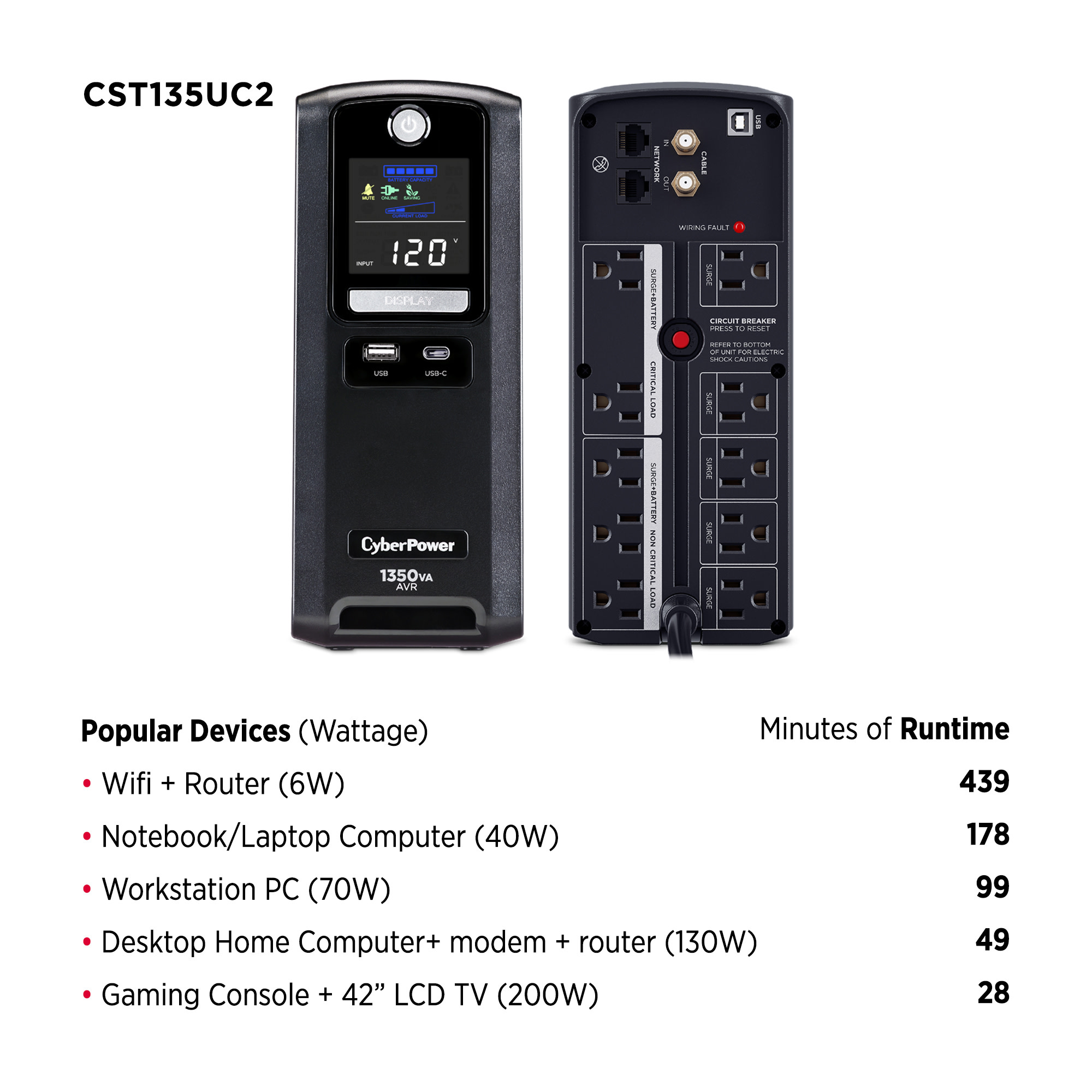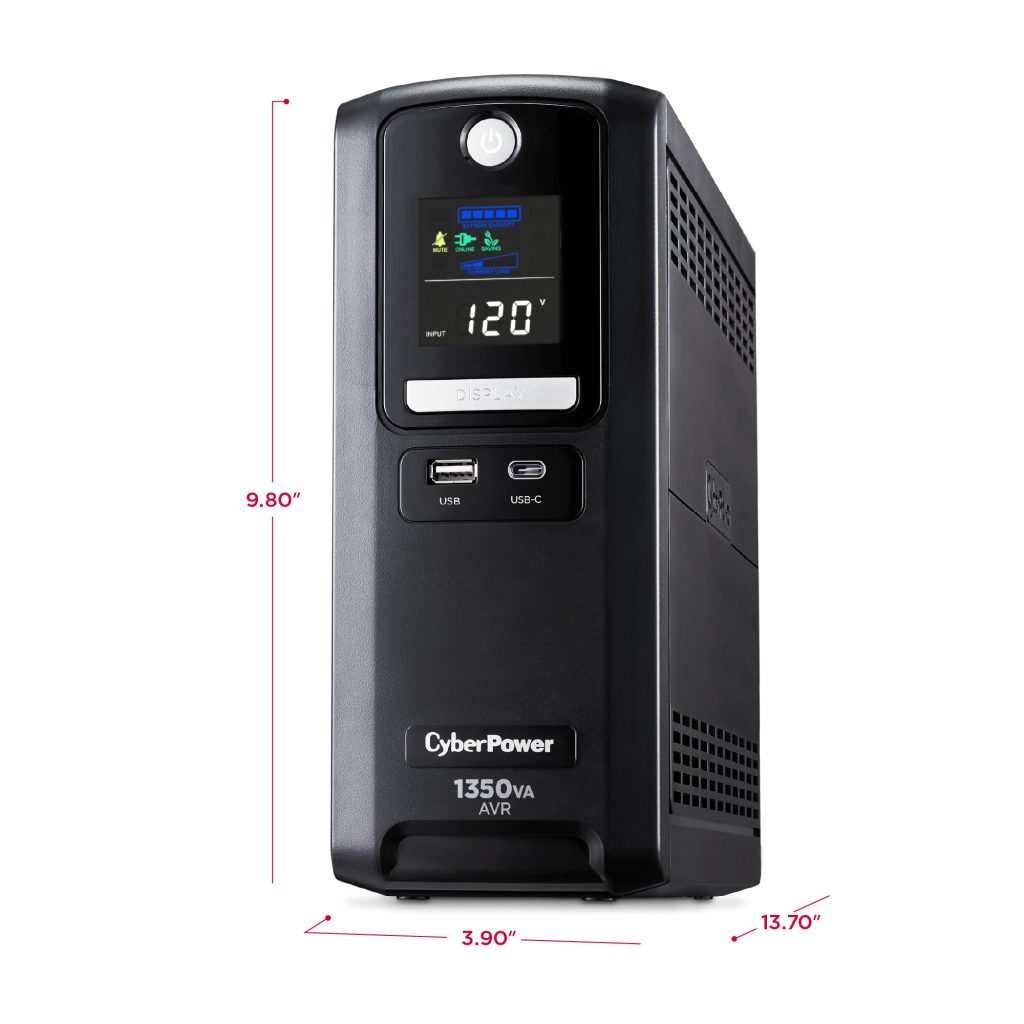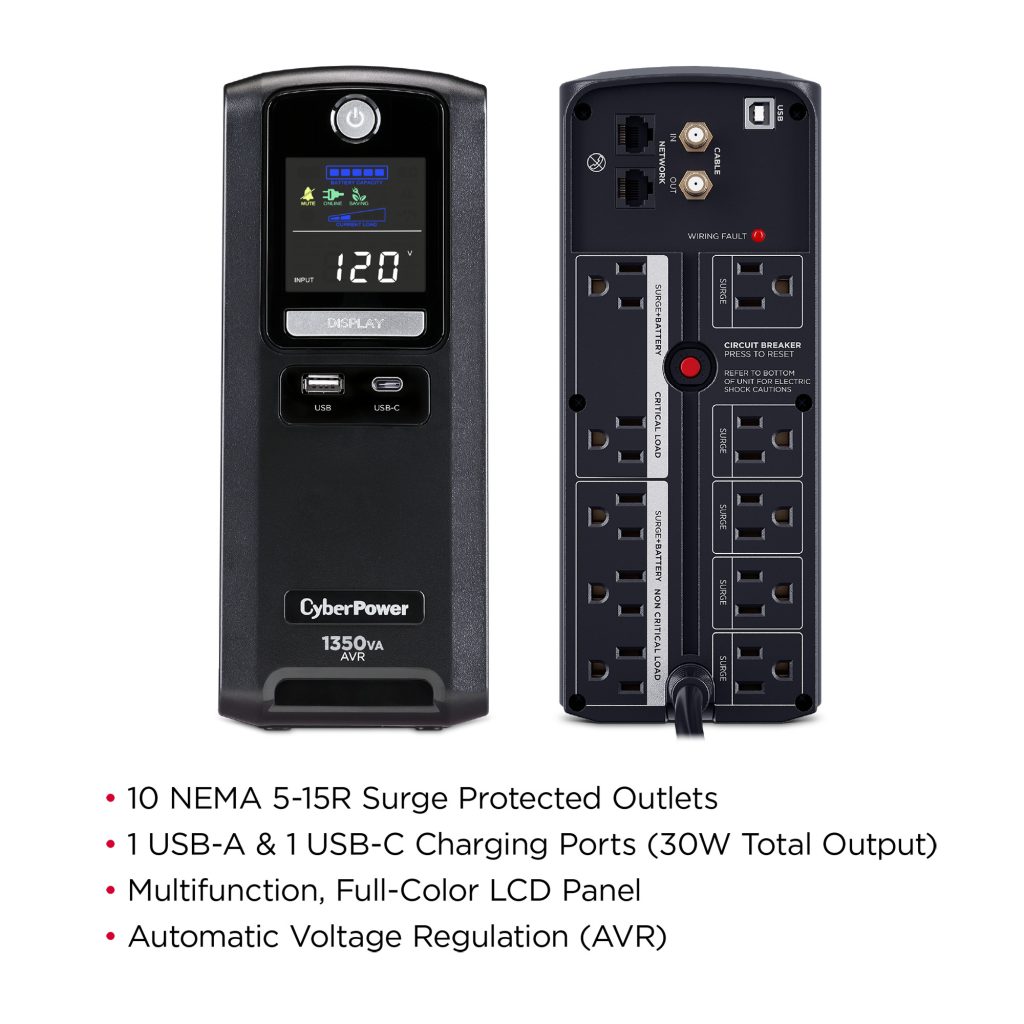 A mini-tower UPS with line interactive topology, the CyberPower Intelligent LCD CST135UC2 provides battery backup (using simulated sine wave output) and surge protection for desktop computers, workstations, networking devices, and home entertainment systems. The CST135UC2 uses Automatic Voltage Regulation (AVR) to correct minor power fluctuations without switching to battery power, which extends battery life. AVR is essential in areas where power fluctuations occur frequently.