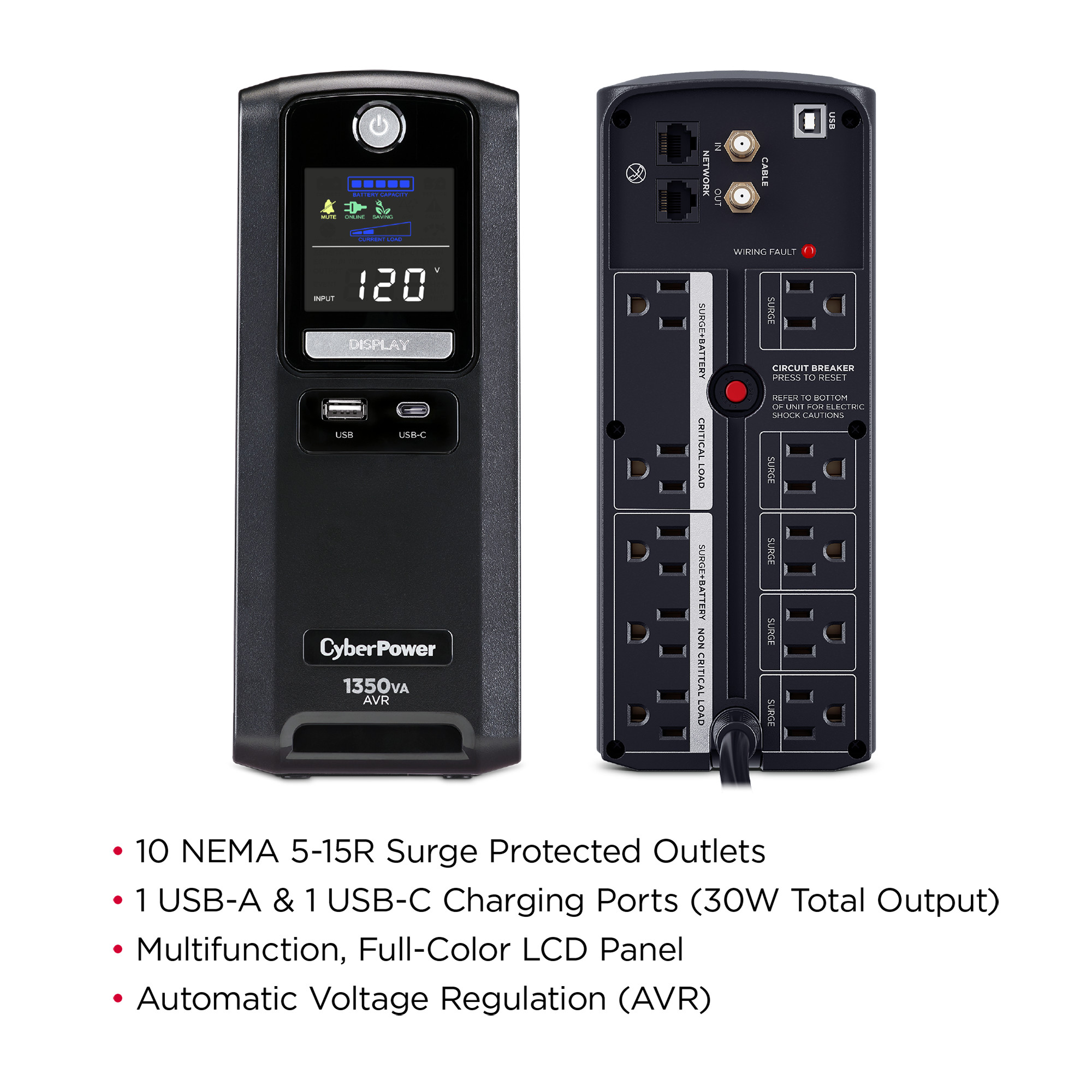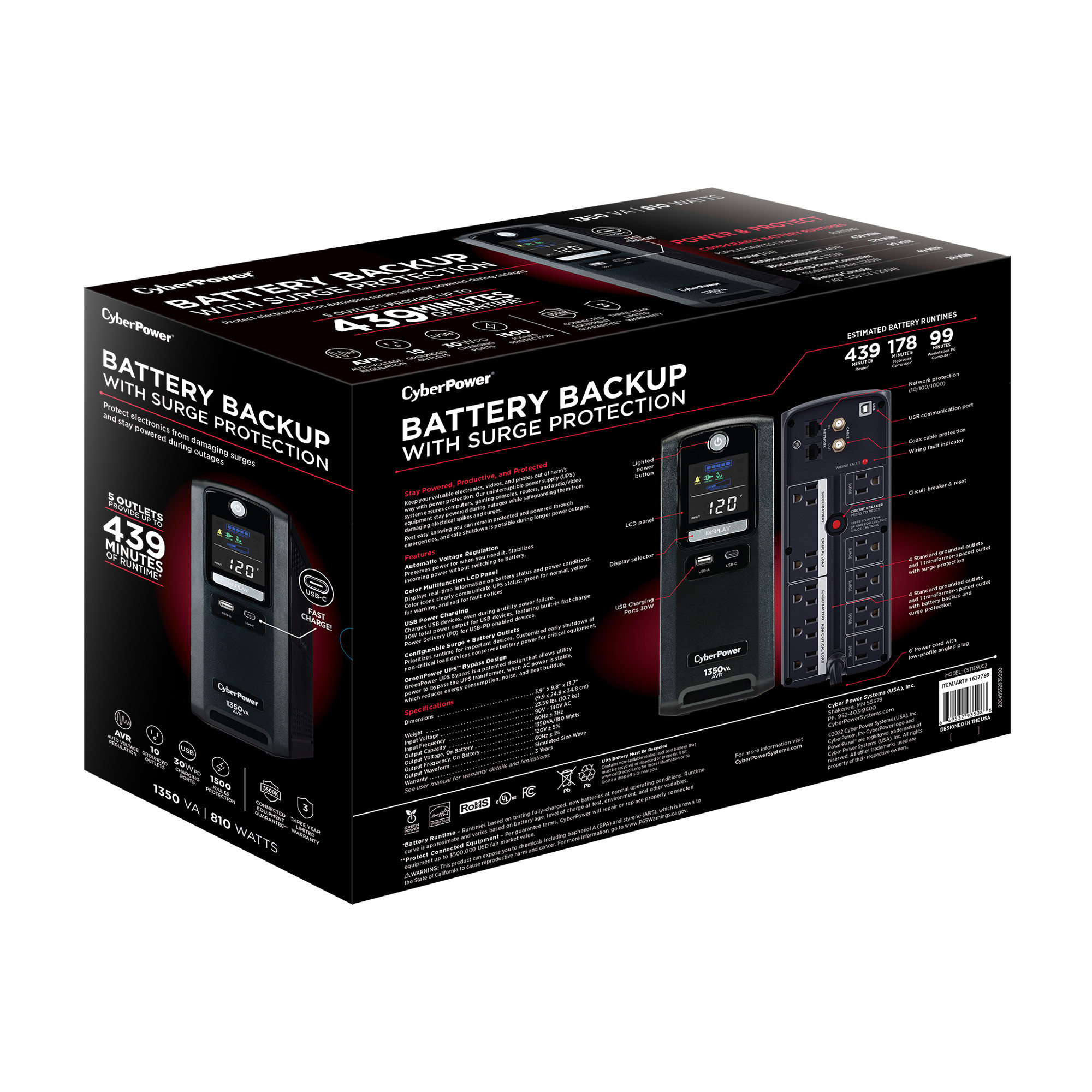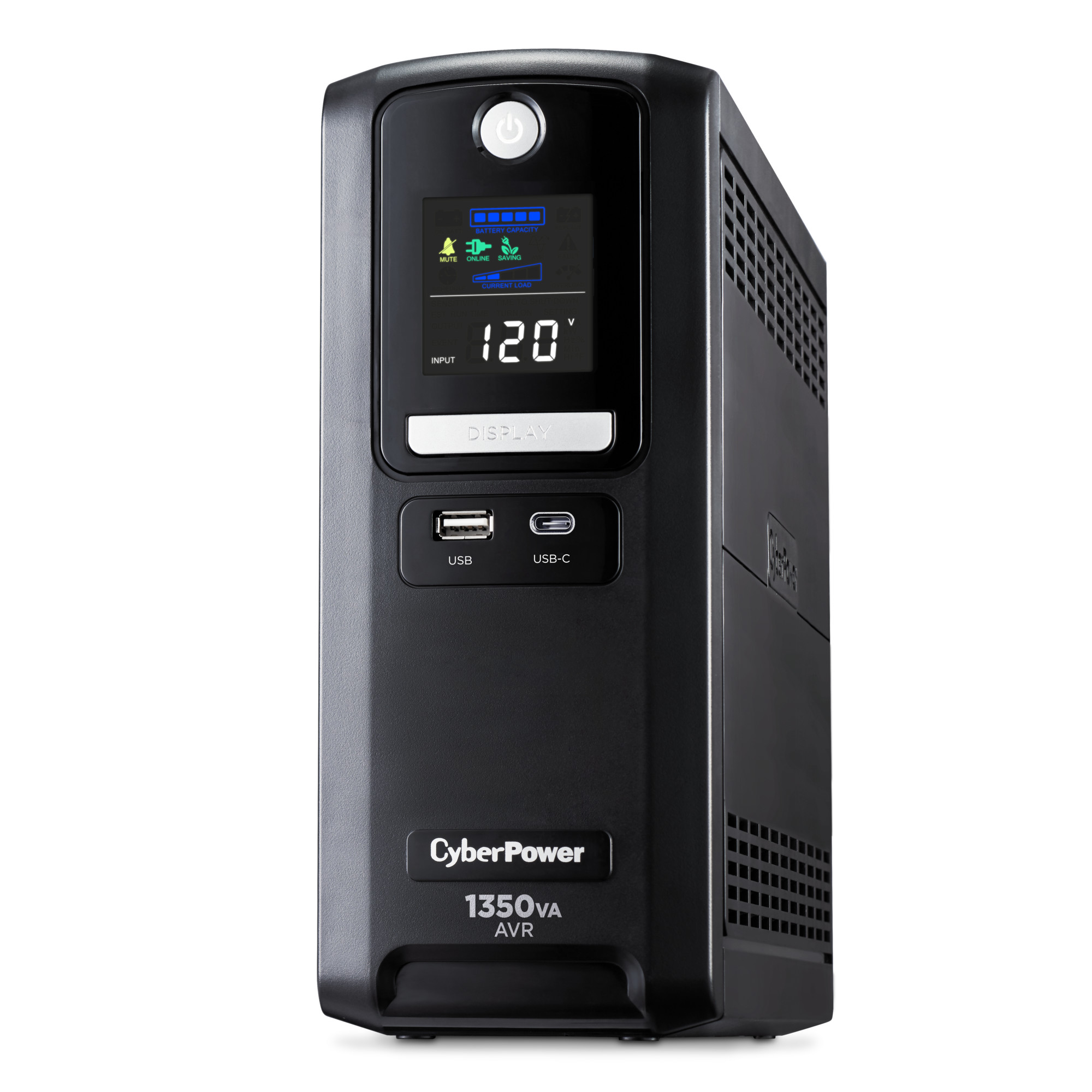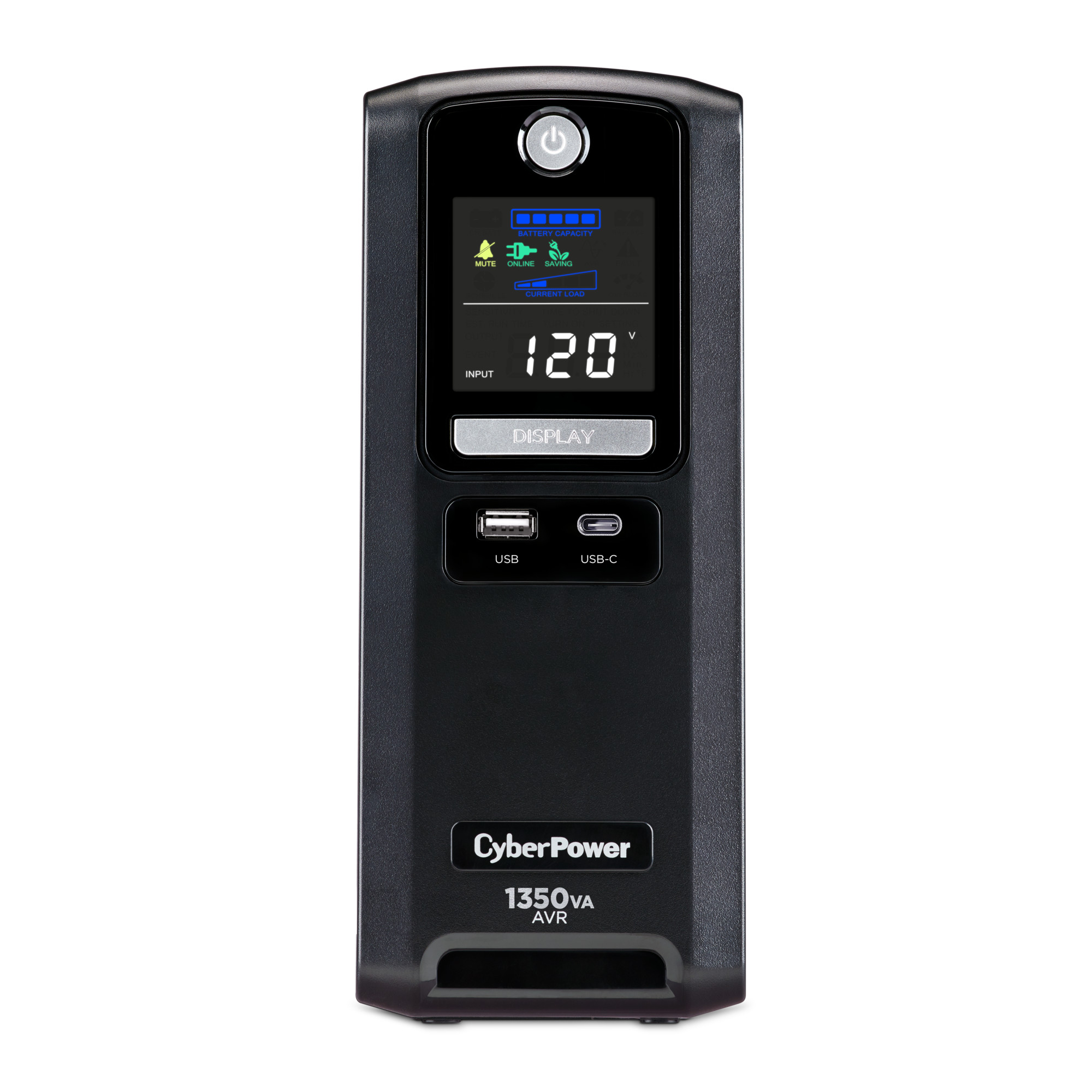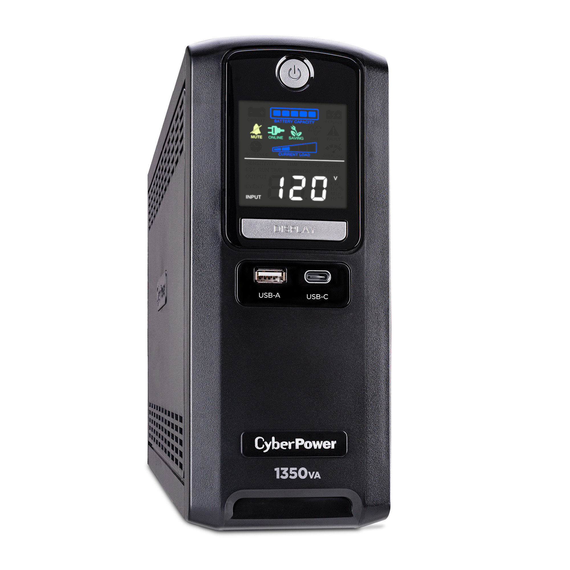 Two USB charge ports (one Type-A and one Type-C) power portable devices such as mobile phones and tablets, even during a utility power failure. An advanced multifunction control panel with a color LCD clearly communicates UPS status with green, yellow, or red icons, and the configurable battery + surge outlets allow prioritization of runtime for critical equipment. The CST135UC2 comes with a three-year warranty (including coverage of batteries) and a $500,000 Connected Equipment Guarantee.