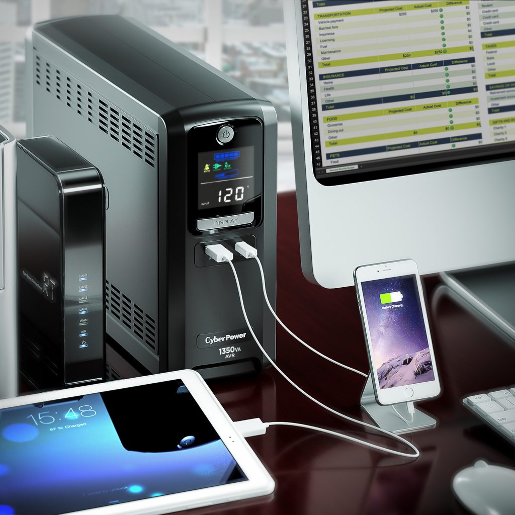 Many CyberPower UPS units have two sets of outlets. One set is labeled “Battery/Surge” and one set is labeled “Surge”. The outlets labeled “Battery/Surge” are the outlets that will receive battery power during a power failure. You should plug your computer and monitor into these outlets and any externally powered critical data storage device.