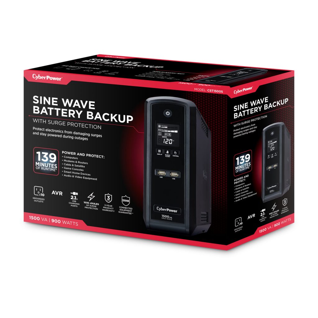 Two Type-A USB charge ports power portable devices such as mobile phones and tablets, even during a utility power failure. The CST1500S comes with a three-year warranty (including coverage of batteries) and a $500,000 Connected Equipment Guarantee.