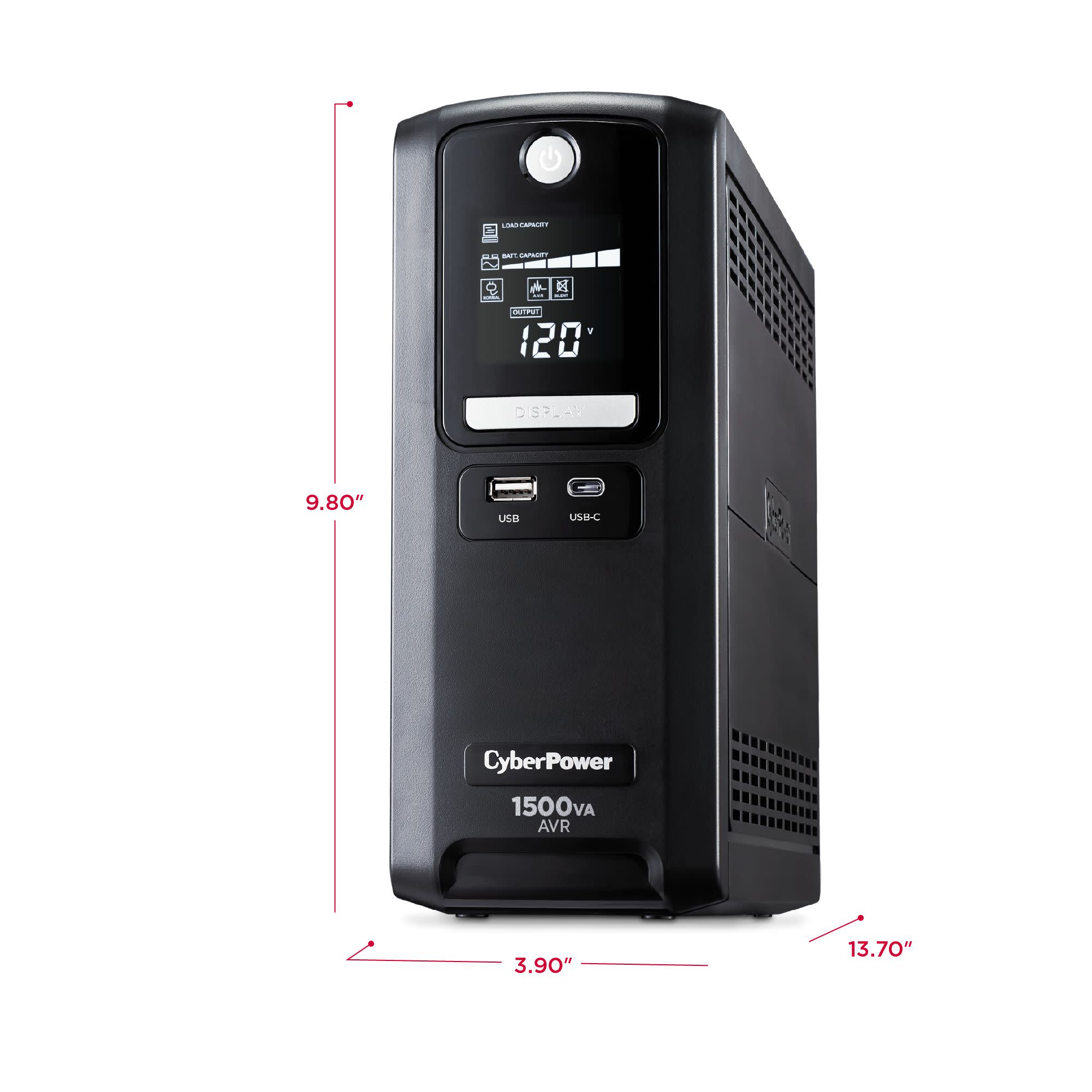 A mini-tower UPS with line interactive topology, the CyberPower CST150UC-FC provides battery backup (using simulated sine wave output) and surge protection for desktop computers, workstations, networking equipment, smart home devices, and home entertainment systems.