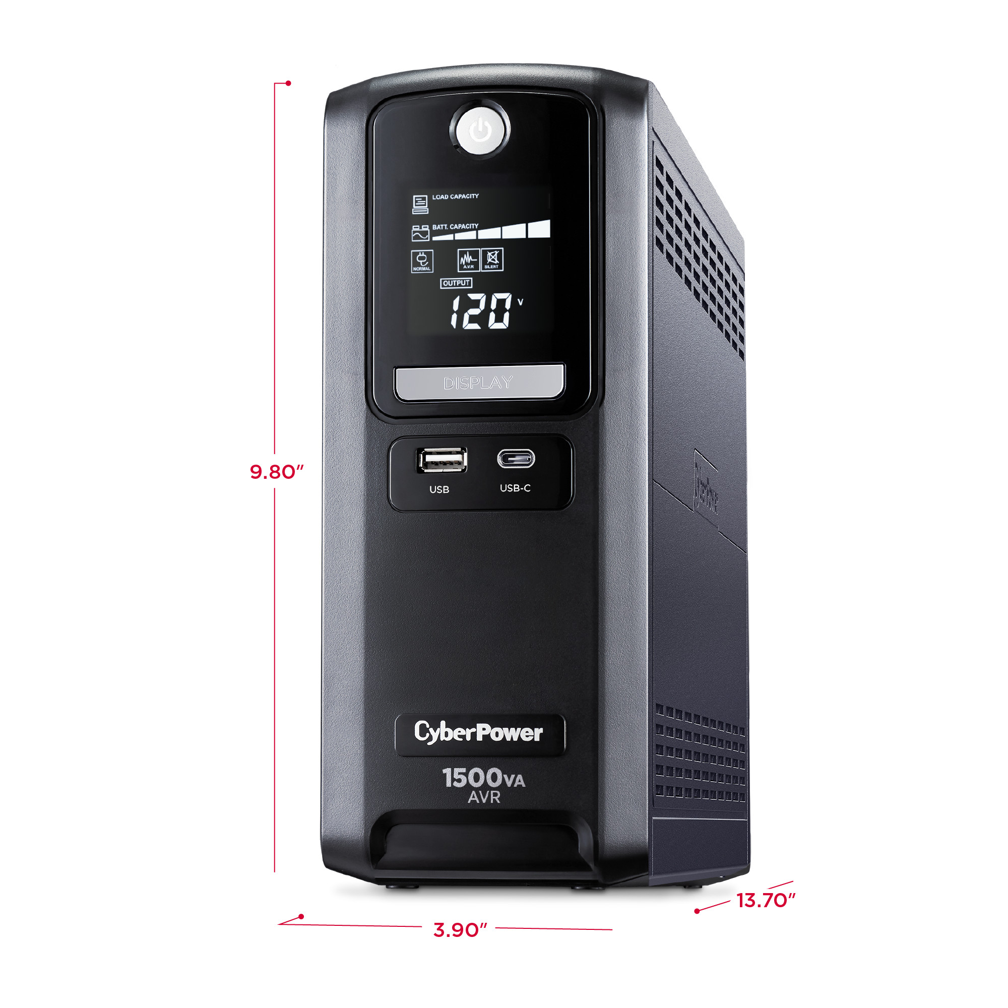 The CST150UC uses Automatic Voltage Regulation (AVR) to correct minor power fluctuations without switching to battery power, which extends battery life. AVR is essential in areas where power fluctuations occur frequently. Two USB charge ports (one Type-A and one Type-C) power portable devices such as mobile phones and tablets, even during a utility power failure.