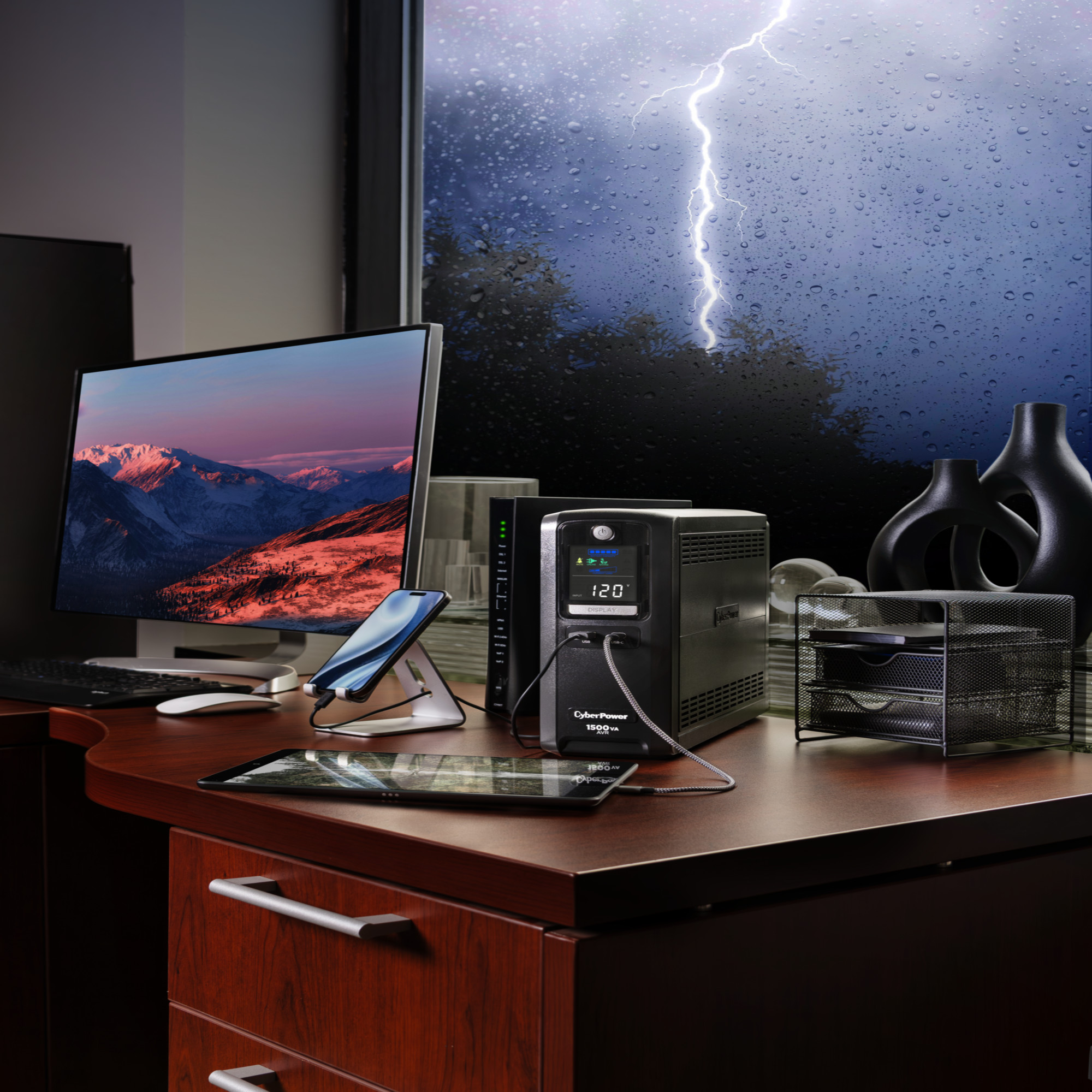 The CST150UC2 uses Automatic Voltage Regulation (AVR) to correct minor power fluctuations without switching to battery power, which extends battery life. AVR is essential in areas where power fluctuations occur frequently. Two USB ports (one Type-A and one Type-C) charge portable devices such as mobile phones and tablets, even during a utility power failure.