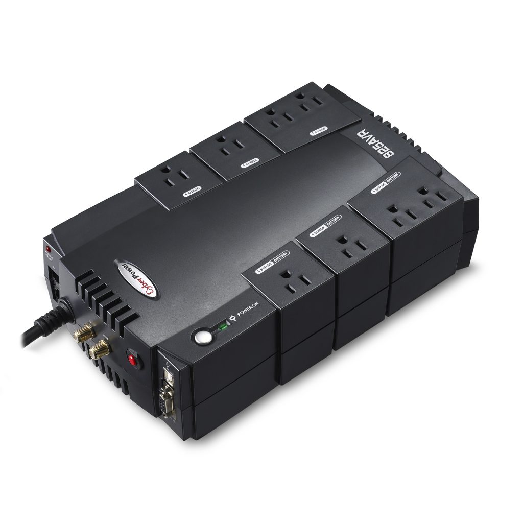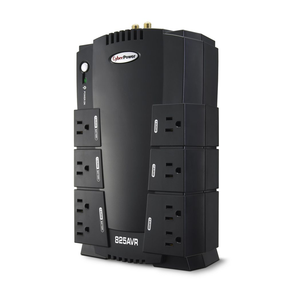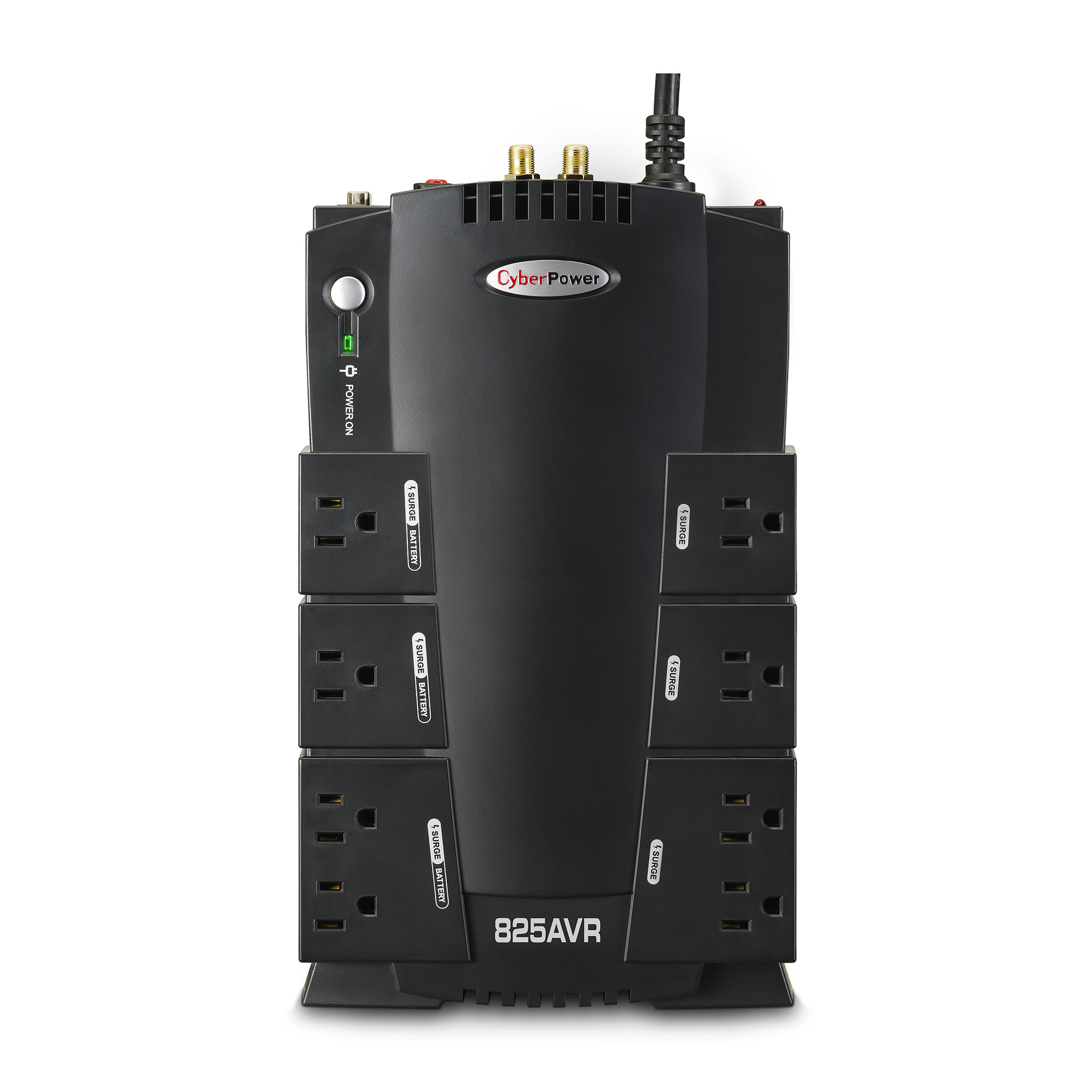 The CyberPower LE825G uninterruptible power supply (UPS) safeguards small office workstations, networking devices, and home entertainment systems by providing battery backup (using simulated sine wave output) and surge protection during power interruptions. Data line protection is included for phone/network (RJ11), Ethernet (RJ45), and cable/coaxial (RG6). This UPS offers connectivity via one HID-compliant USB port and one DB9 serial port. The LE825G has a capacity of 825 VA/450 Watts, eight NEMA 5-15R receptacles-four widely spaced to accommodate transformer-based plugs. Its maintenance-free battery is user-replaceable.
