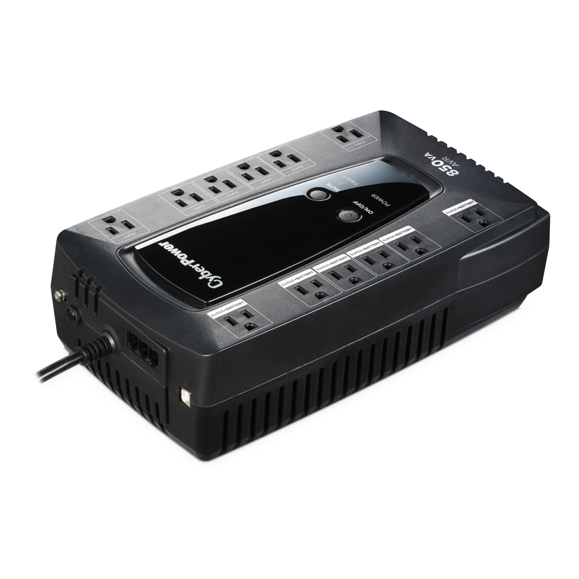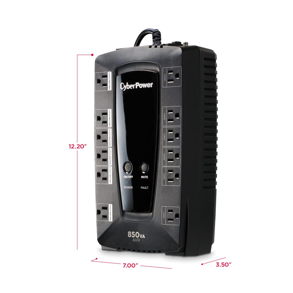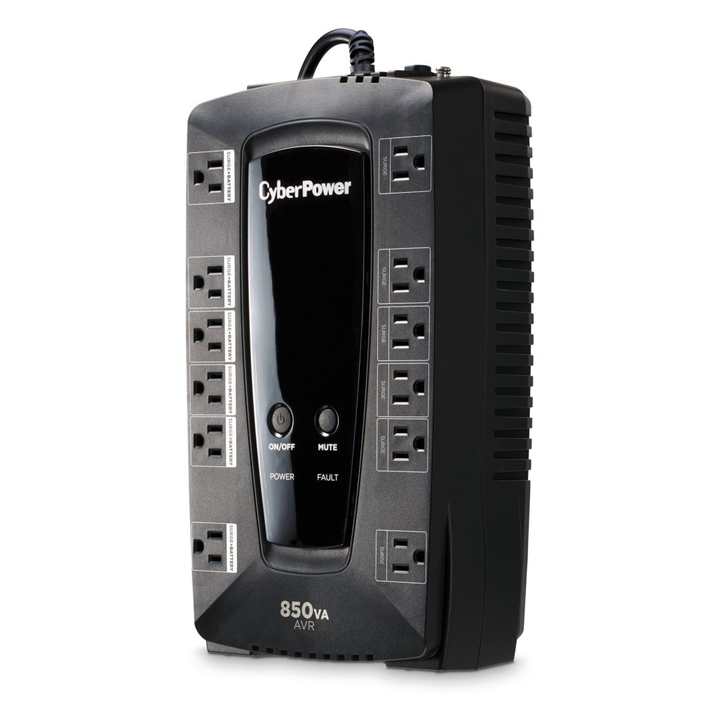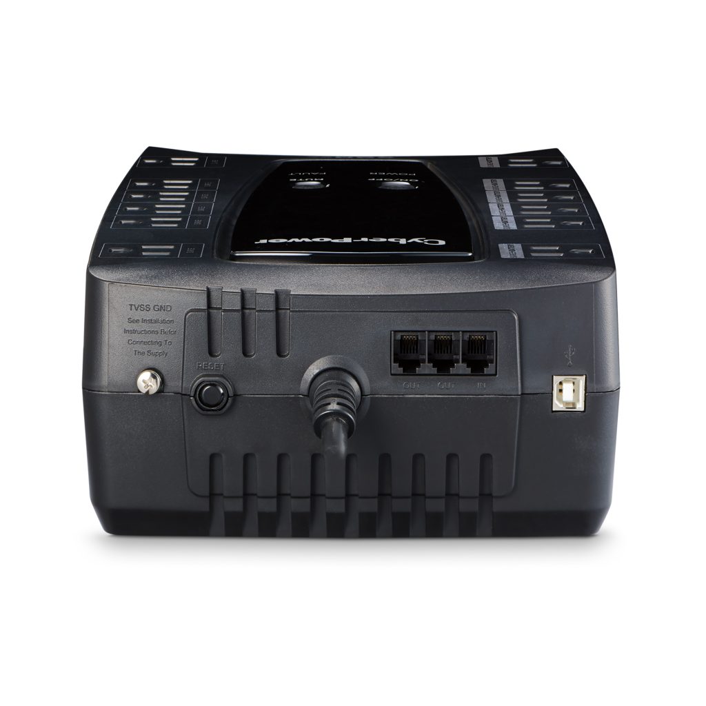 The CyberPower LE850G Battery Backup/ uninterruptible power supply (UPS) with line interactive topology safeguards small office workstations, networking devices, and home entertainment systems by providing battery power during power interruptions and surge protection. The LE850G uses Automatic Voltage Regulation (AVR) to correct minor power fluctuations without switching to battery power, which extends battery life. AVR is essential in areas where power fluctuations occur frequently. Data line protection is included for phone/network (RJ11) lines. This UPS offers connectivity via one HID-compliant USB port. The LE850G has a capacity of 850 VA/460 Watts and includes twelve outlets (four widely spaced) to accommodate large transformer plugs. Its maintenance-free battery is user-replaceable.
