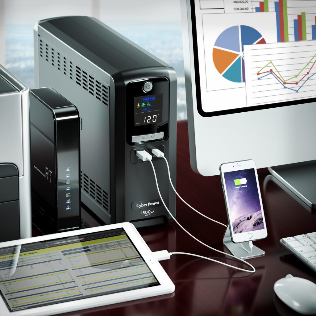 The LX1325GU uses Automatic Voltage Regulation (AVR) to correct minor power fluctuations without switching to battery power, which extends battery life. AVR is essential in areas where power fluctuations occur frequently. Two USB charge ports power portable devices such as mobile phones and tablets, even during a utility power failure.