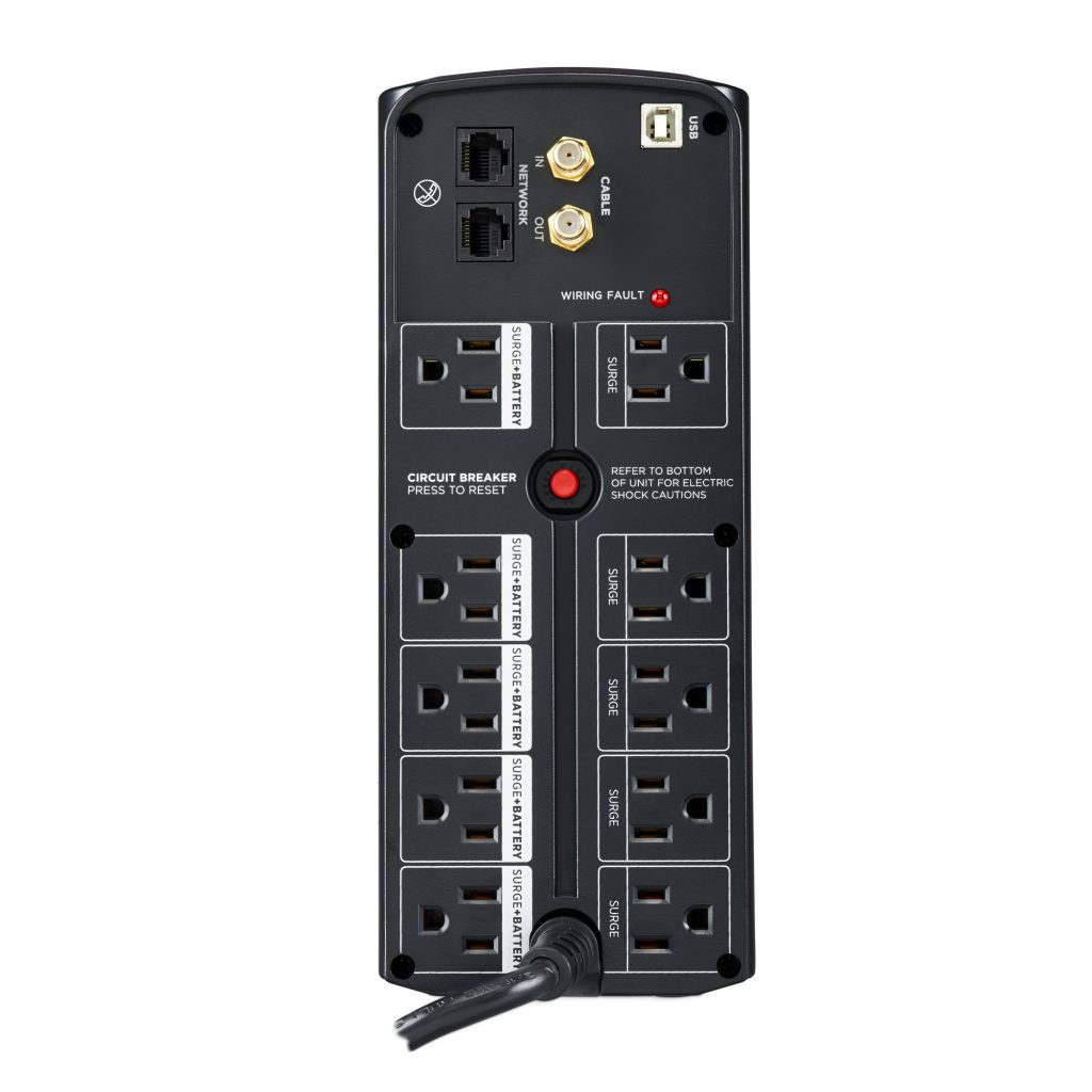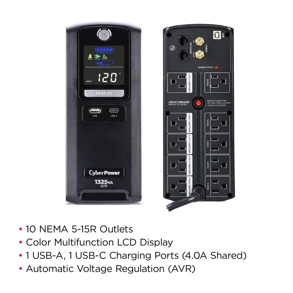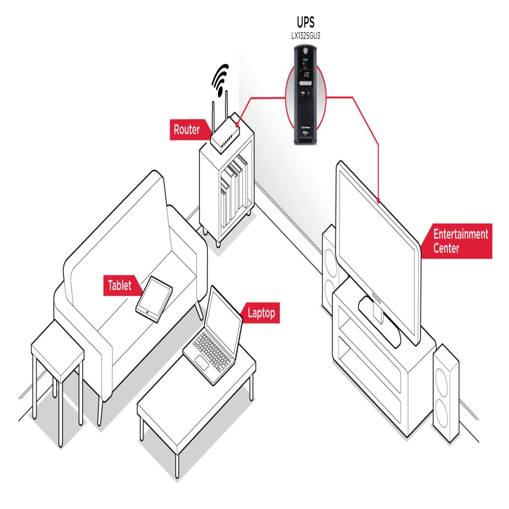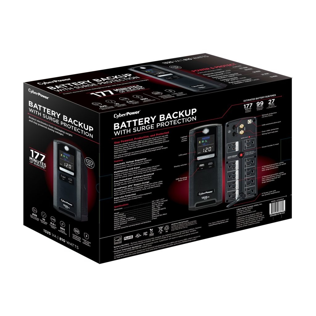 A mini-tower UPS with line interactive topology, the CyberPower LX1325GU3 provides battery backup (using simulated sine wave output) and surge protection for desktop computers, workstations, networking equipment, smart home devices, and home entertainment systems.