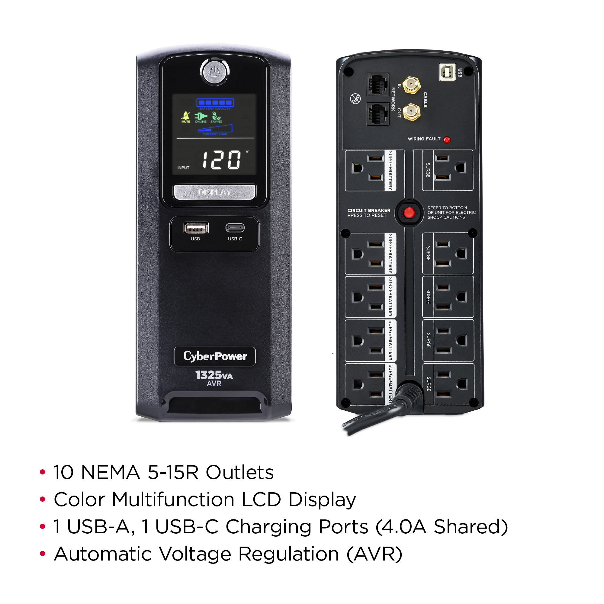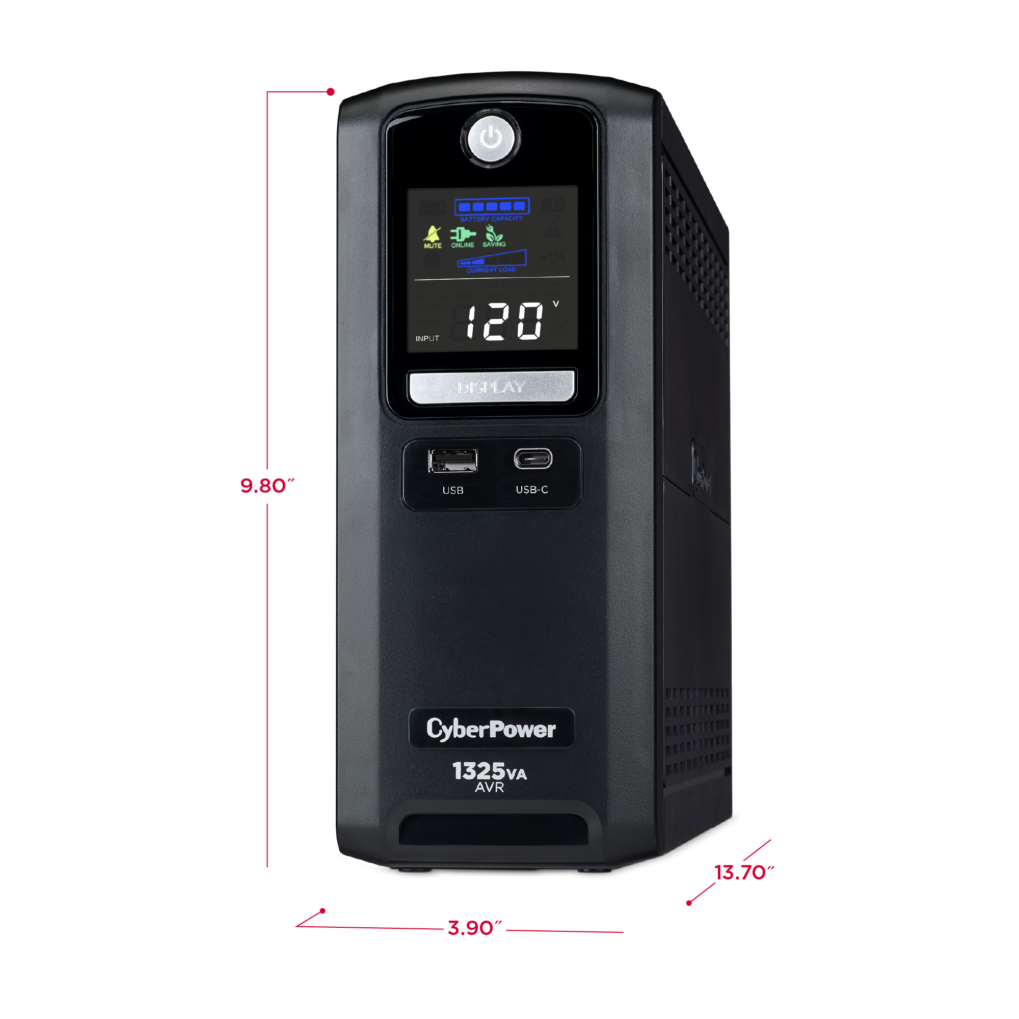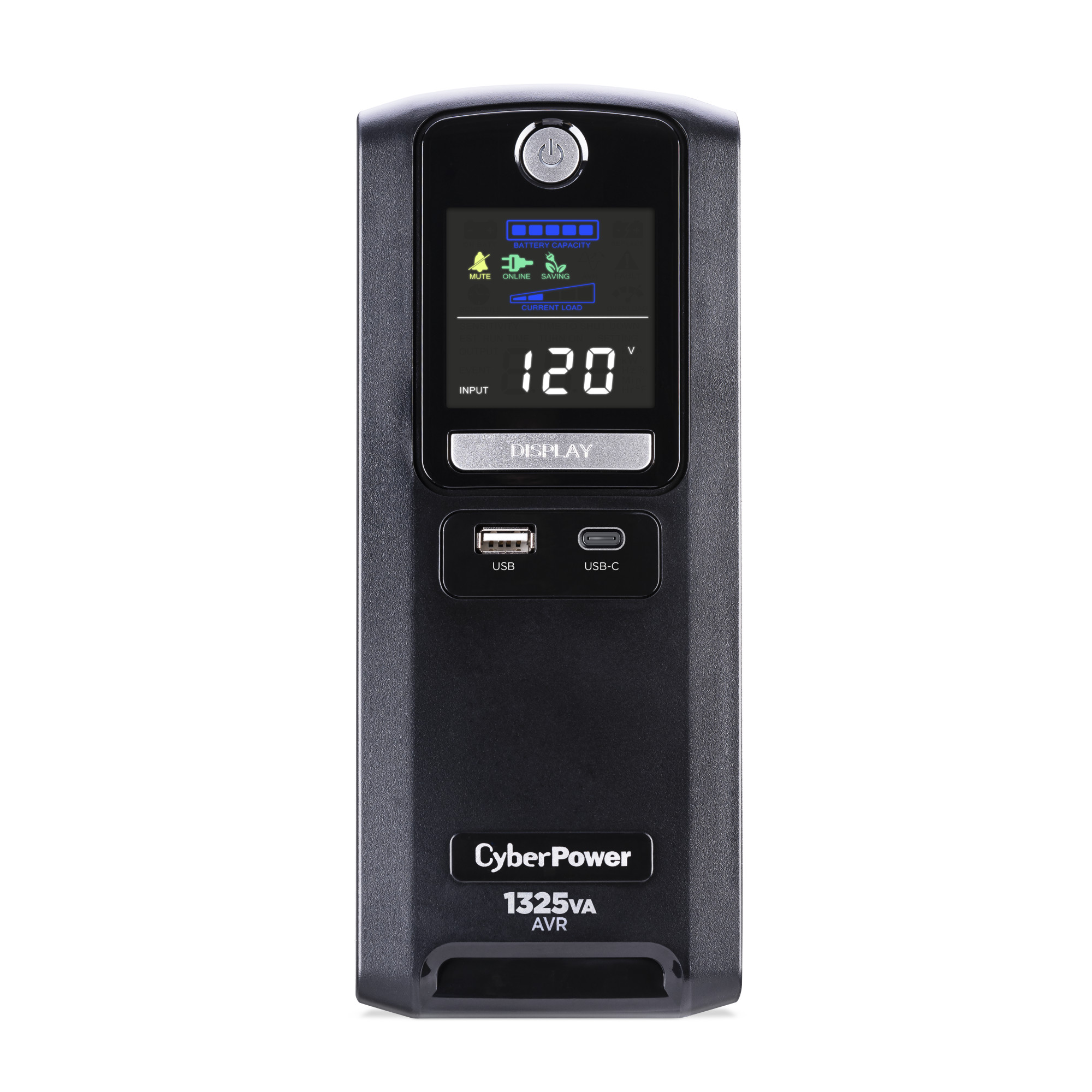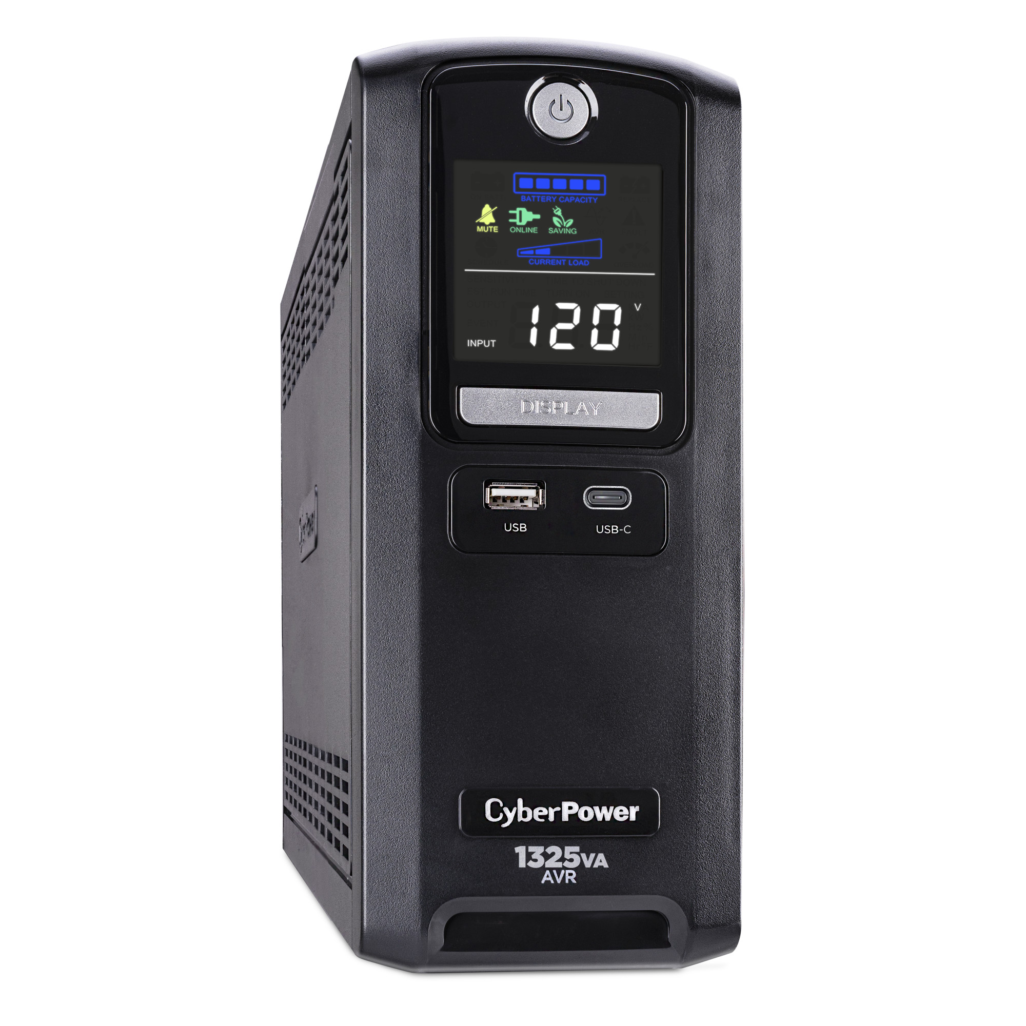 The LX1325GU3 uses Automatic Voltage Regulation (AVR) to correct minor power fluctuations without switching to battery power, which extends battery life. AVR is essential in areas where power fluctuations occur frequently. The LX1325GU3 features an advanced multifunction control panel with a color LCD to quickly confirm status and alerts at-a-glance. Two USB charge ports (one Type-A and one Type-C) power portable devices such as mobile phones and tablets, even during a utility power failure.
