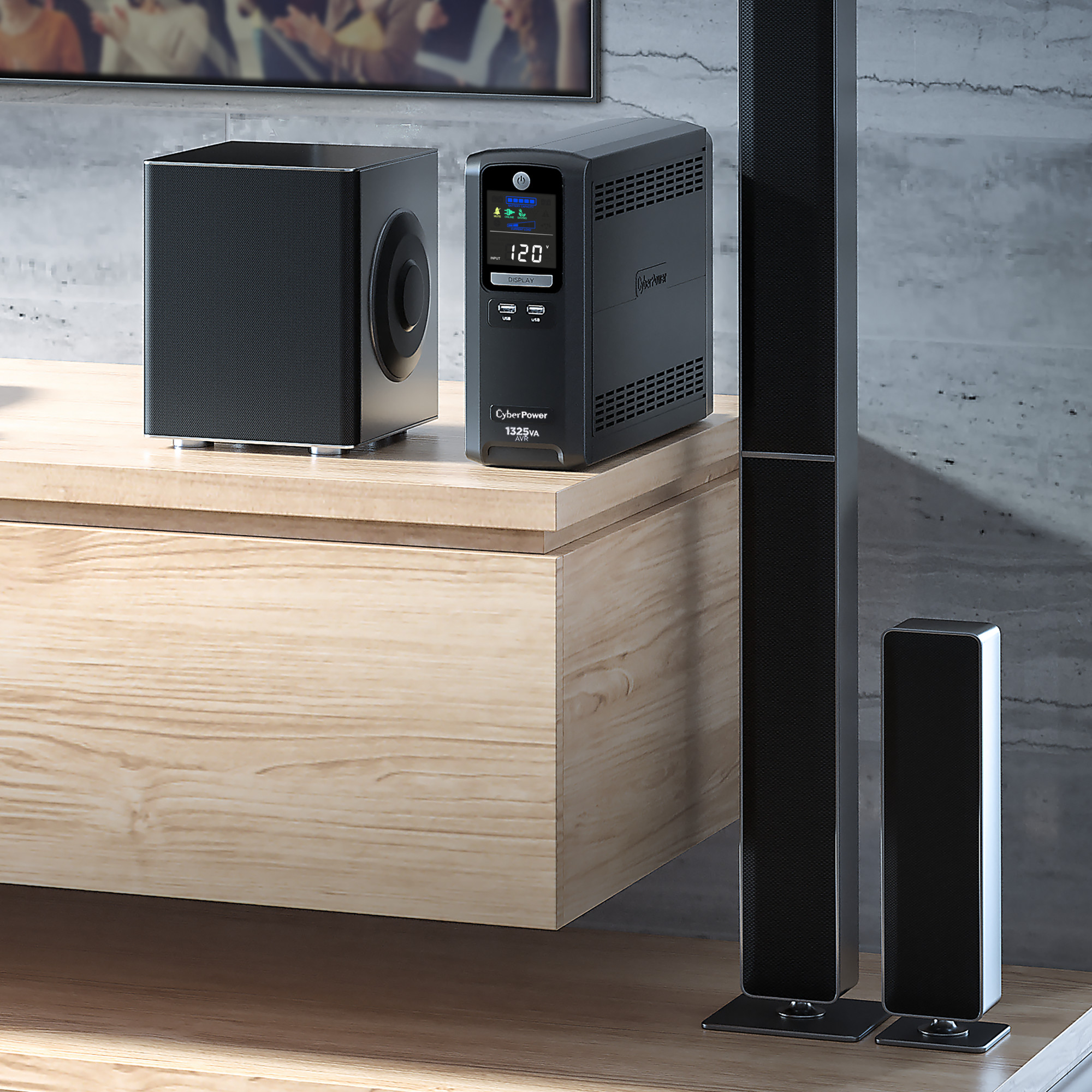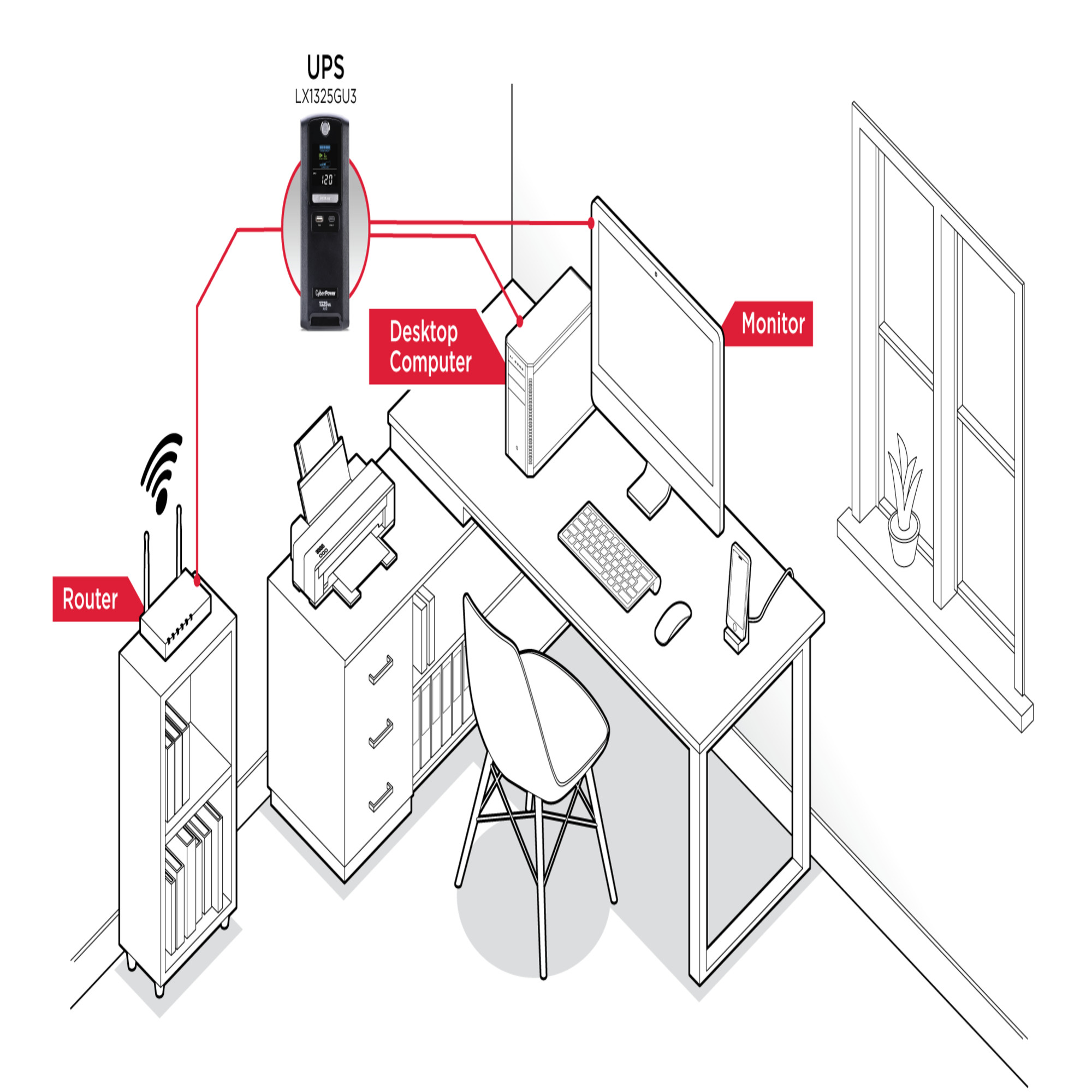 A mini-tower UPS with line interactive topology, the CyberPower LX1325GU3 provides battery backup (using simulated sine wave output) and surge protection for desktop computers, workstations, networking equipment, smart home devices, and home entertainment systems.