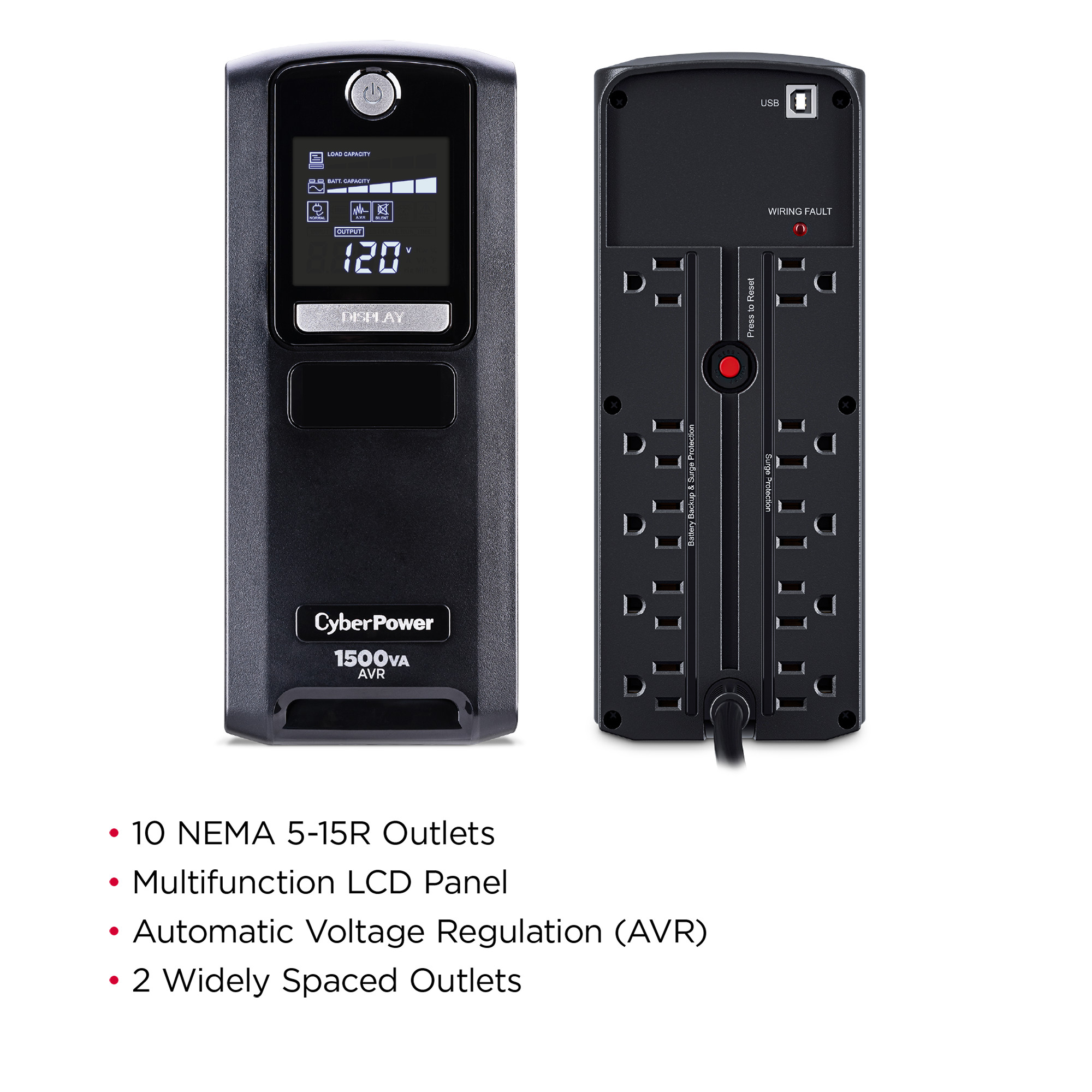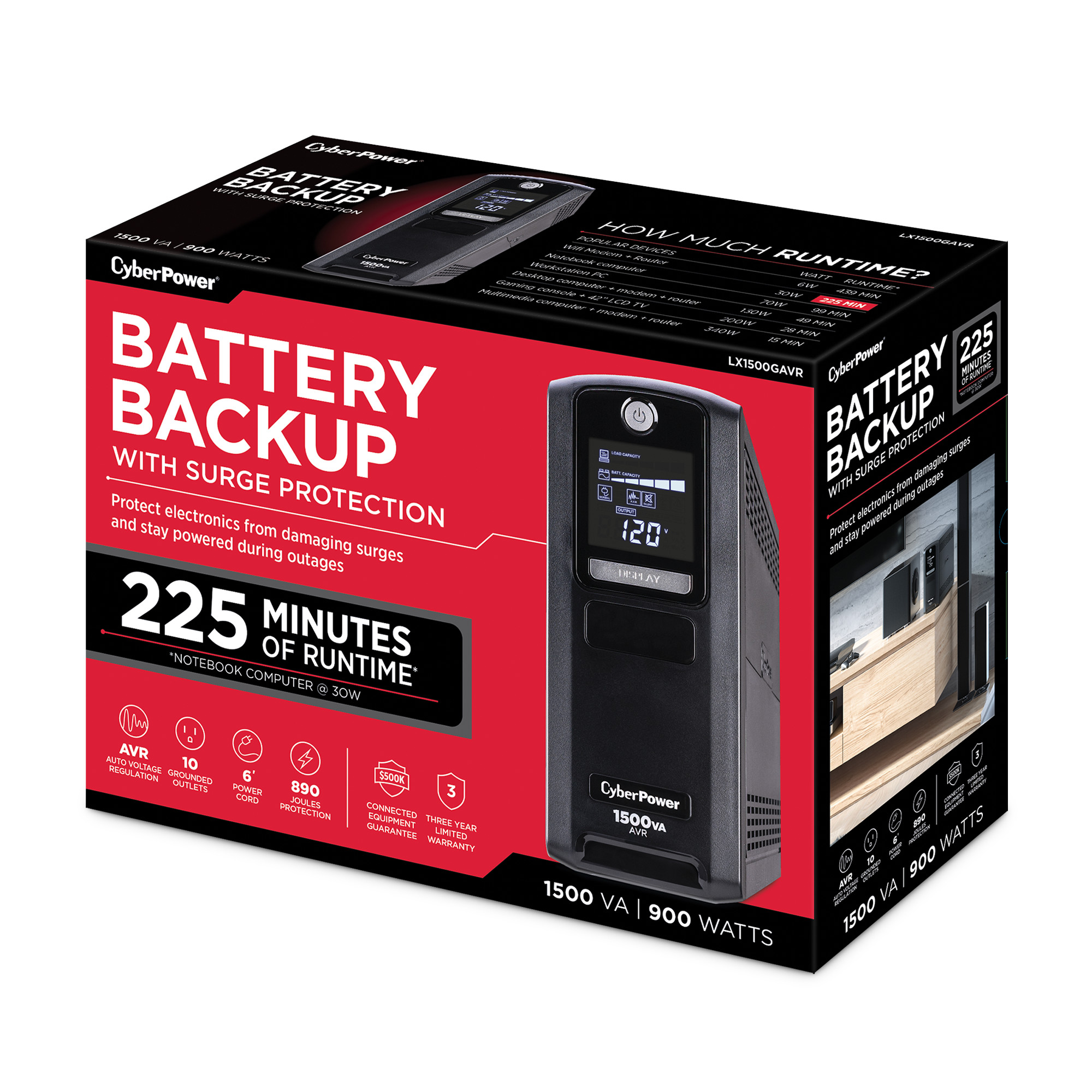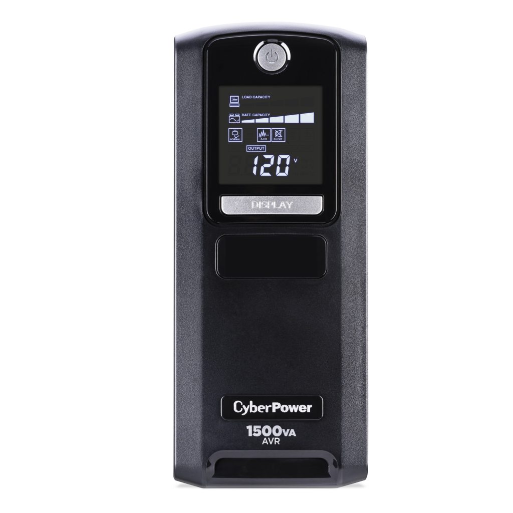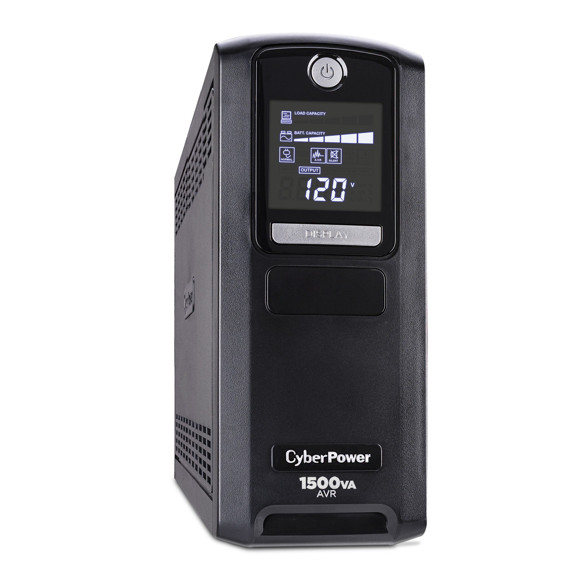 The CyberPower LX1500GAVR mini-tower UPS provides battery backup and surge protection for common home and office electronics. The LX1500GAVR is black and features an LCD control panel to quickly confirm operating status and alerts at-a-glance. Additional features include 10 grounded outlets (5 are surge protected only, 5 provide battery backup and surge protection), a 6 foot power cord, and it comes with a three-year limited warranty (including coverage of batteries) and a $500,000 Connected Equipment Guarantee.